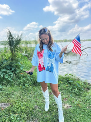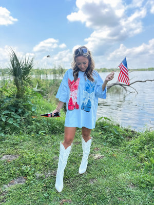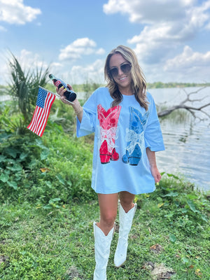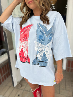 Be the sweetest thing in the room with our American Sweetheart Oversized Top. With a playful graphic print and adorable bow laser cut lace embroidery details, you'll be sure to turn heads. Stay stylish and comfortable in this oversized top that's perfect for any occasion.