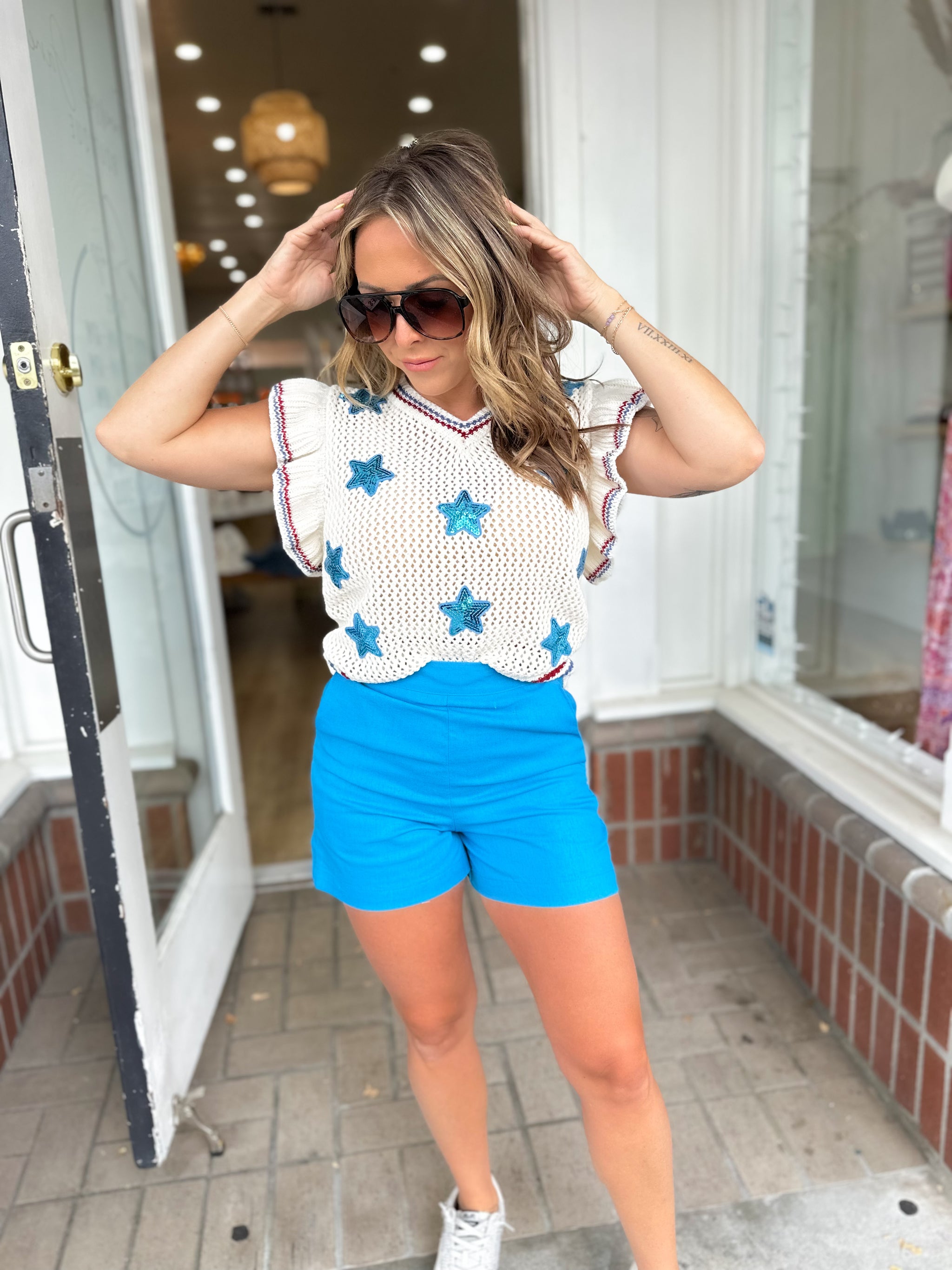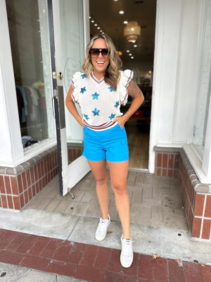 Add some sparkle to your wardrobe with our Seeing Stars Sequin Patch Knit Top! This knit sweater vest top features whimsical flutter cap sleeves and fun sequin star patches all over the front. Stand out from the crowd and shine like a star in this playful and stylish top!