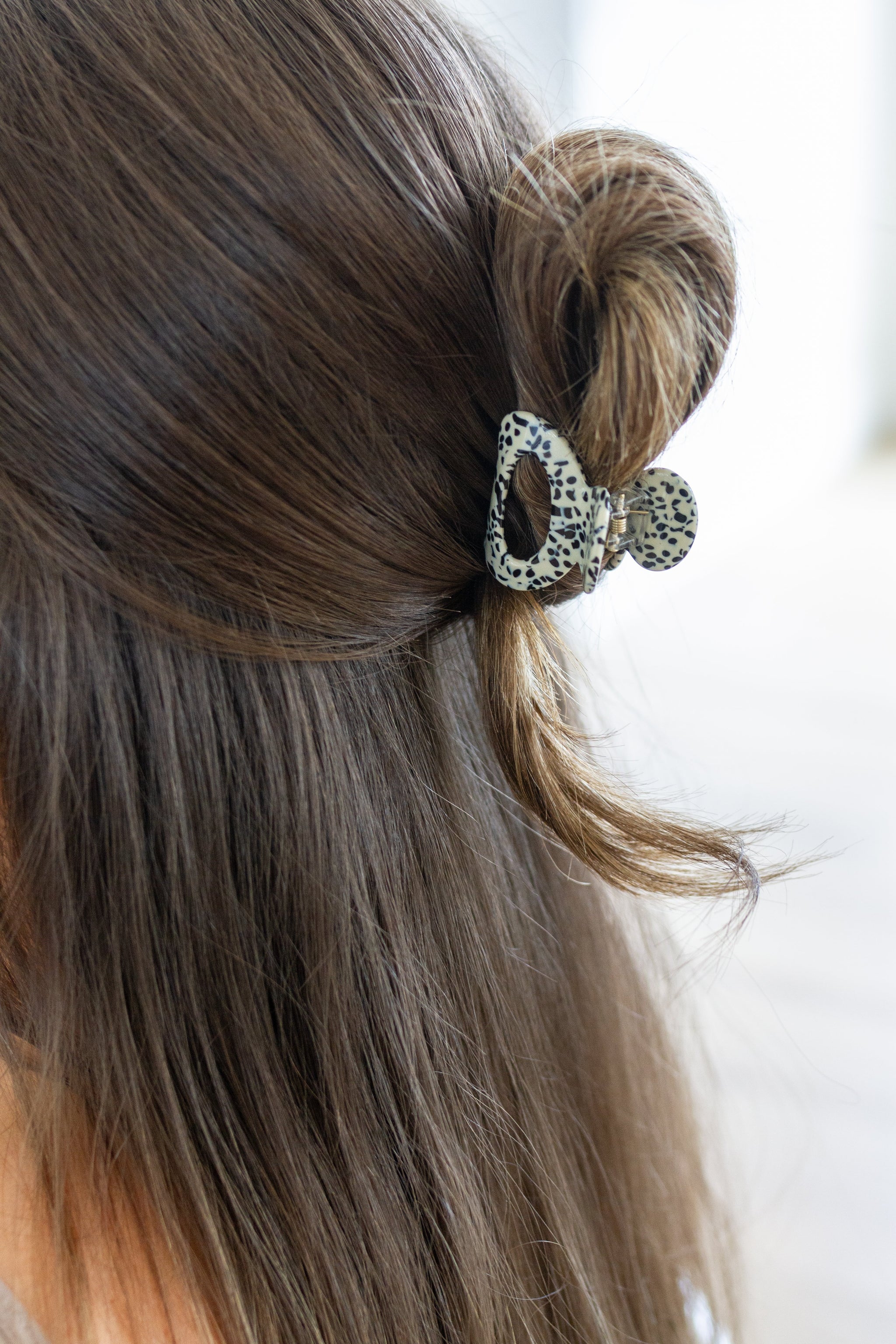 The Happy Daydreams Round Claw Clips Set of 2 is an adorable hollow round claw clip set in shades of black and white speckled and marbled purple.