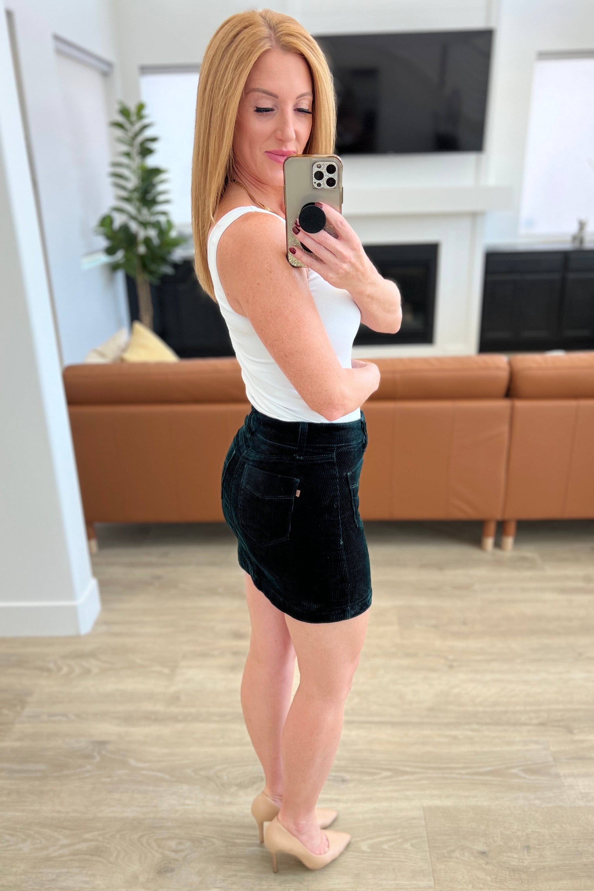 Create a timeless look with the Melinda Corduroy Patch Pocket Skirt from Judy Blue. Crafted with a classic tailored fit from mid weight corduroy, this dark emerald skirt features stylish patch pockets and a flattering silhouette. Look timeless and feel amazing!