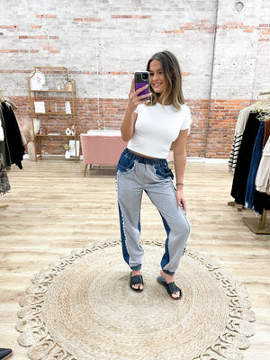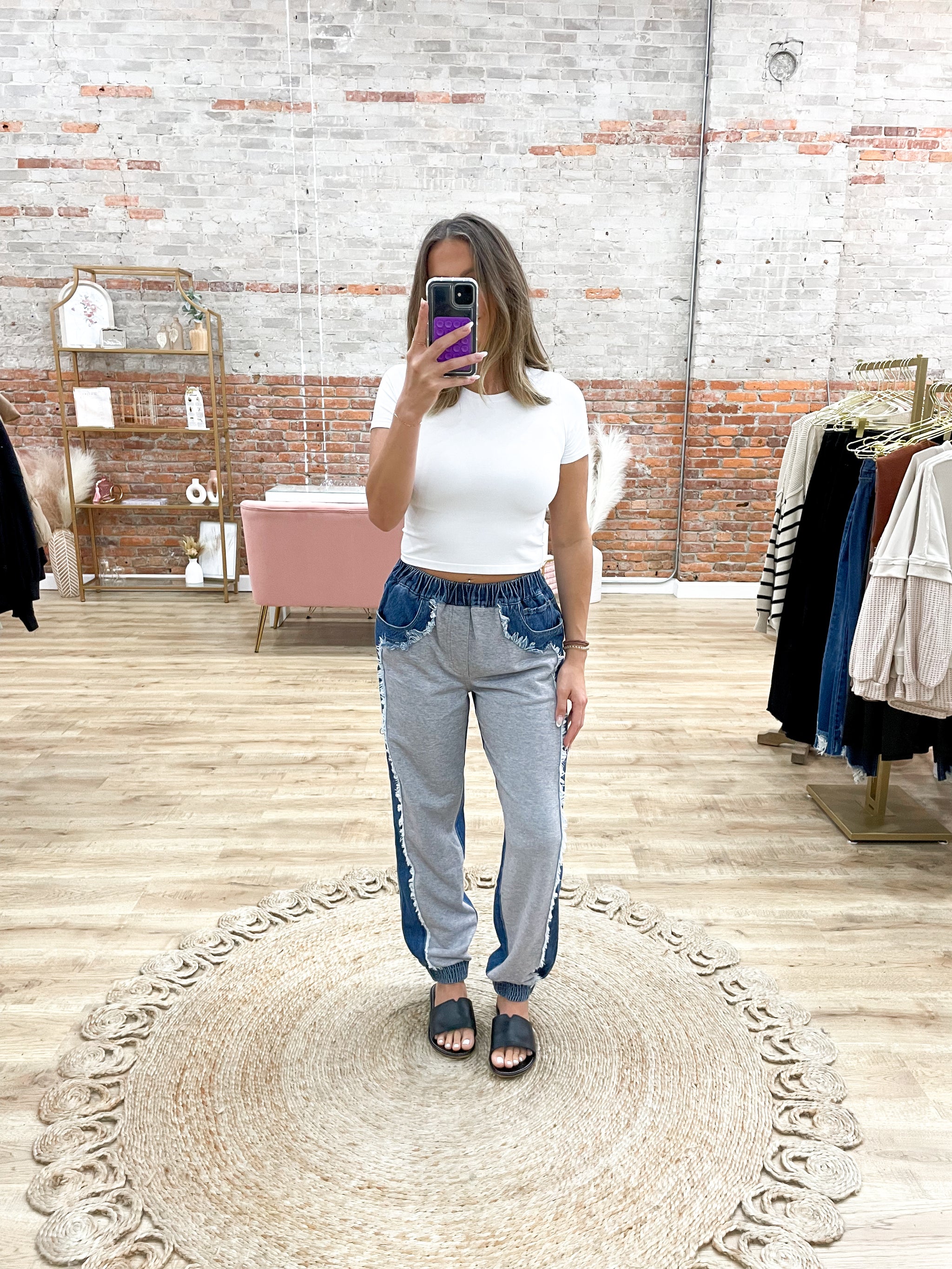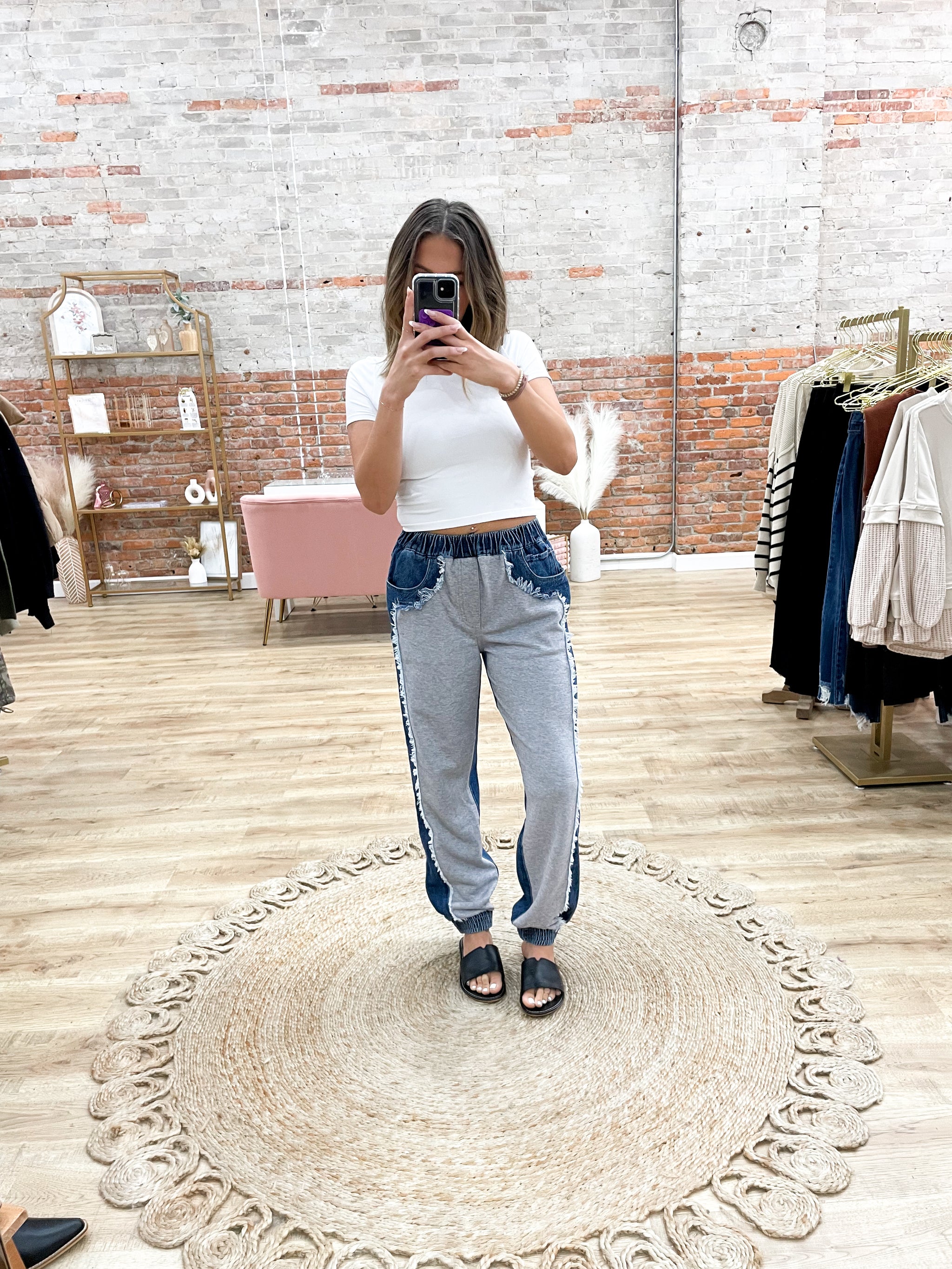 These joggers are the perfect mix of cozy and cute! With a distressed denim design and a terry block, they're both stylish and comfortable. The elasticized waist and frayed hem add a touch of uniqueness to this must-have piece. Stay on-trend with these frayed contrast denim joggers.