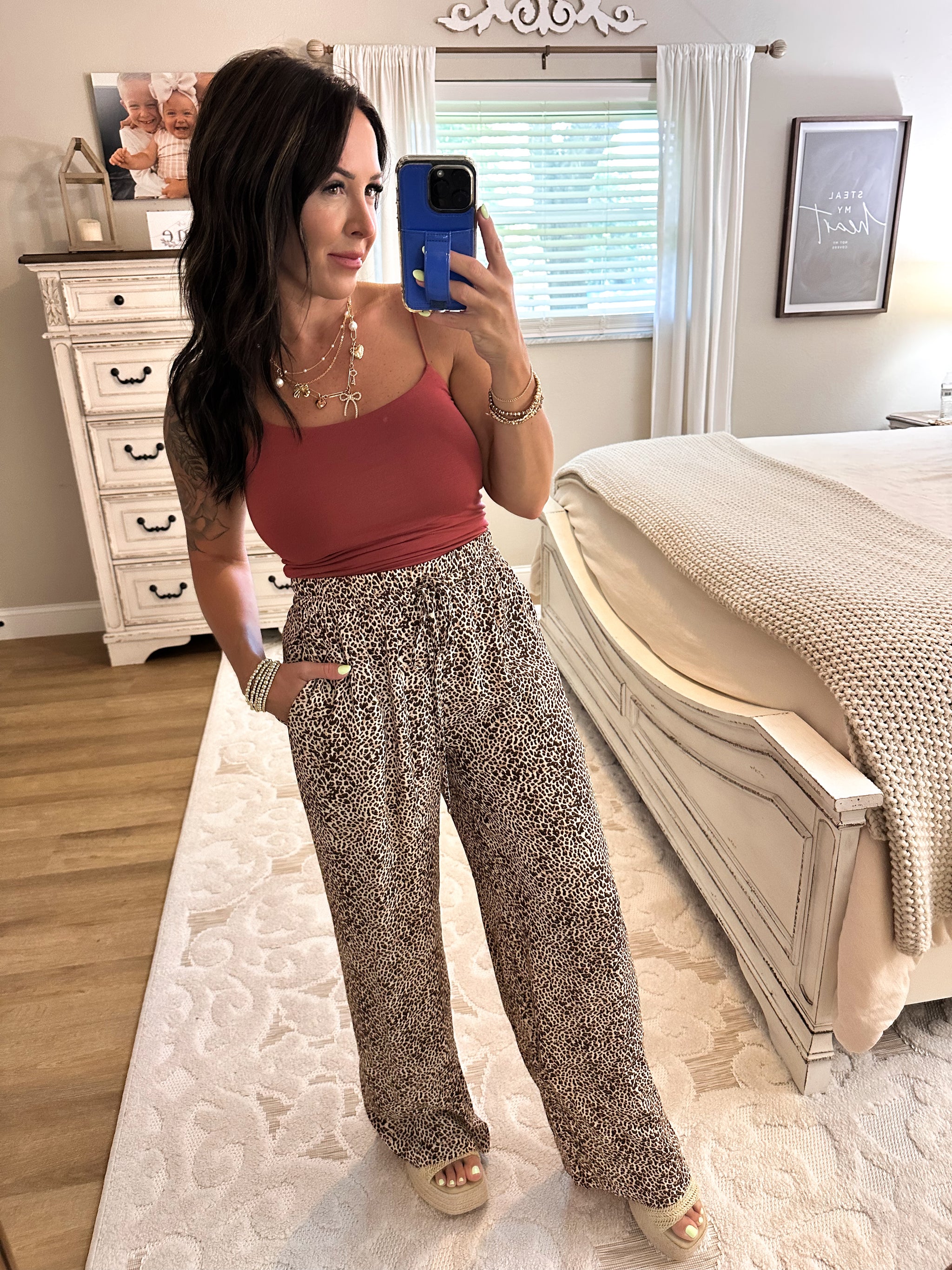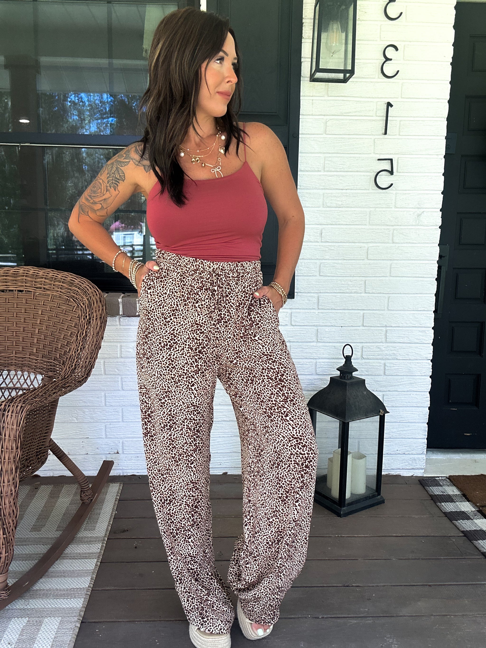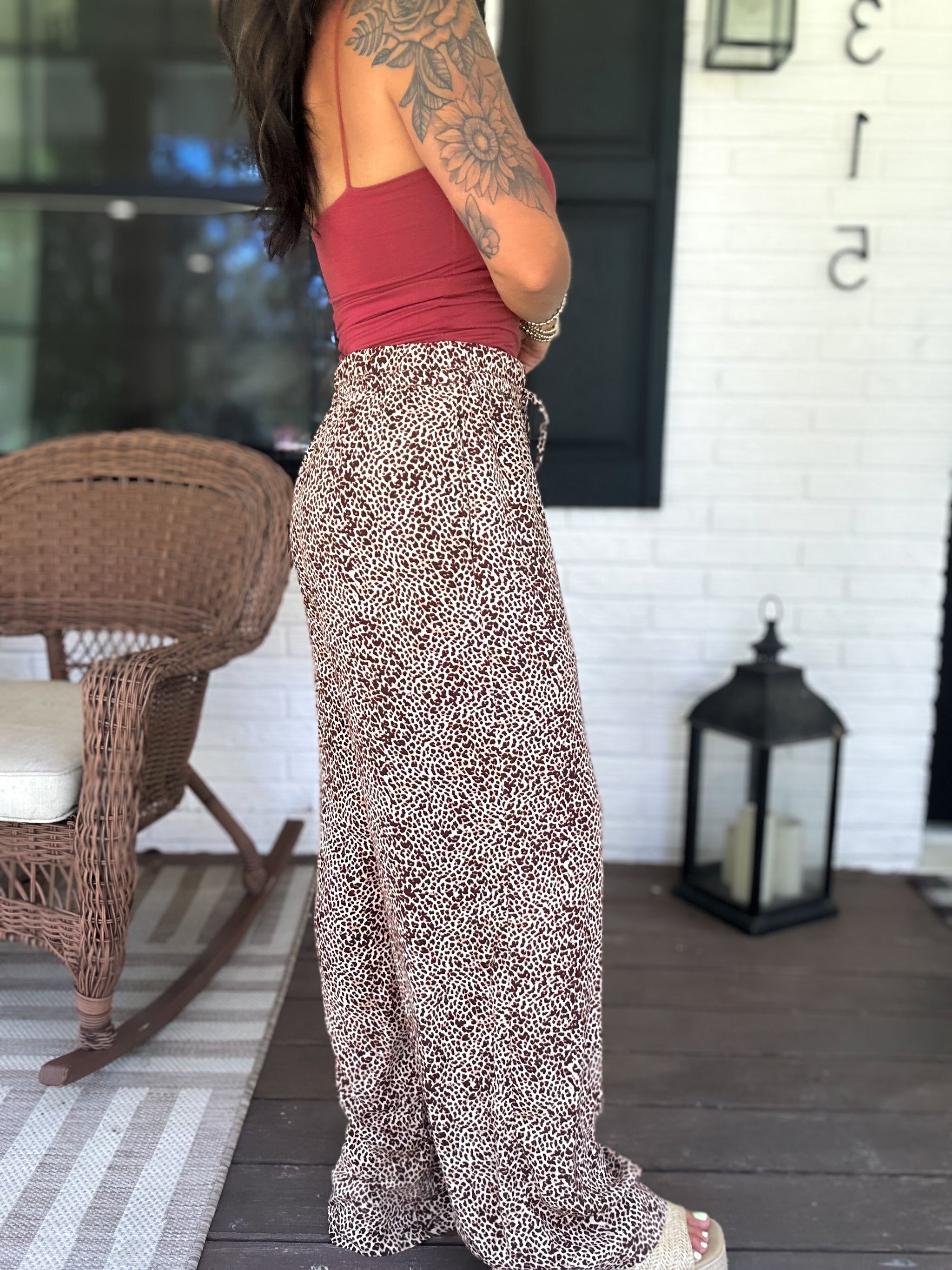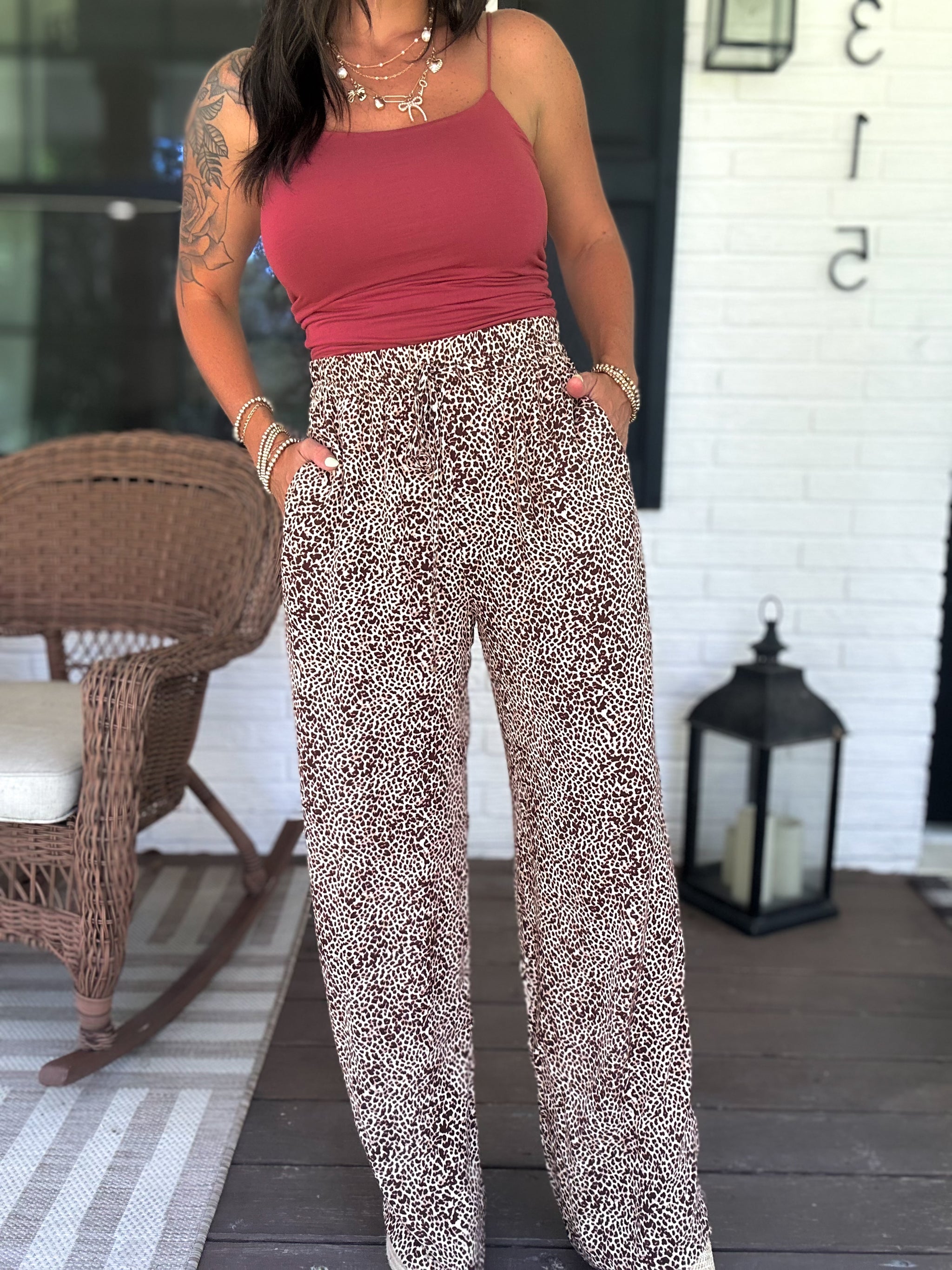 – Sold OutStep out in style with these Feelin' Fancy Leopard Print Wide Leg Pants. Featuring a high-rise, elastic waistband and a relaxed, flowy fit, they offer all-day comfort with a playful edge. Lightweight fabric and handy pockets make them perfect for lounging or turning heads on the go. Embrace effortless chic with every step!