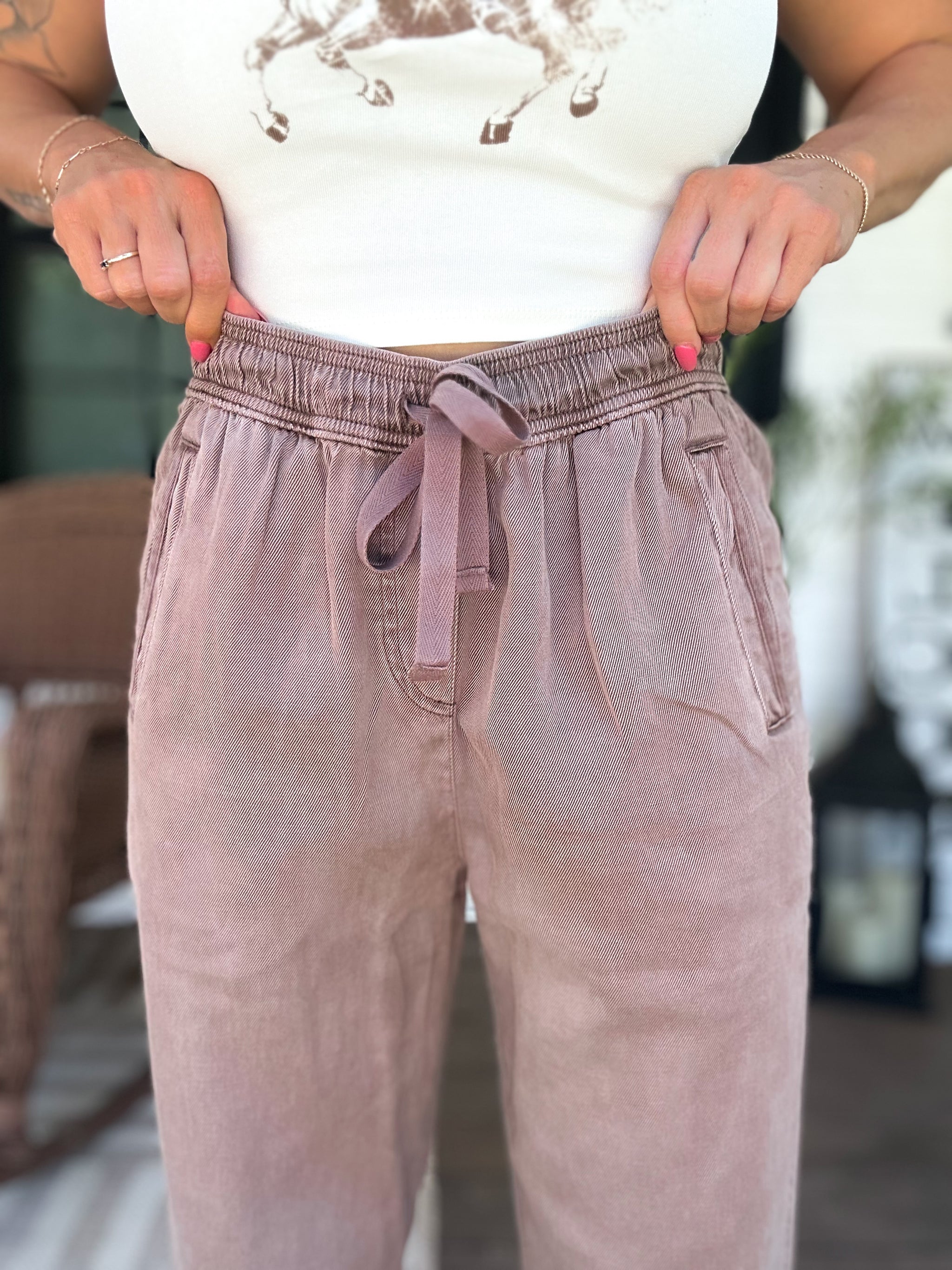 Slip into the Jaden Tapered Pants in Cocoa for a perfect blend of comfort and style. Made from a soft Tencel blend, these pants feature a cozy drawstring elastic waist and handy pockets, making them your go-to for laid-back days or casual outings. Their tapered fit adds a touch of chic while keeping things effortlessly fun.
