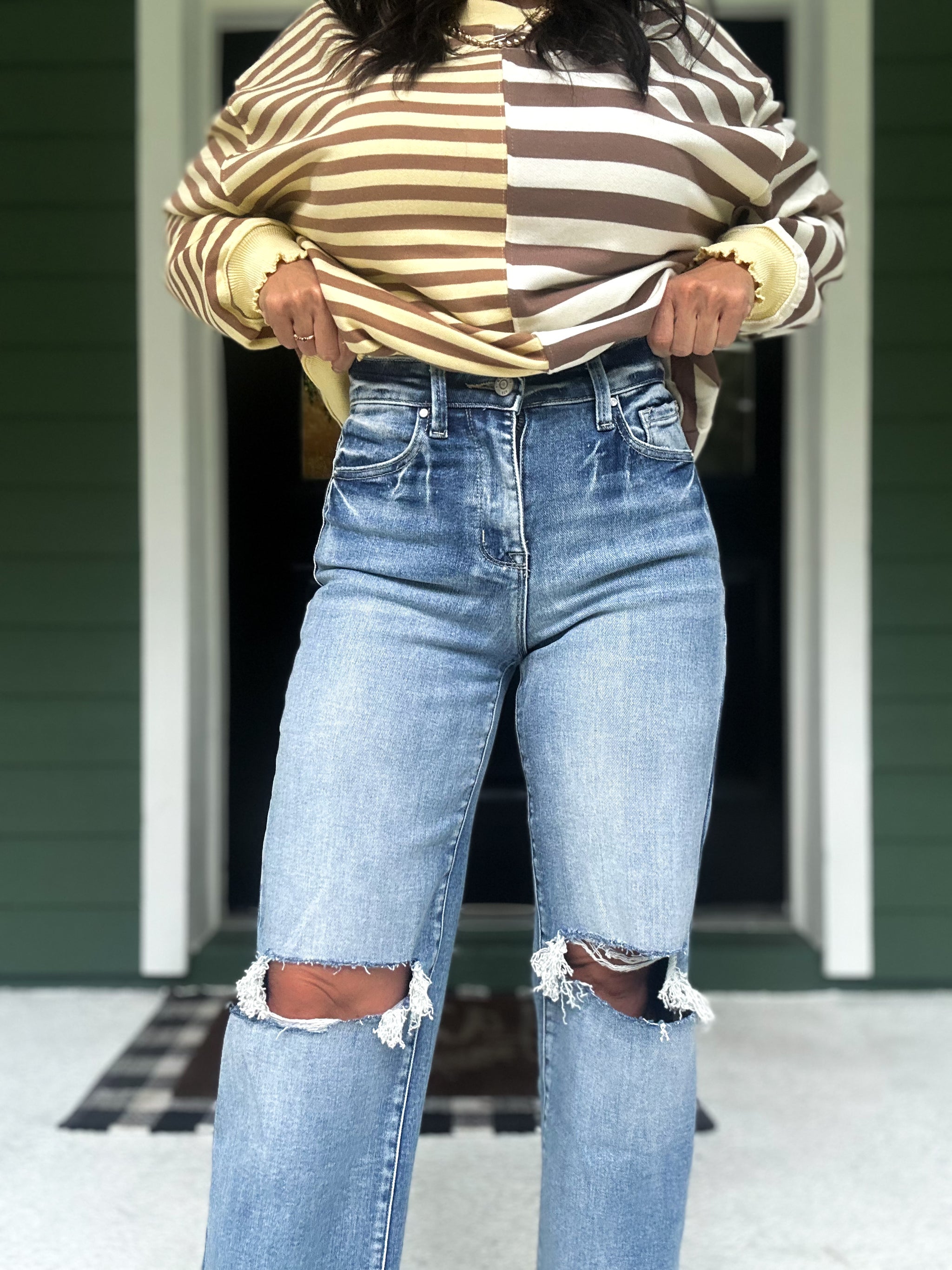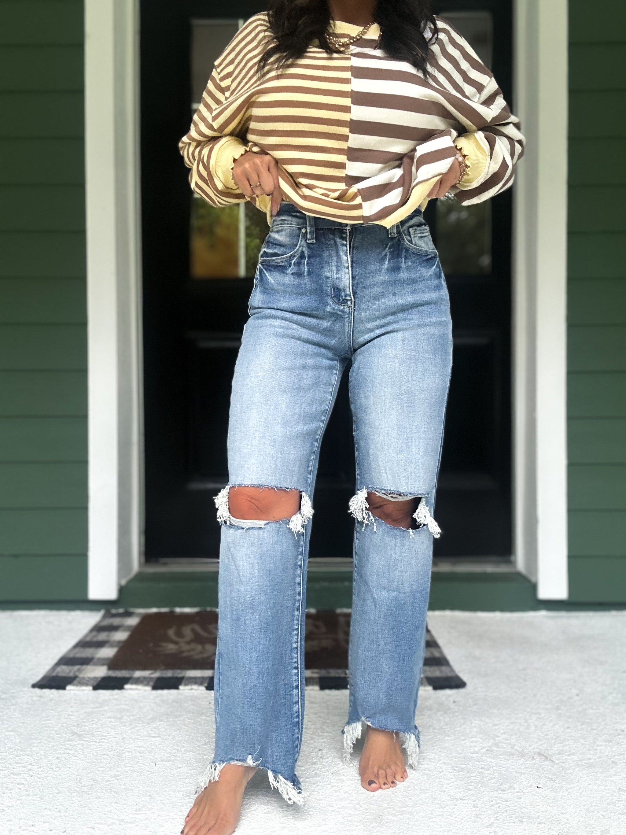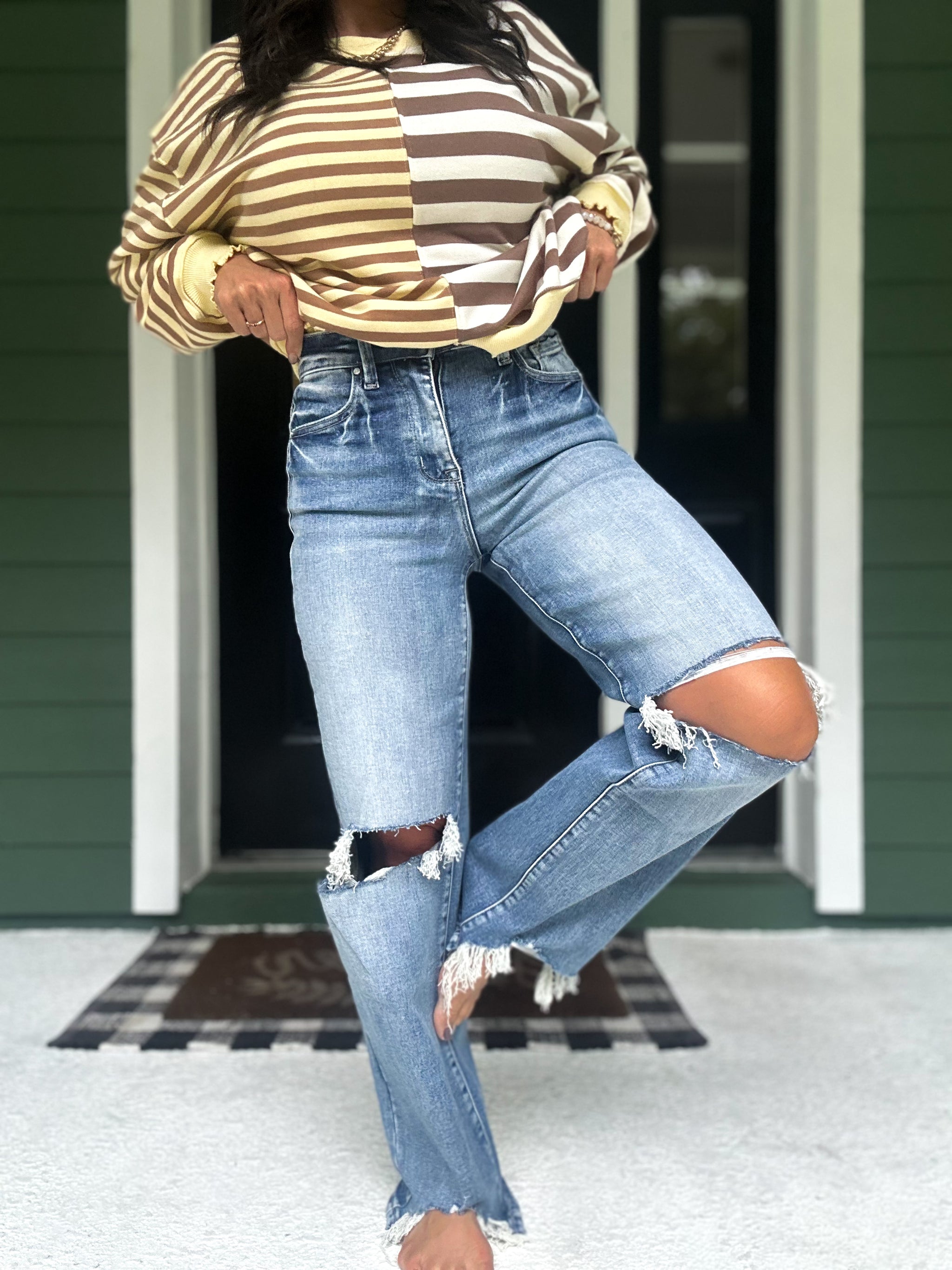 – Sold OutHIGH RISE STRETCH SLIM WIDE LEG W/ DESTROYED HEM - 10.5" Rise, 30" Inseam, Modeled in size 3/25 - High-rise, Slim wide leg jeans - Leg opening : 18" - Destroyed hem - Knee destroyed hole - Button closure and zip fly - 5-pocket styling