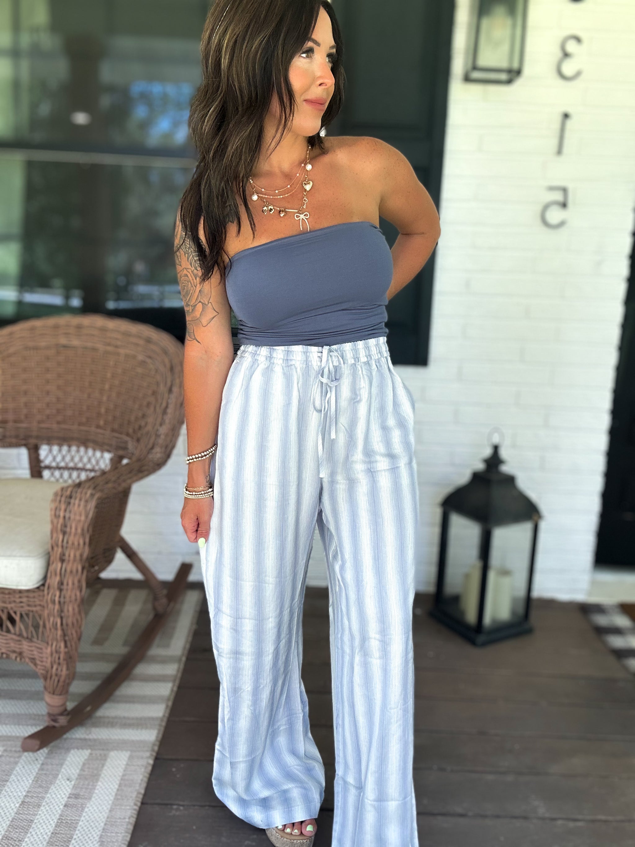 Step into effortless style with these Staying Alive Striped Linen Pants. Featuring a breezy linen blend and playful ombre stripes, their wide-leg cut and drawstring elastic waist promise comfort and a flattering fit. Perfect for lounging or lively days out, these pants bring a fun twist to your wardrobe essentials.