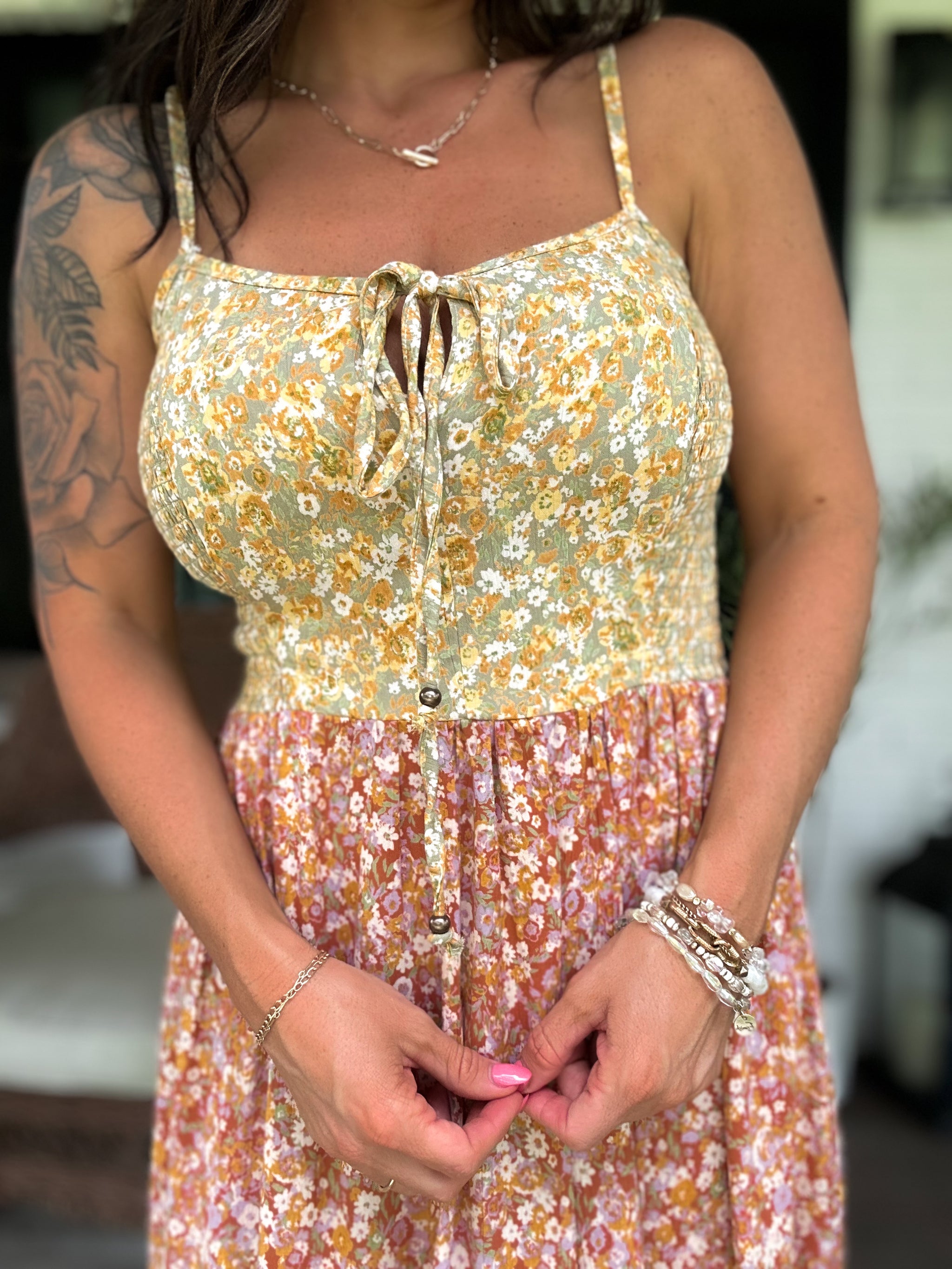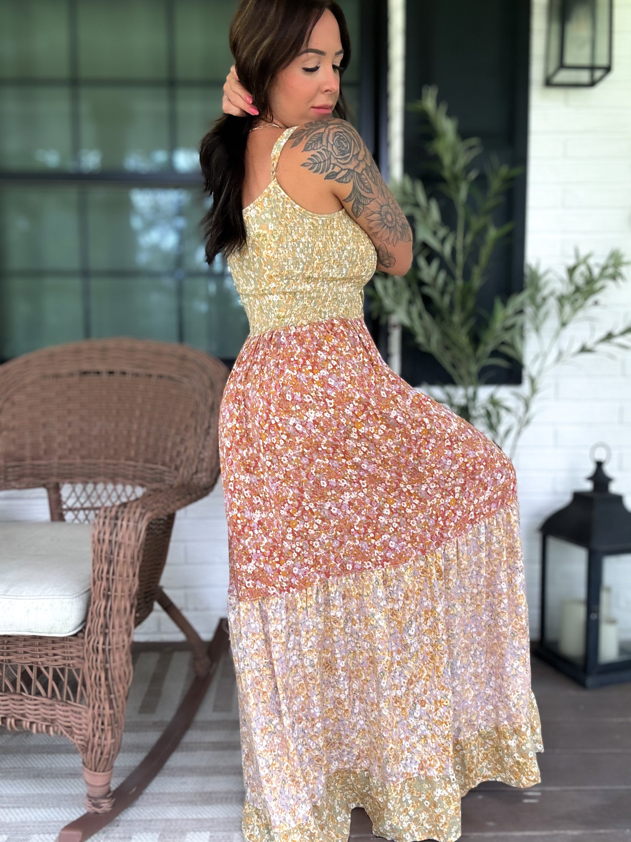 Embrace effortless charm in the Ive Patchwork Maxi Dress. This playful maxi features a vibrant patchwork design and a flirty front tie that adds a touch of whimsy to your look. Flowing with every step, it’s perfect for sunny days and breezy evenings alike. Stylish, comfortable, and uniquely you.