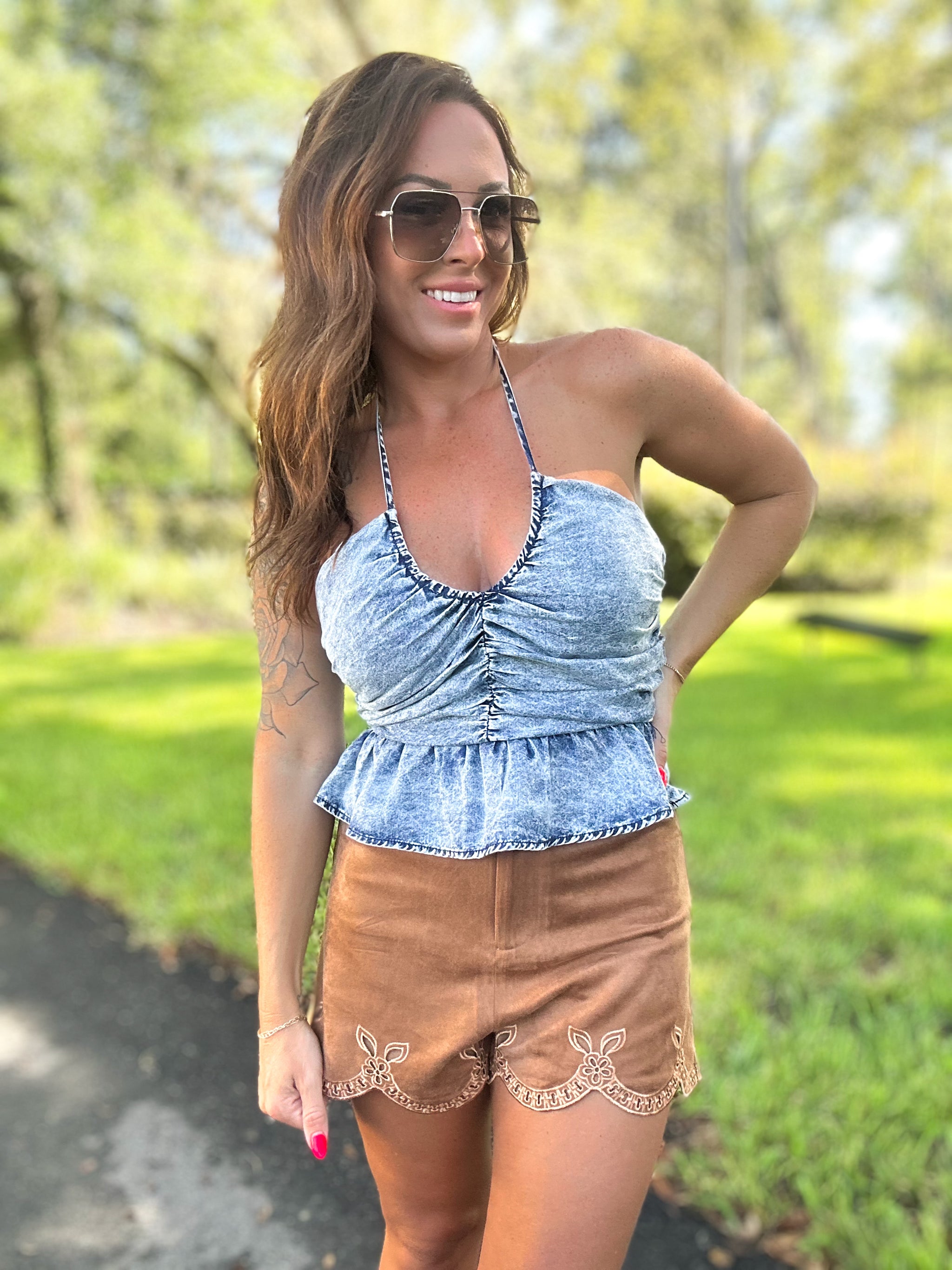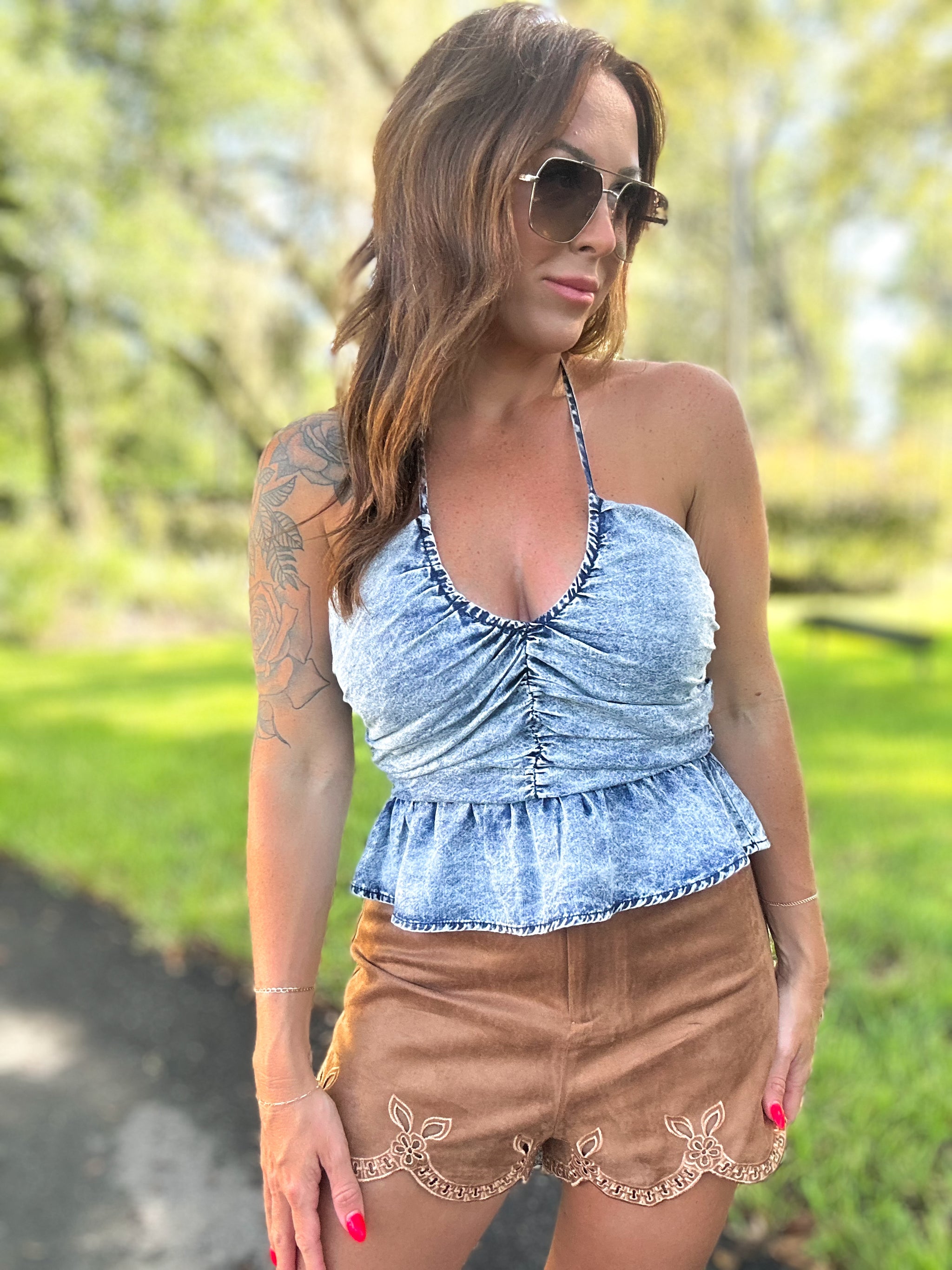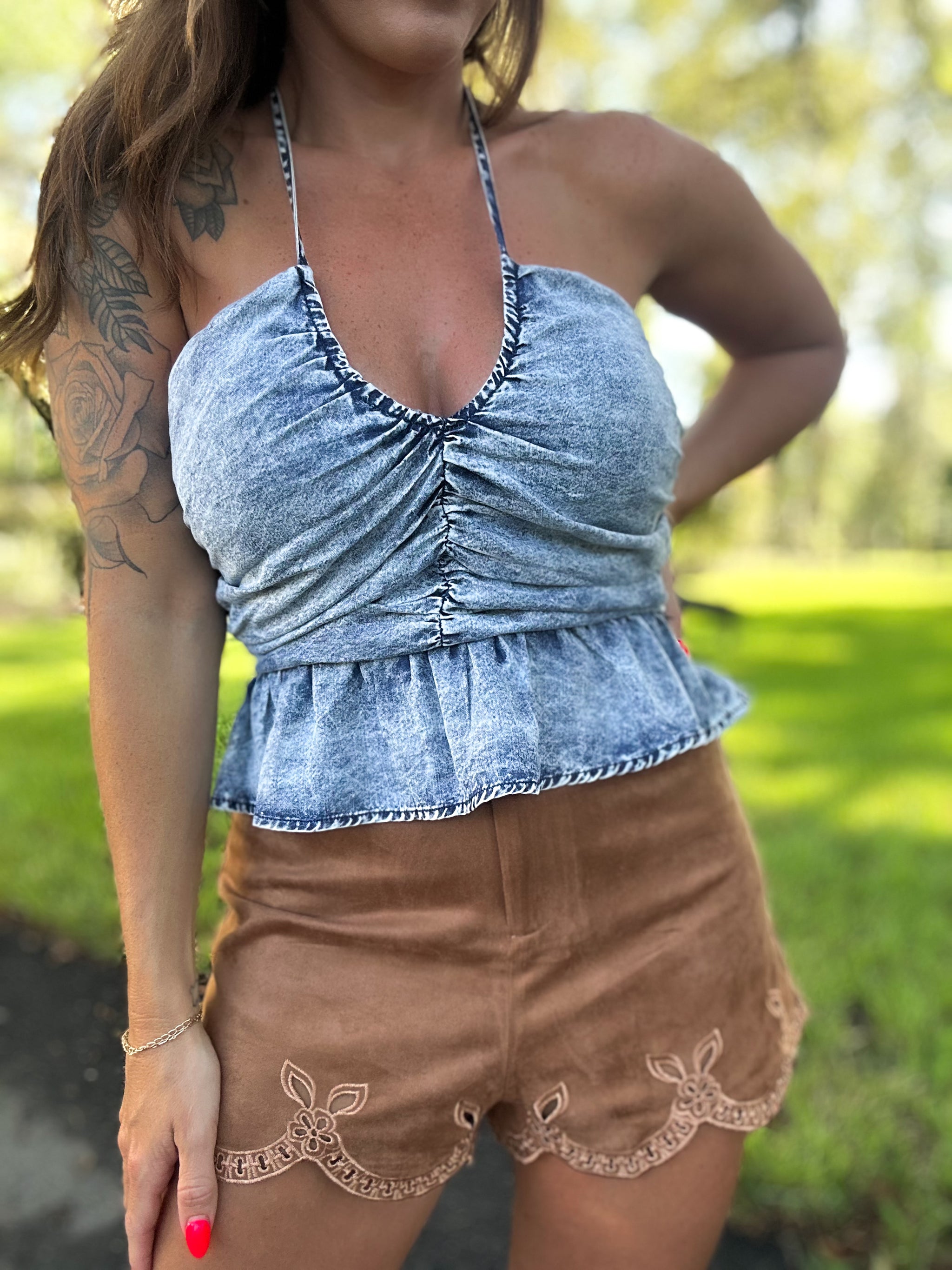 Unleash your inner denim diva with our Nothin' Left Washed Denim Halter Top! This playful peplum cutie features a ruched bodice, adjustable neck tie for that perfect fit, and a handy back zipper for easy on-off action. Each top rocks its own unique acid wash pattern – because being one-of-a-kind is always in style!