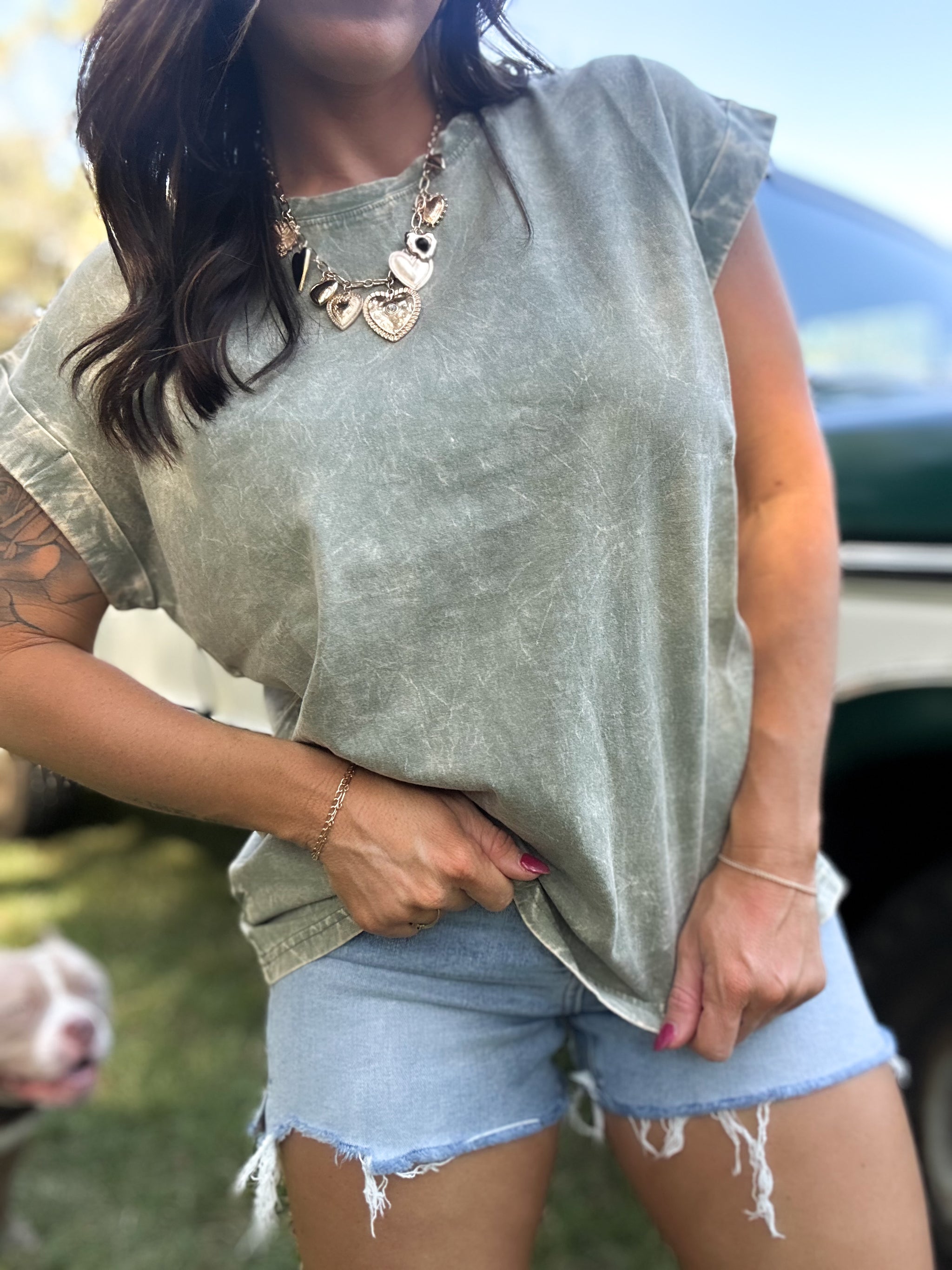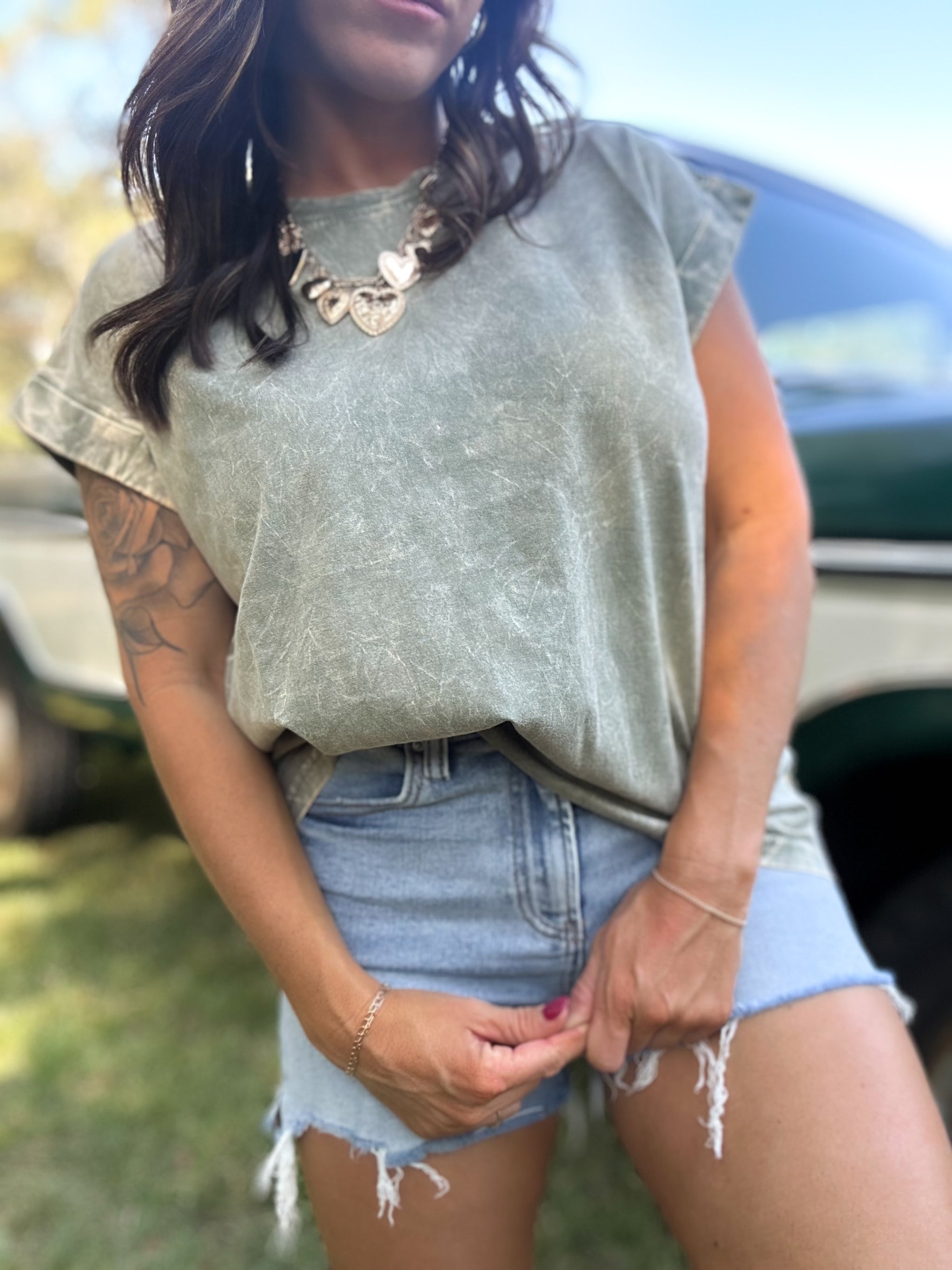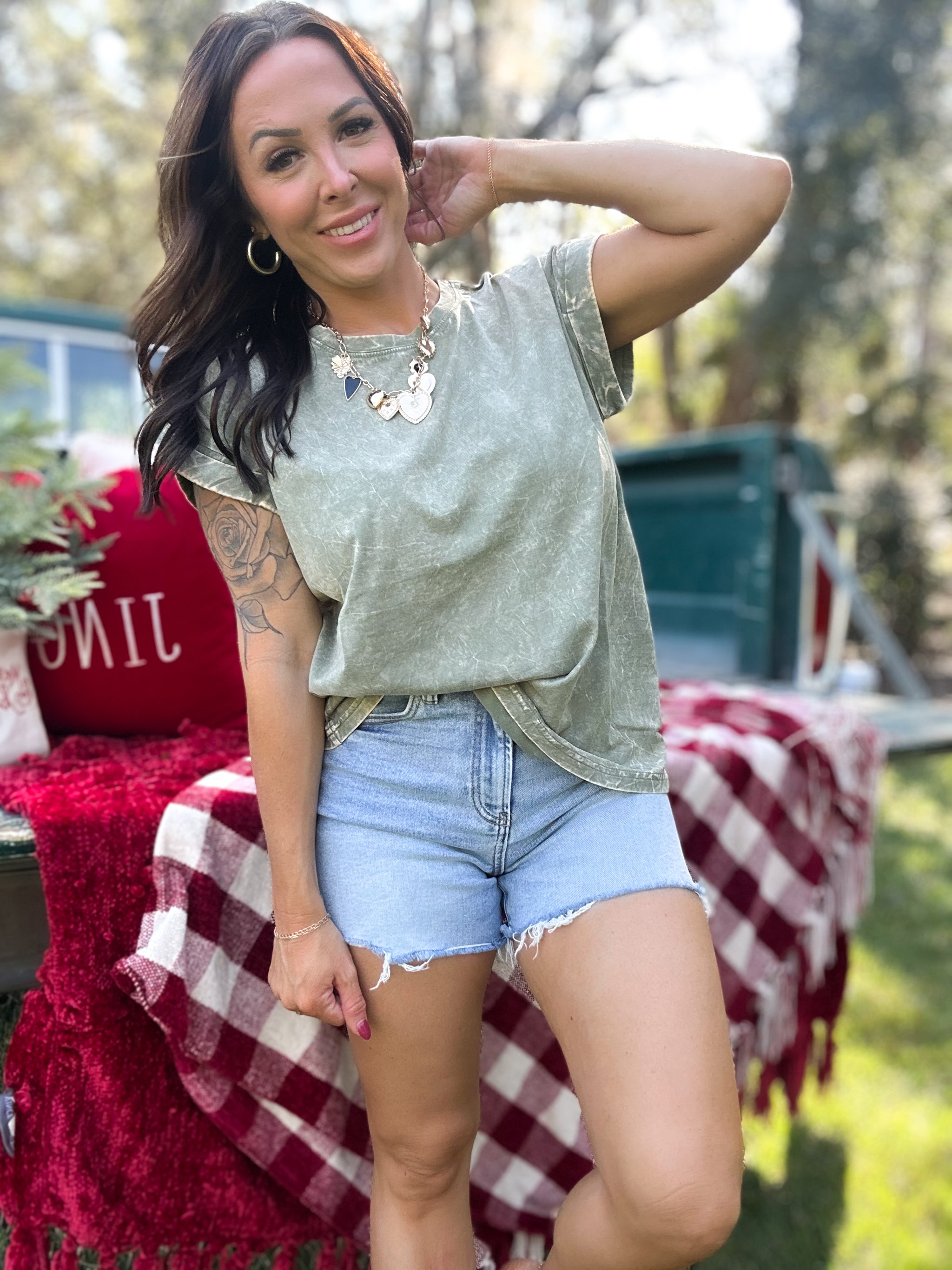 Throw on the Dani Acid Washed Tee and get ready to turn heads. This playful piece features a trendy acid wash finish paired with crinkled fabric for that effortlessly cool, lived-in vibe. The cuffed sleeves add a touch of vintage charm while keeping things modern and fun. Perfect for casual days when you want to look put-together without trying too hard. Grab this doorbuster deal before it's gone!