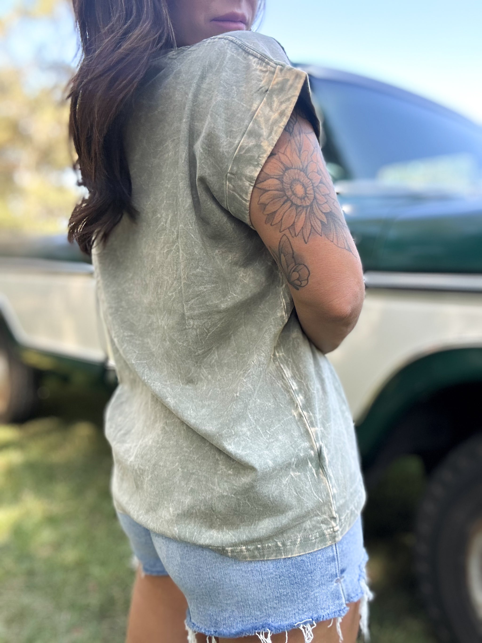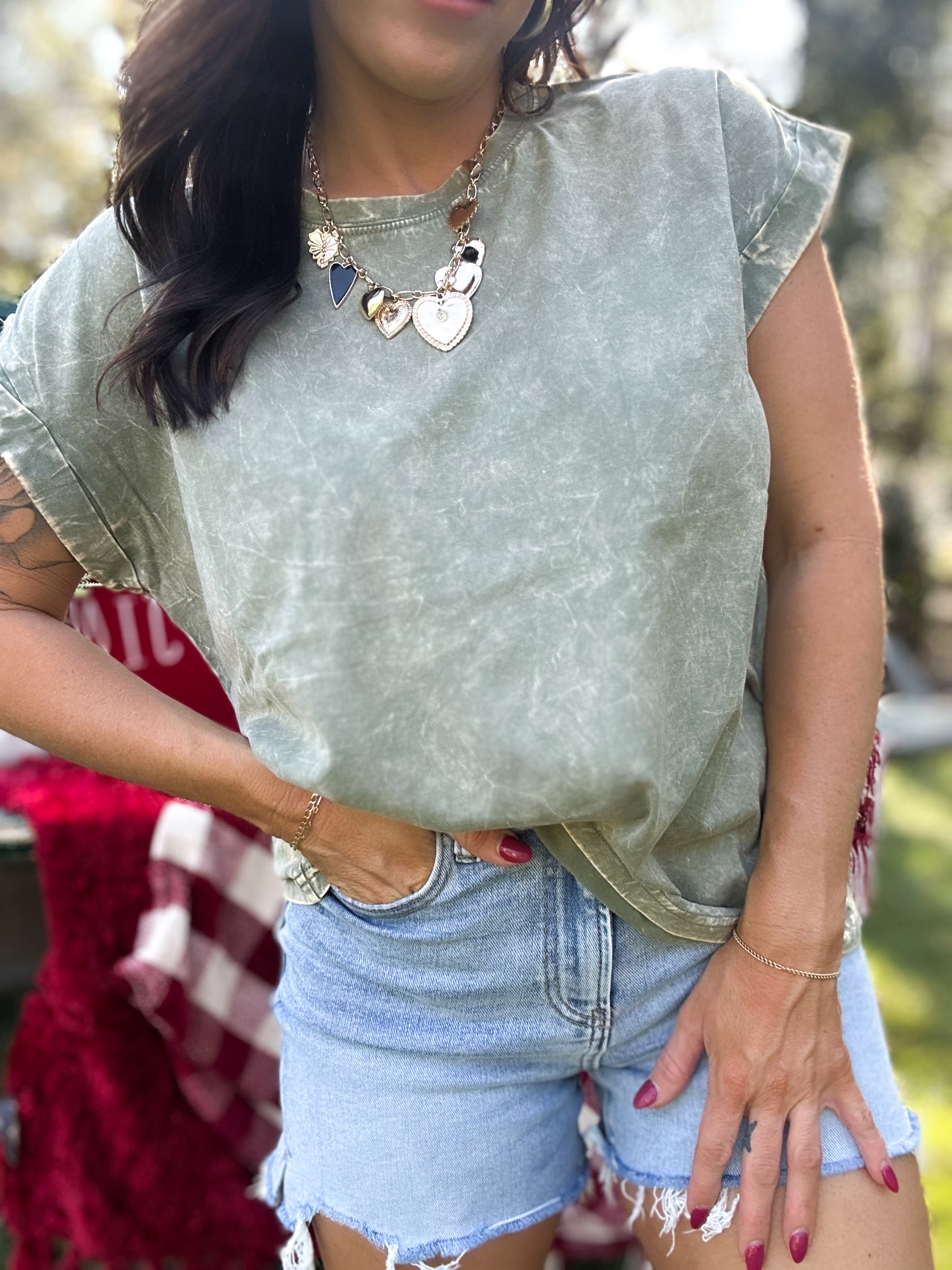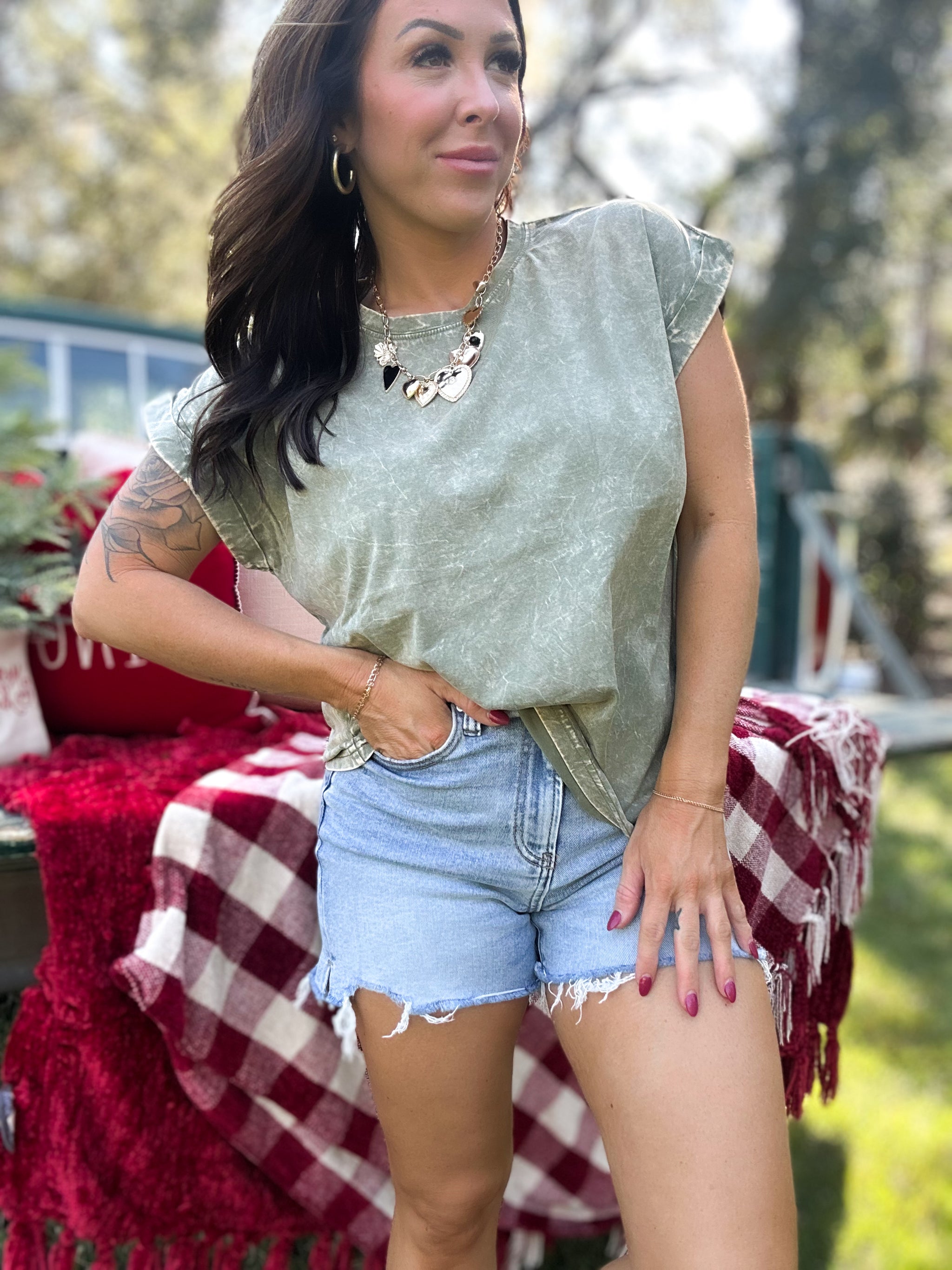 Throw on the Dani Acid Washed Tee and get ready to turn heads. This playful piece features a trendy acid wash finish paired with crinkled fabric for that effortlessly cool, lived-in vibe. The cuffed sleeves add a touch of vintage charm while keeping things modern and fun. Perfect for casual days when you want to look put-together without trying too hard. Grab this doorbuster deal before it's gone!