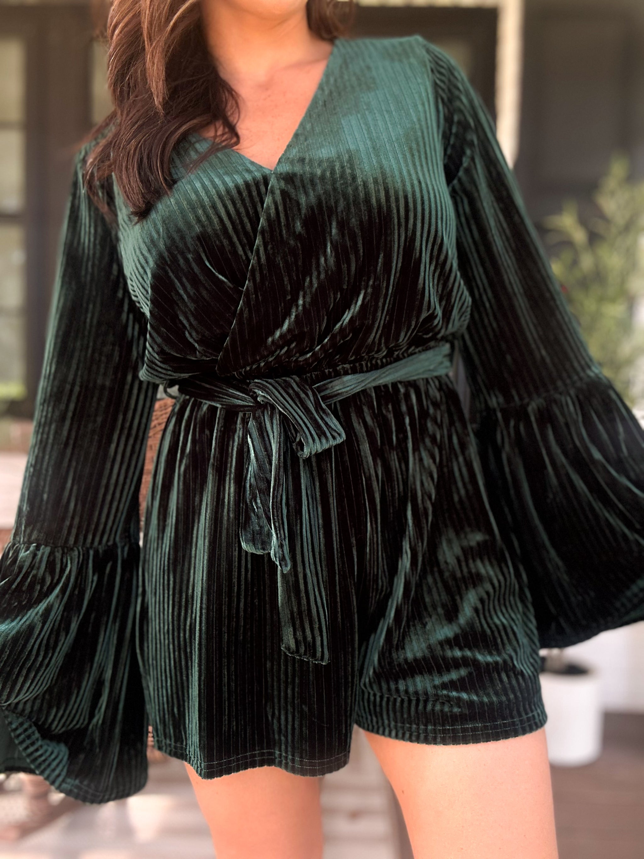 Get ready to be the life of the party in our velvet romper! The ribbed material adds some texture to the soft velvet, while the bell sleeves and elastic drawstring waist provide a comfortable and stylish fit. Whether it's a holiday party or a night out with friends, this romper will have you looking and feeling your best. Cheers!