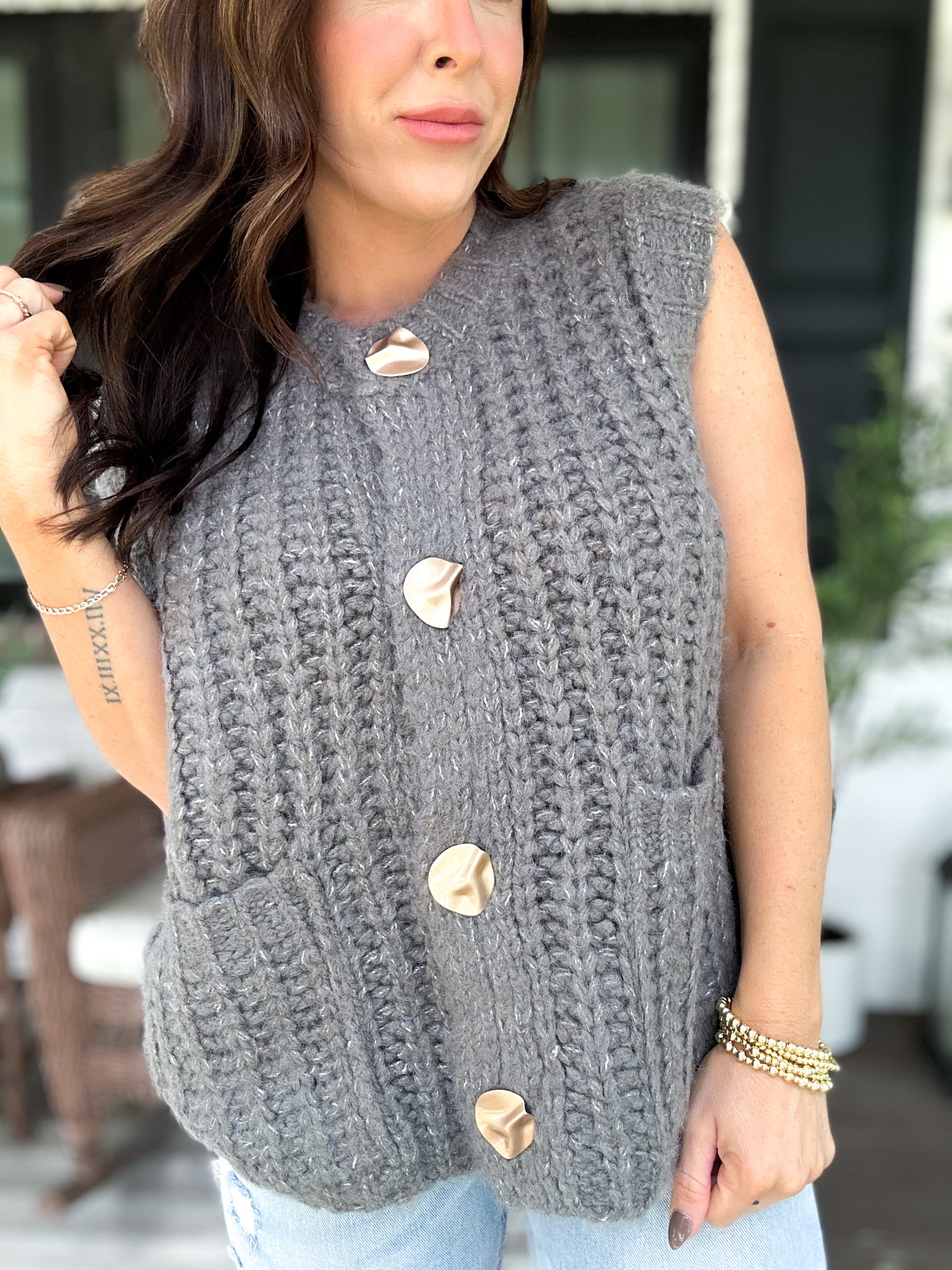 Add a touch of charm to your wardrobe with the Kailyn Sweater Knit Vest. Featuring cozy knit fabric and eye-catching large gold buttons, this vest is perfect for layering and brightening up any outfit. Whether paired with a crisp shirt or your favorite tee, it brings fun and flair to your everyday style.