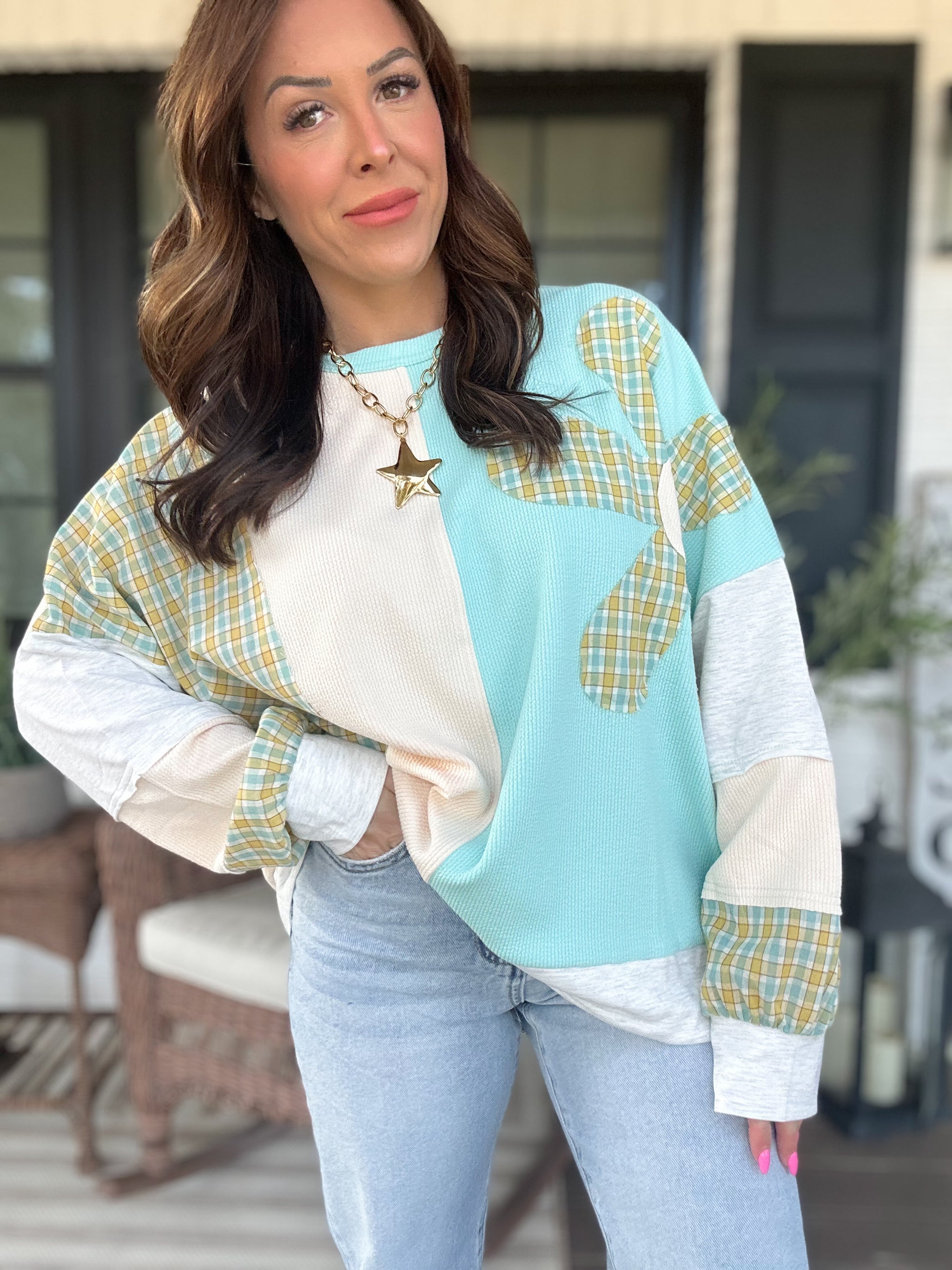 Cozy up in this charming Drue Flower Patch Long Sleeve Sweater, where playful style meets comfort. Featuring a classic round neckline and bubble sleeves, this piece brings effortless charm to your everyday wardrobe. The standout plaid woven flower patch adds a whimsical touch, while the textured knit fabric delivers warmth and visual interest. Perfect for layering or wearing solo, this sweater is your go-to for casual days with personality.