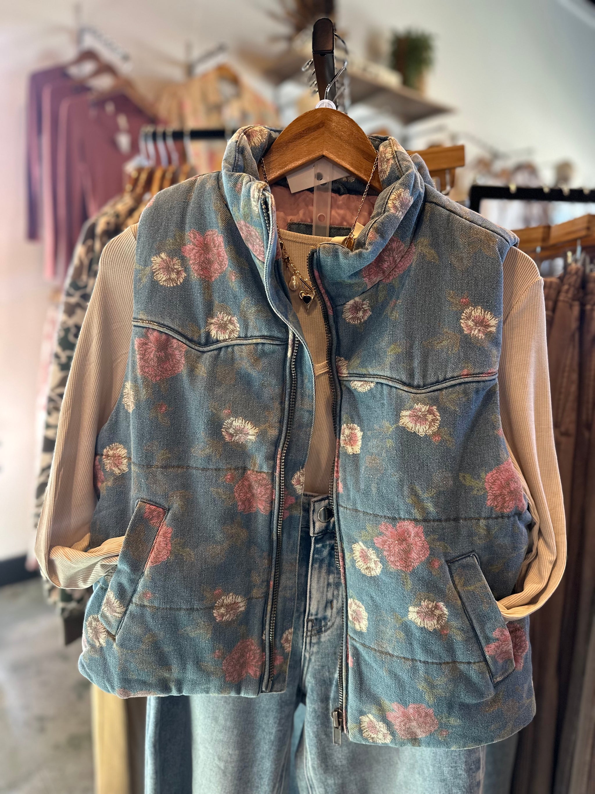 Layer up with botanical charm in this Love Blossom Floral Denim Vest. The mock neck adds cozy coverage while the zip-up front lets you adjust your vibe throughout the day. Delicate floral details bloom across classic denim, creating the perfect piece to dress up basics or add texture to your favorite outfits. Whether you're heading to brunch or running errands, this vest brings effortless style with a touch of garden-inspired whimsy.