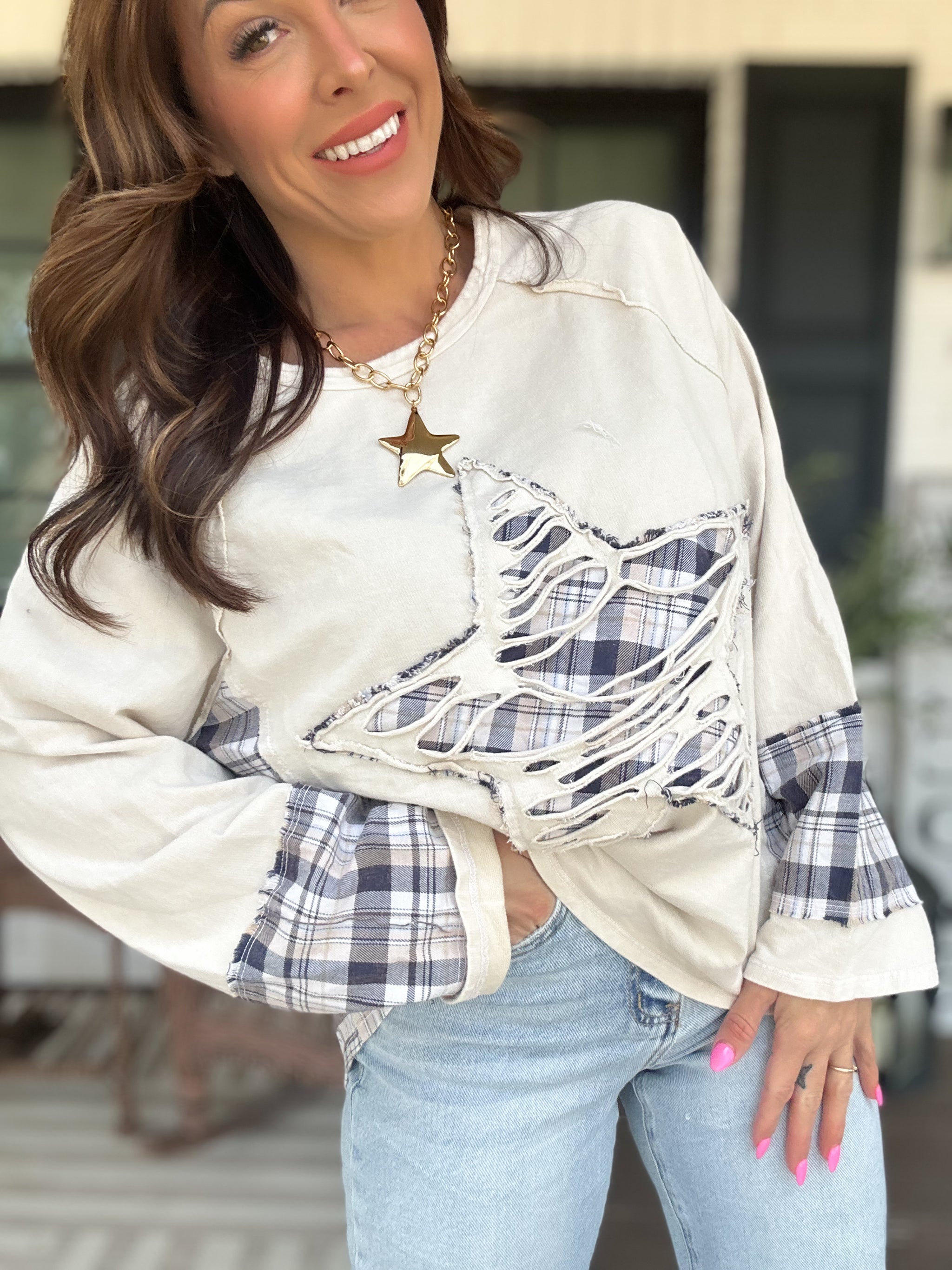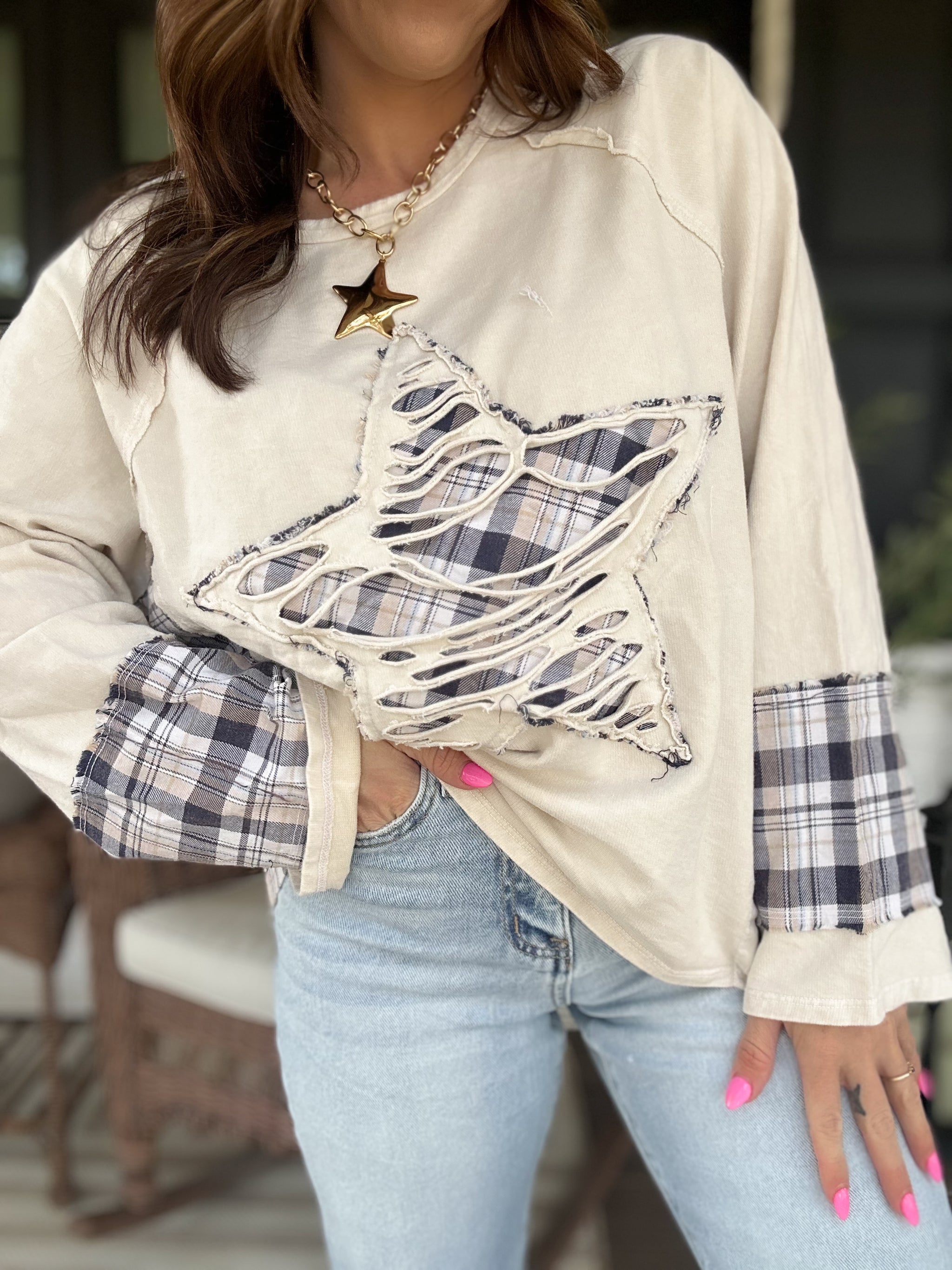 Molly Distressed Plaid Star Top Crafted with intentional distressing and classic plaid detailing, this top merges vintage-inspired aesthetics with contemporary edge. The star embellishment adds a distinctive focal point, while the distressed finish delivers authentic character and texture. Perfect for layering or wearing solo, this piece works across casual and styled occasions. The plaid pattern offers versatile pairing options with denim, skirts, or trousers, making it a reliable wardrobe staple for those who appreciate curated, statement-making basics.