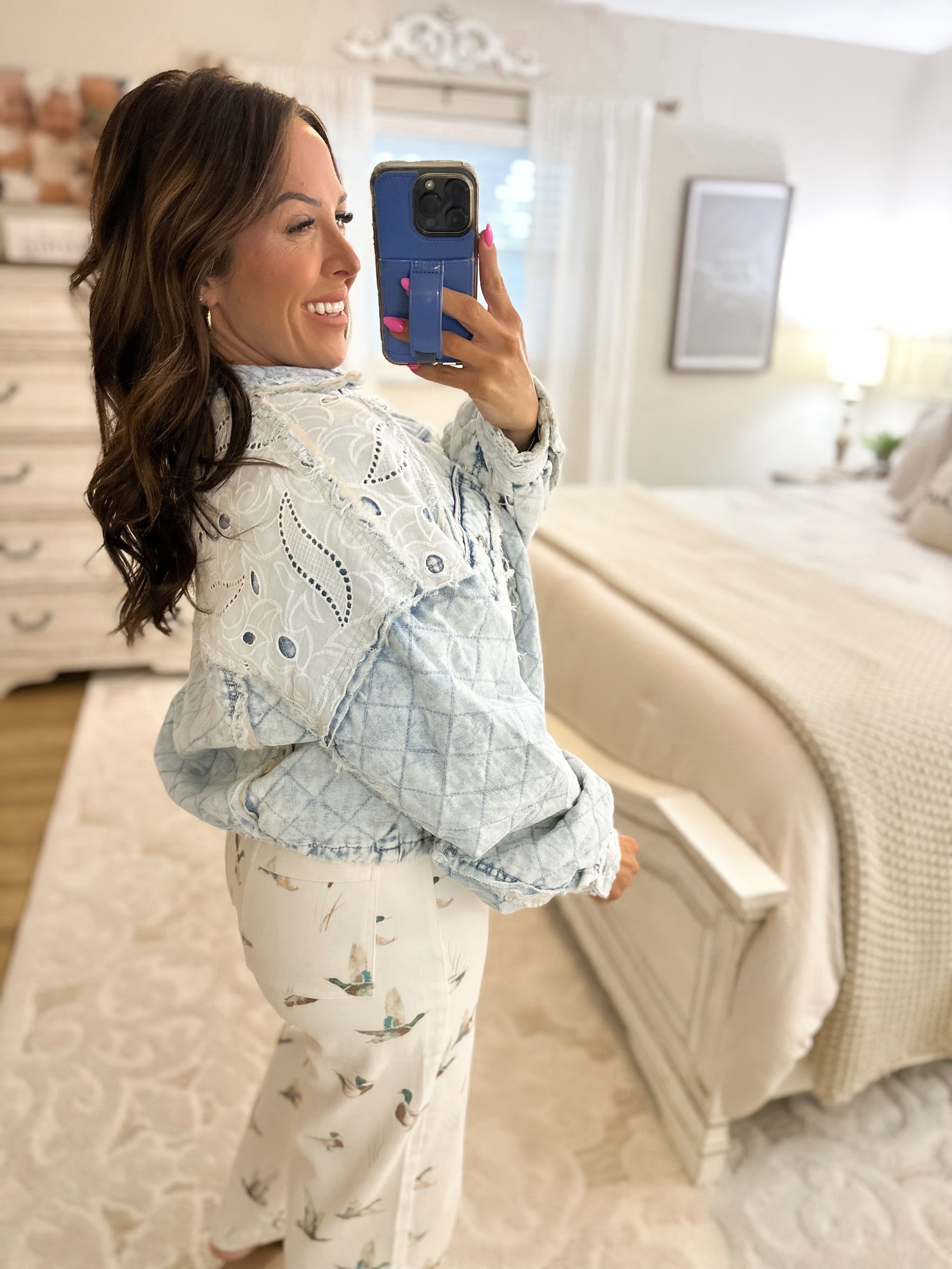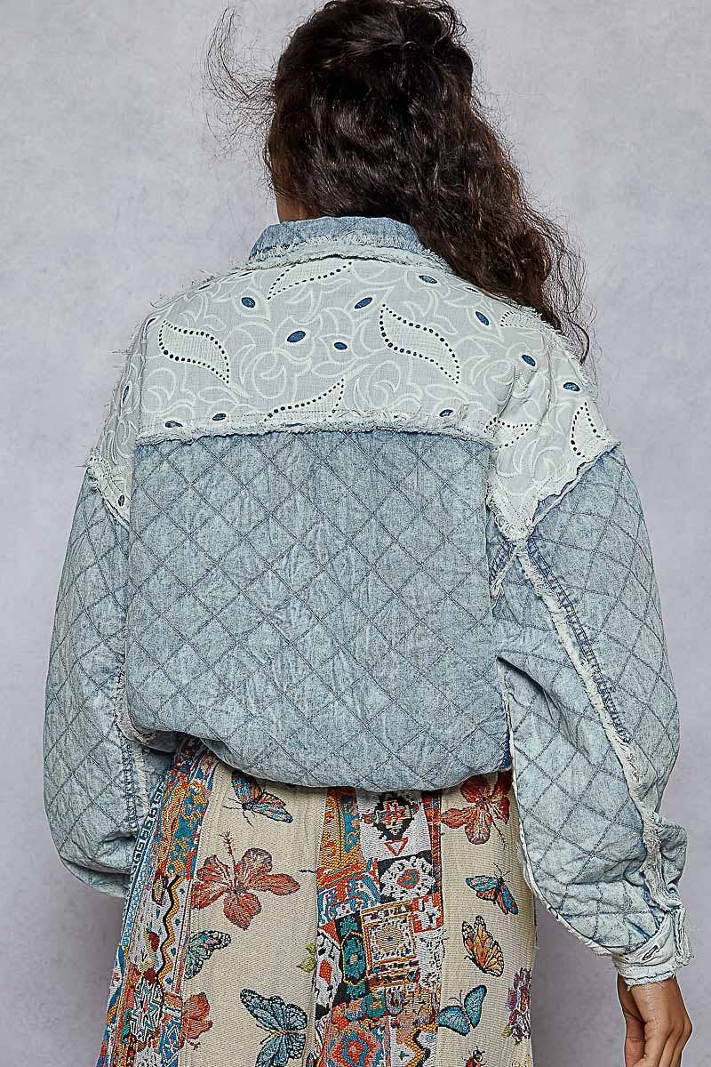Elevate your denim game with the Izzy Lace Denim Quilted Jacket—where vintage charm meets modern edge. Featuring delicate lace detailing and cozy quilted construction, this jacket keeps you warm without the bulk. The statement balloon sleeves add a playful twist that transforms any outfit from basic to bold. Layer it over your favorite tee or dress it up for a night out. Perfect for anyone who refuses to blend in.