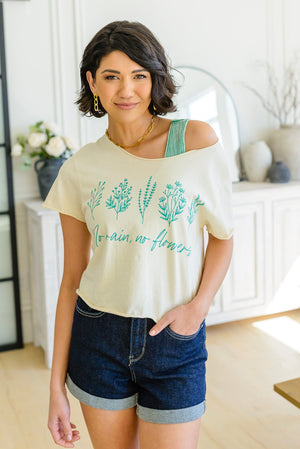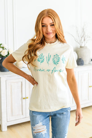 Be ready for the rain and look forward to the flowers with the beautiful No Rain No Flowers graphic tee. This soft cotton tee features a teal floral graphic, it's perfect for cozy days indoors or brightening gloomy days outdoors. Feel vibrant and stylish in this easy silhouette-- a wardrobe must-have!