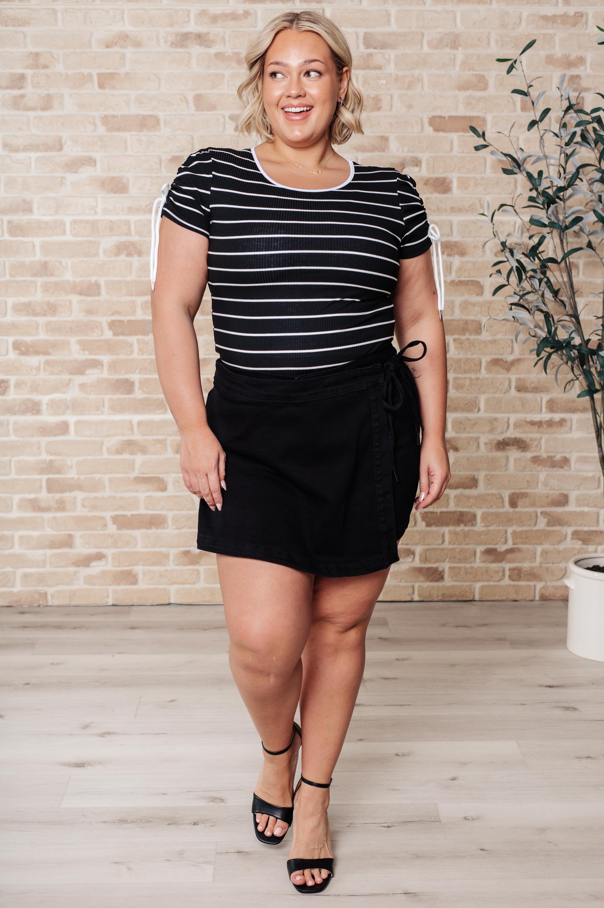 Add some fun to your wardrobe with the Vaguely Speaking Striped Top. This ribbed knit top features a round neckline and form-fitting silhouette, with a functional drawstring sleeve (perfect for adjusting to your desired length). Show off your style with this playful top.
