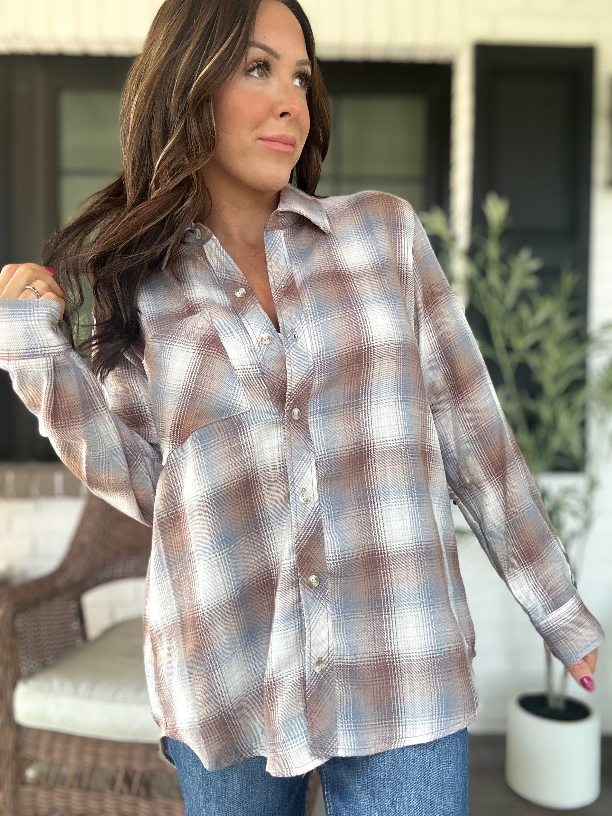 Don't even think about surviving winter without this "Can't Live Without You" Flannel Top. With a classic cut and soft, neutral flannel fabric, you'll stay cozy and fashionable. Front buttons and a pocket add practicality to this must-have piece. (You won't want to take it off!)