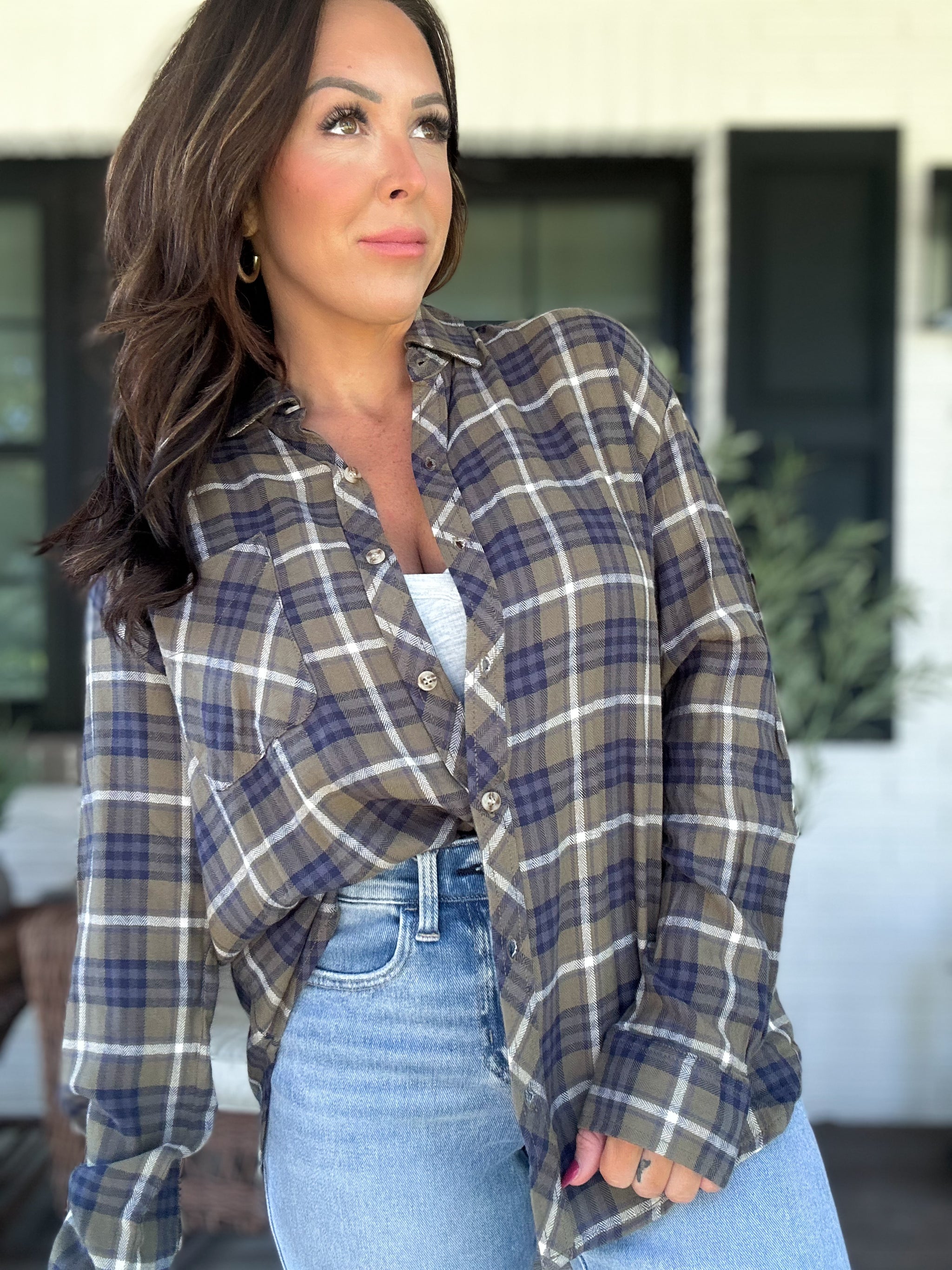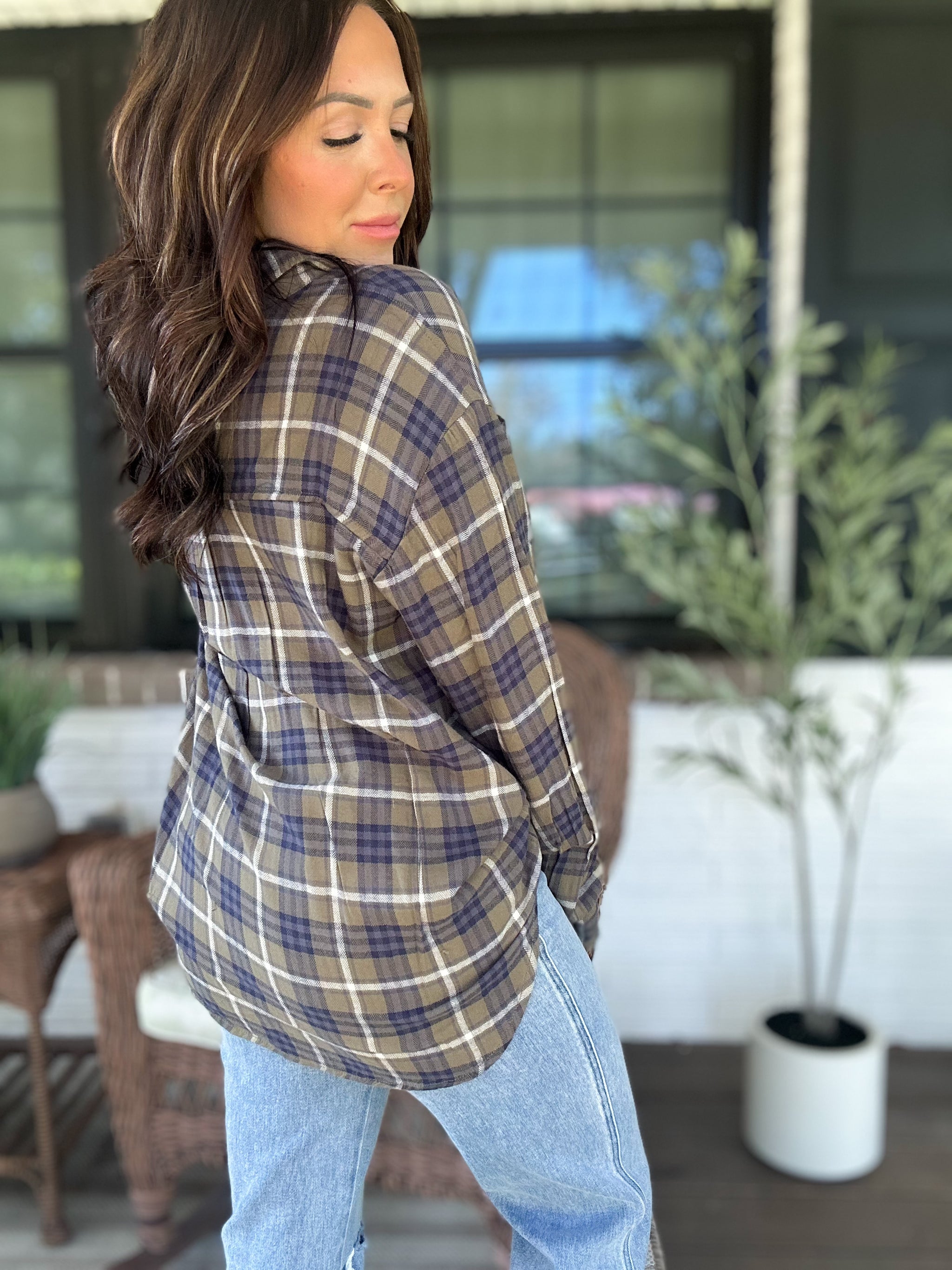 Don't even think about surviving winter without this "Can't Live Without You" Flannel Top. With a classic cut and soft, neutral flannel fabric, you'll stay cozy and fashionable. Front buttons and a pocket add practicality to this must-have piece. (You won't want to take it off!)