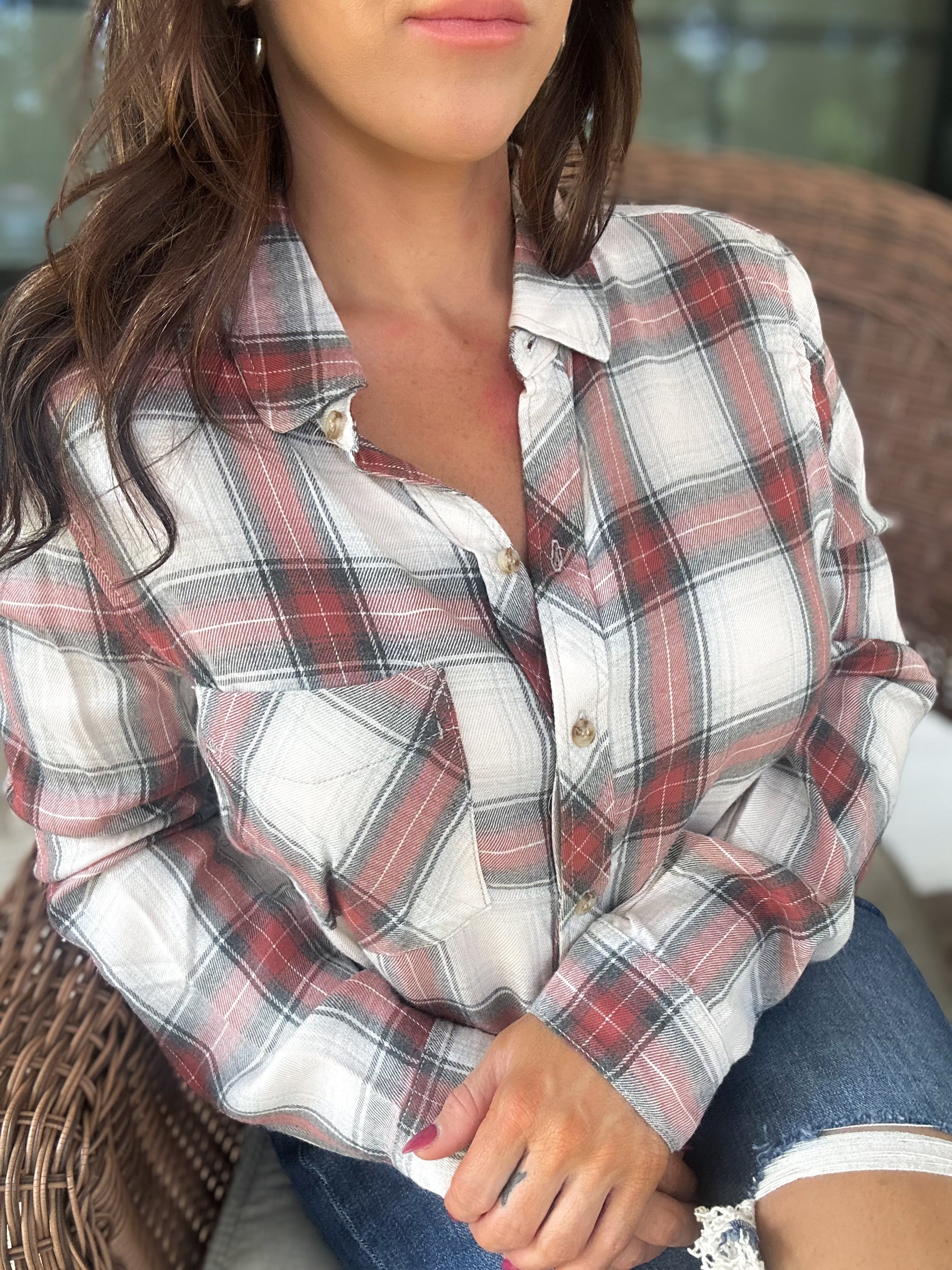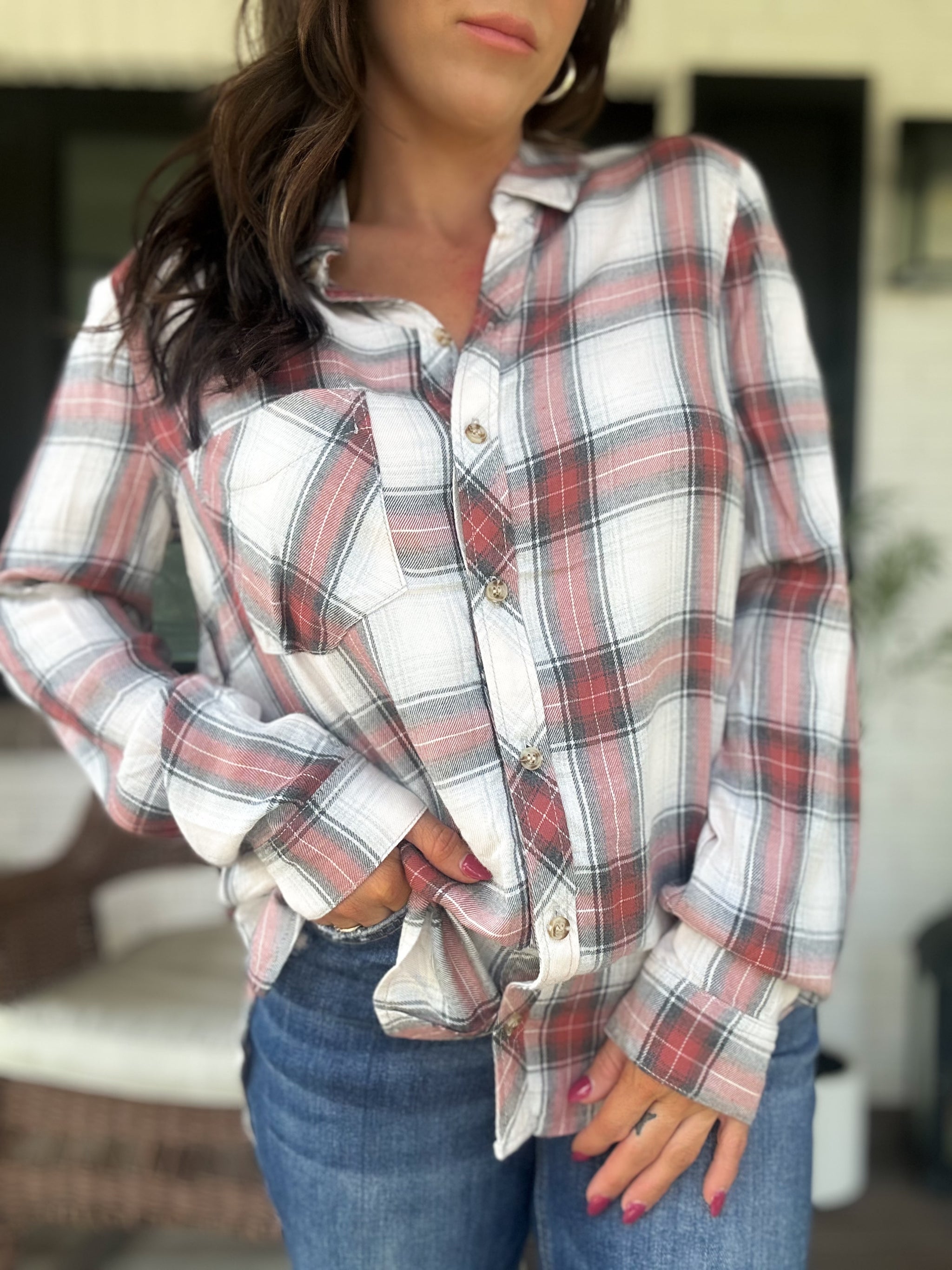 Don't even think about surviving winter without this "Can't Live Without You" Flannel Top. With a classic cut and soft, neutral flannel fabric, you'll stay cozy and fashionable. Front buttons and a pocket add practicality to this must-have piece. (You won't want to take it off!)