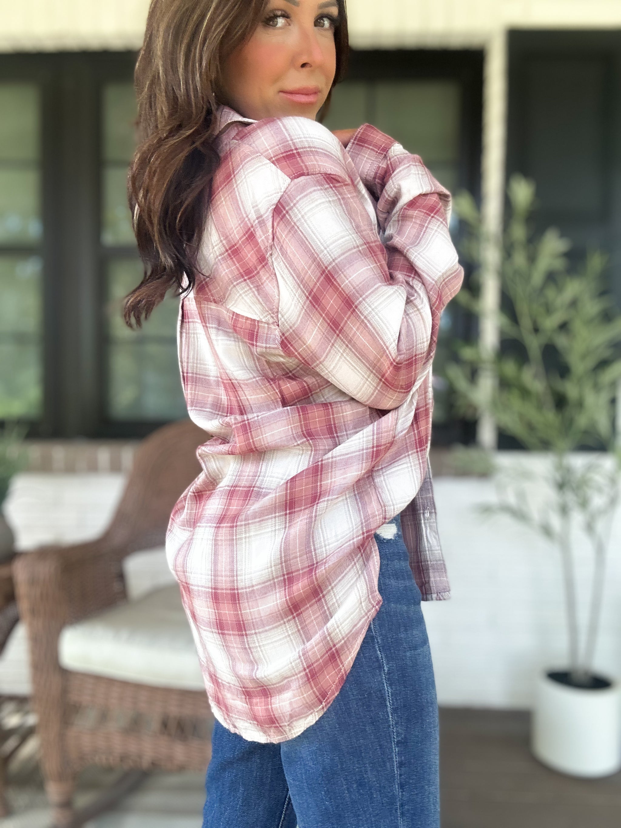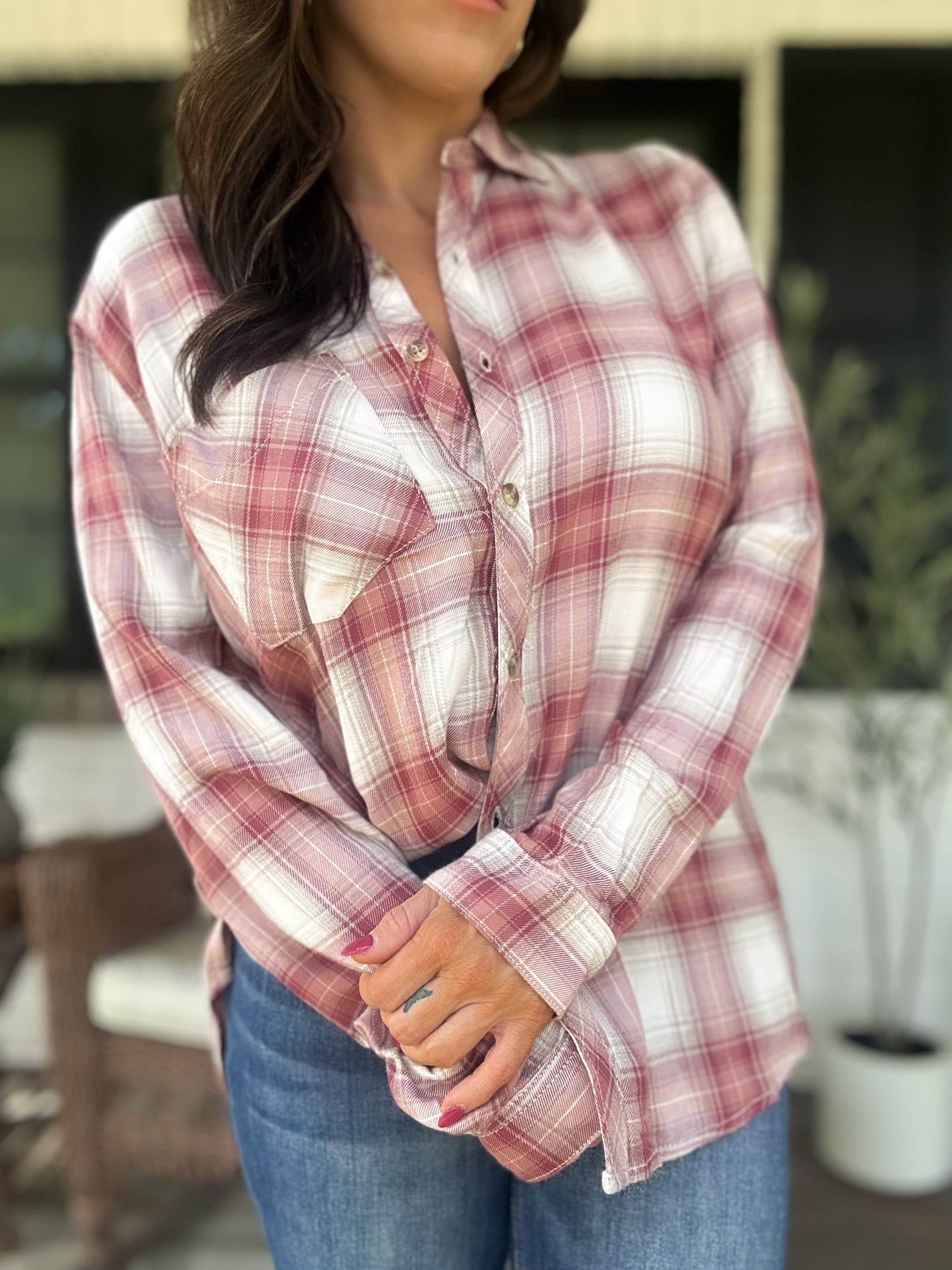 Don't even think about surviving winter without this "Can't Live Without You" Flannel Top. With a classic cut and soft, neutral flannel fabric, you'll stay cozy and fashionable. Front buttons and a pocket add practicality to this must-have piece. (You won't want to take it off!)