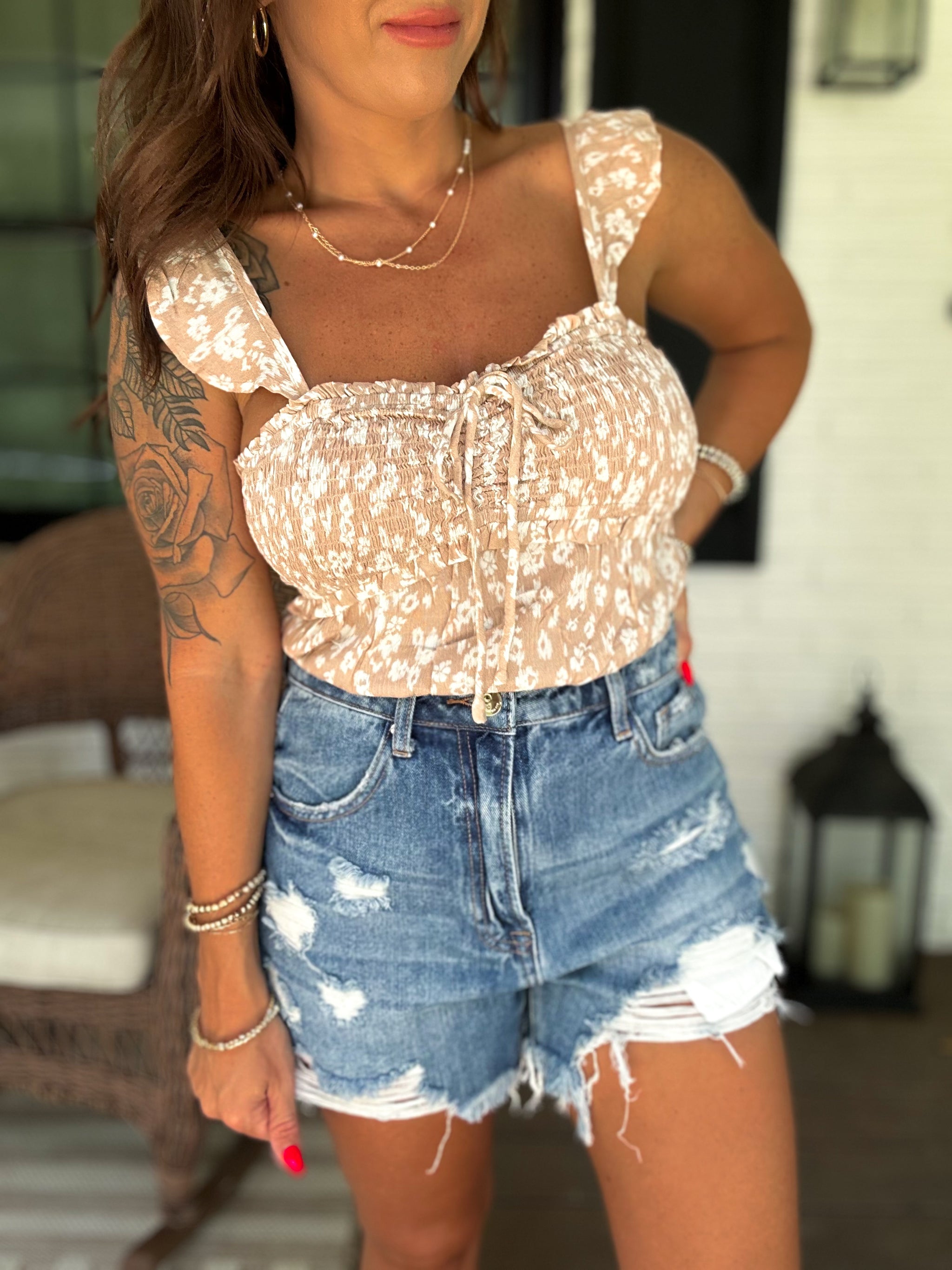 – Sold OutThis playful bodysuit features adjustable flutter straps and a smocked bust for a perfect fit. The front tie adds a flirty touch, while the cheeky bottom coverage with snaps ensures comfort and easy wear. Ideal for adding a fun, flirty vibe to your wardrobe.