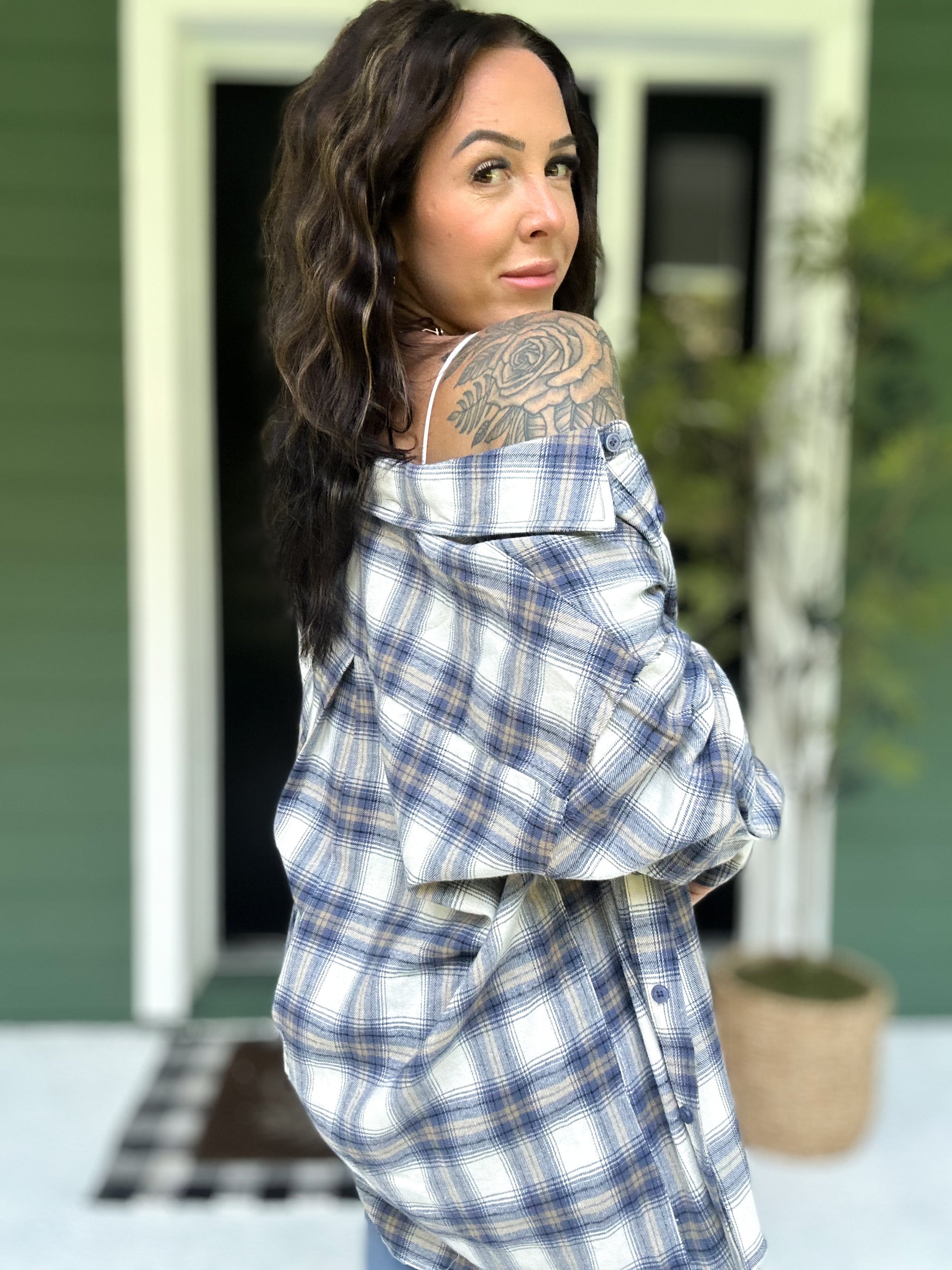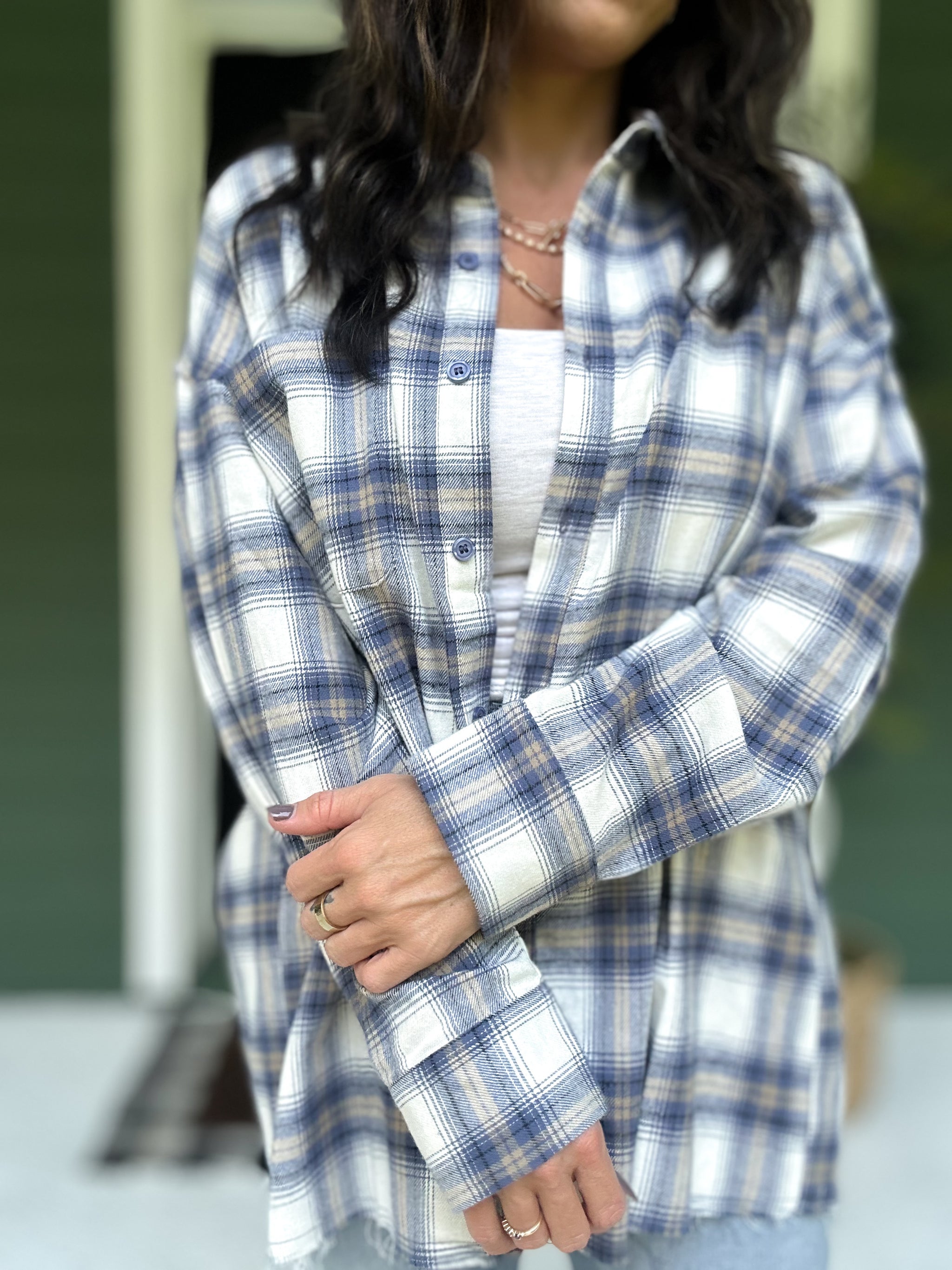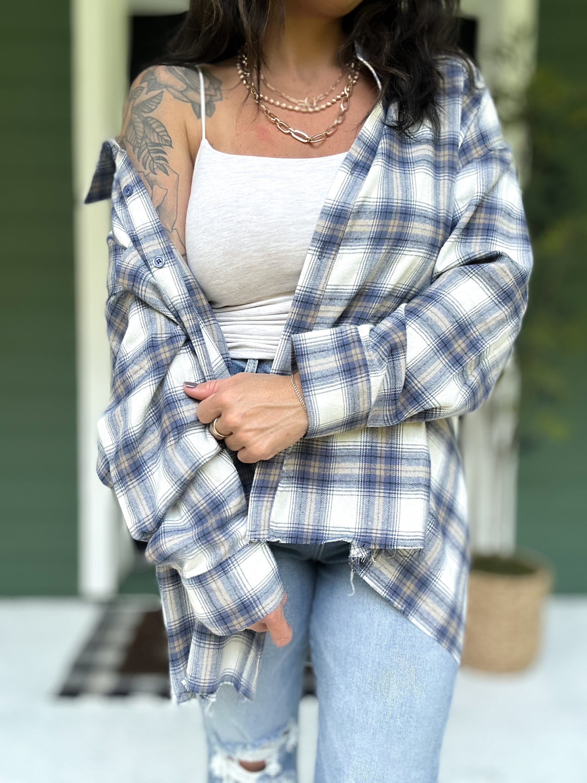 – Sold OutAdd a touch of fun to your wardrobe with the Jessie Plaid Button Down Top. Featuring a charming ivory and blue plaid pattern, this shirt stands out with its playful raw hemline for a casual, carefree vibe. Perfect for layering or wearing solo, it’s an easy way to brighten up any outfit with a dash of personality.