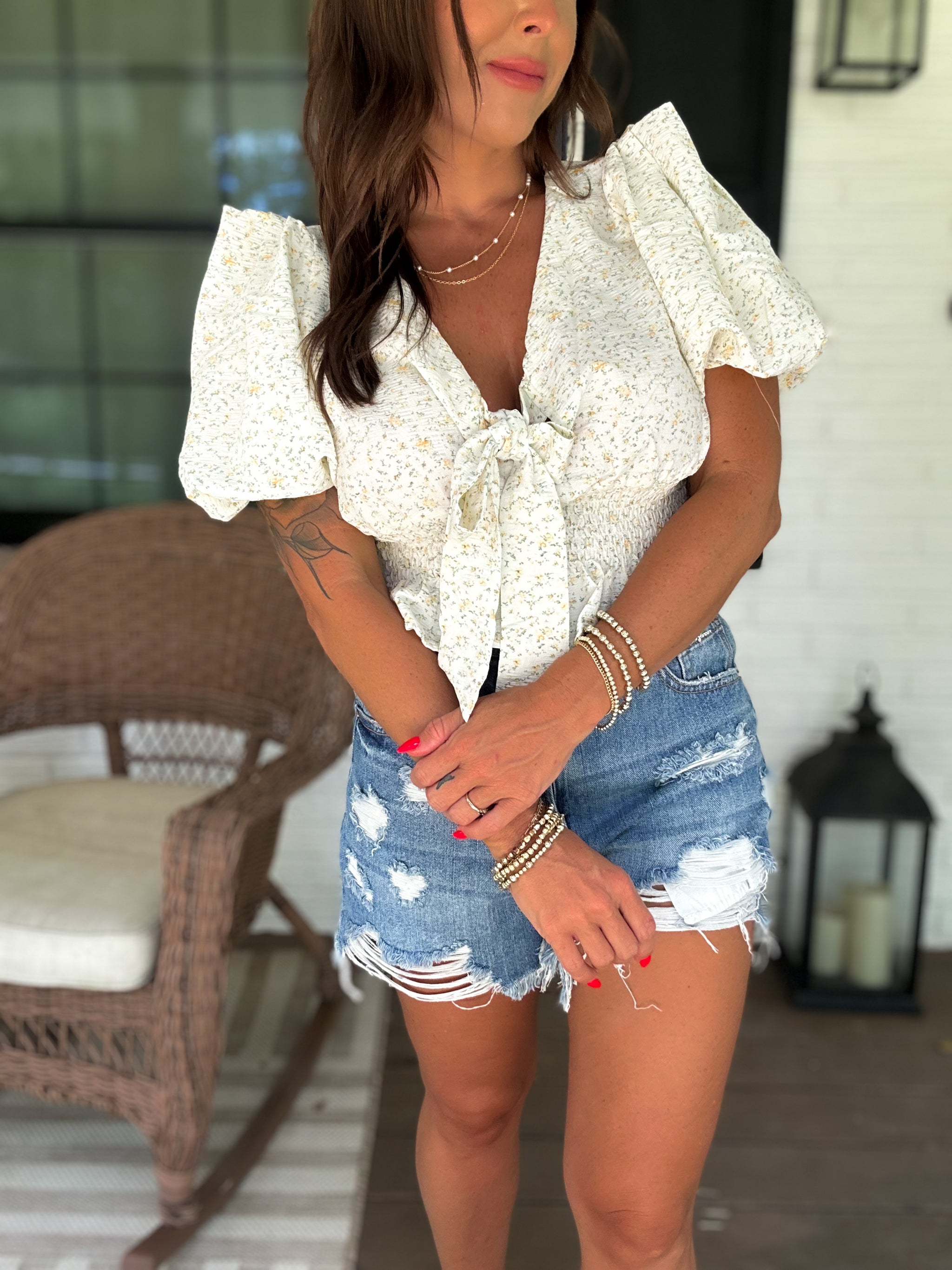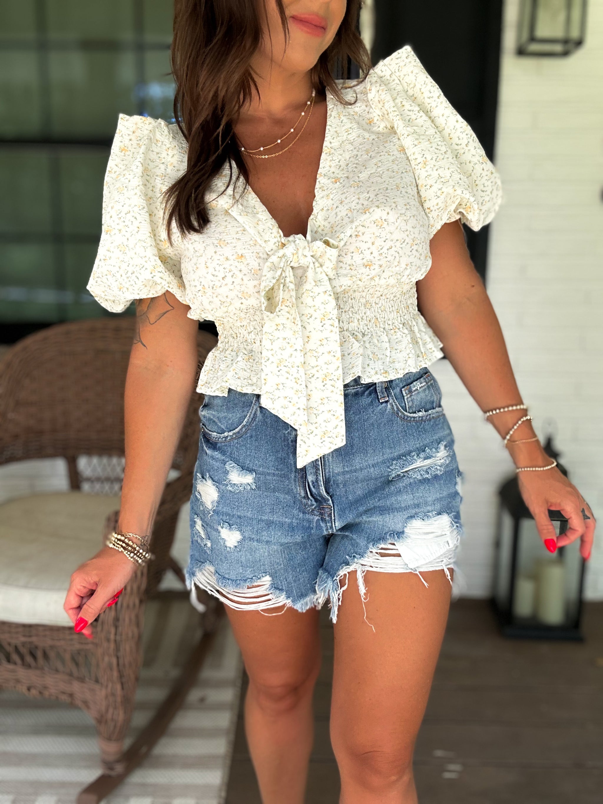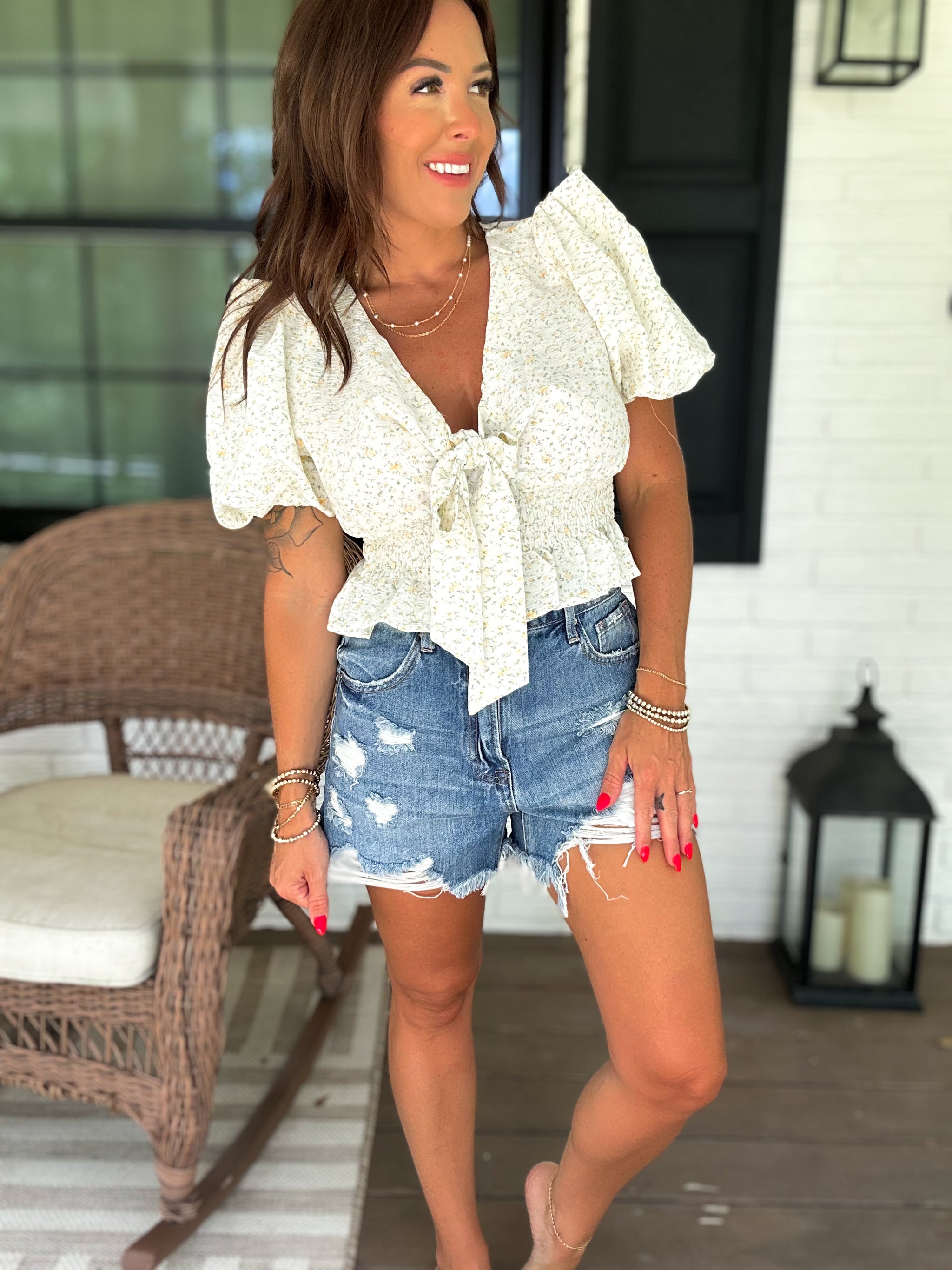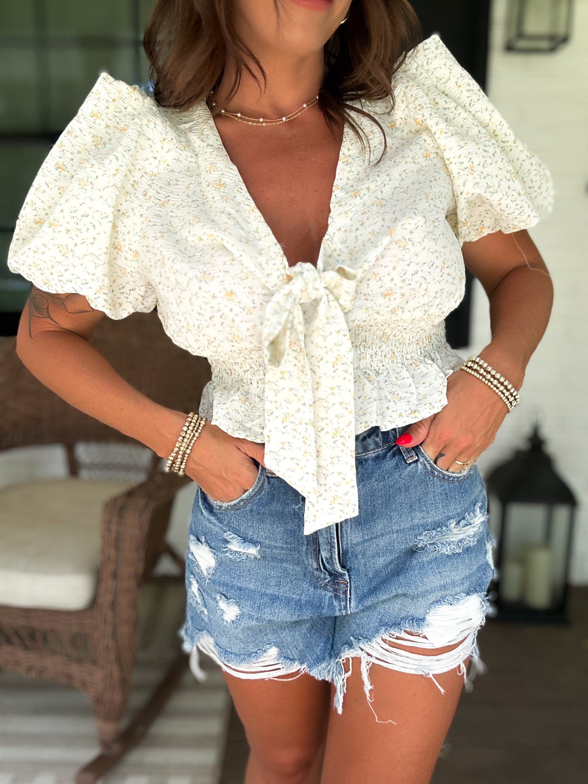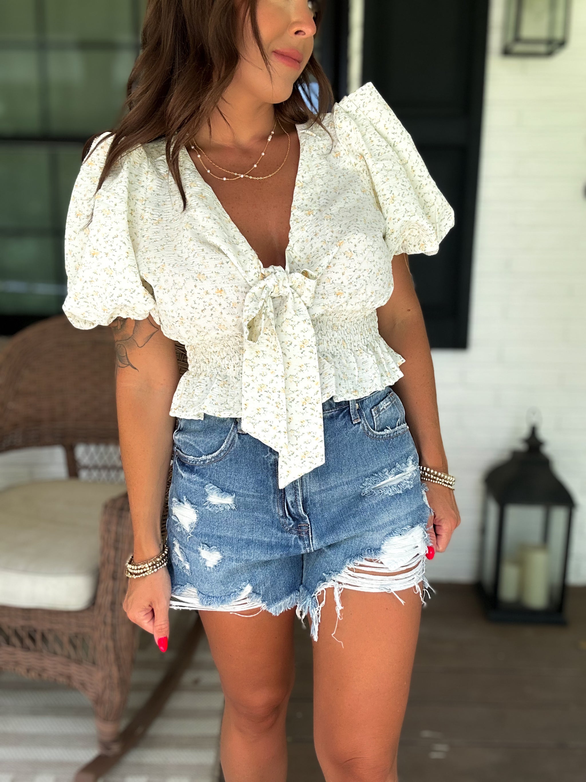 – Sold OutThis playful crop top features a charming petite floral print, an elastic waistband for a comfy fit, and cute front tie detailing that adds a flirty touch. The pleated sleeves bring a fun, feminine flair, making it perfect for sunny days and casual outings.