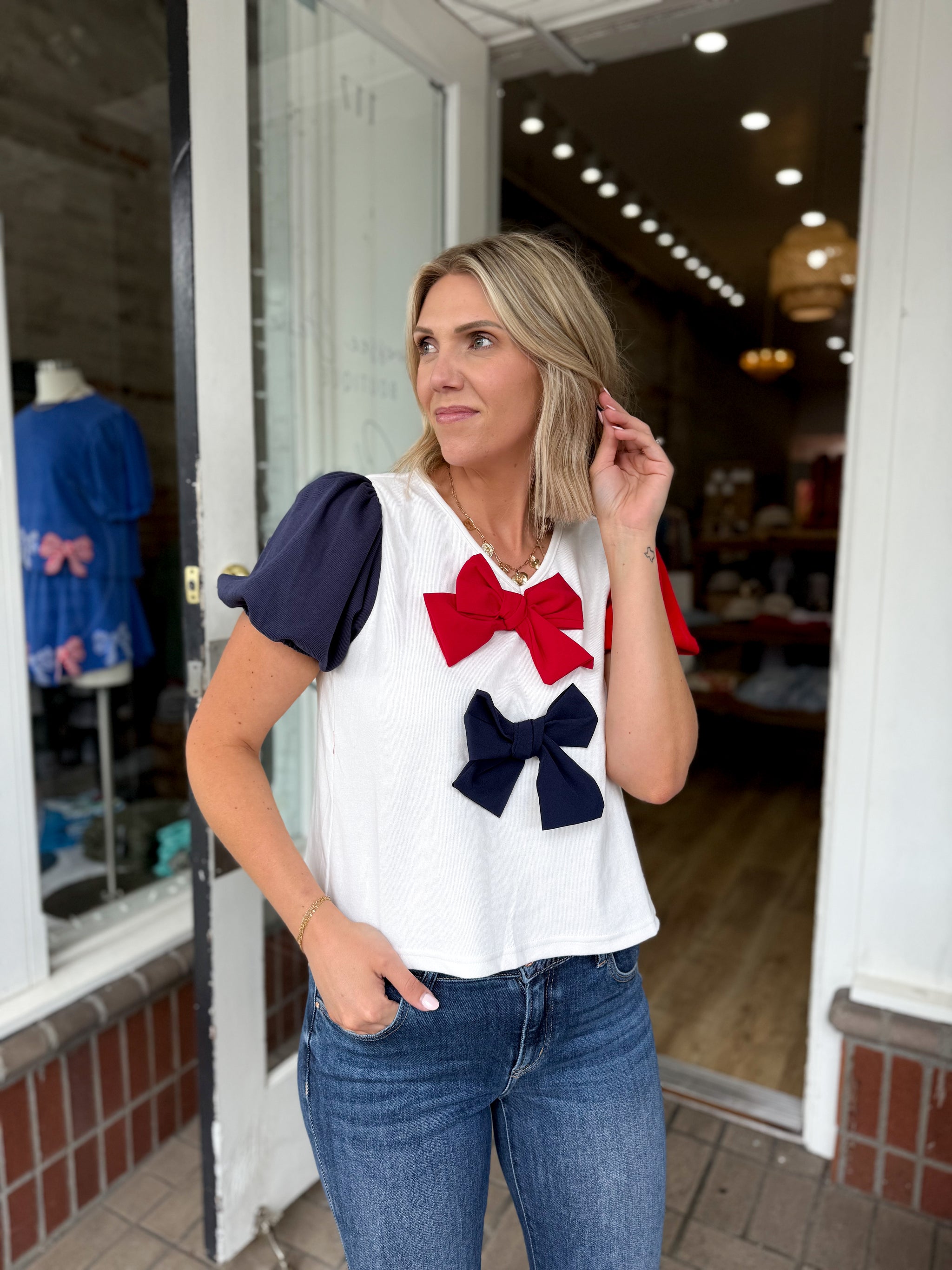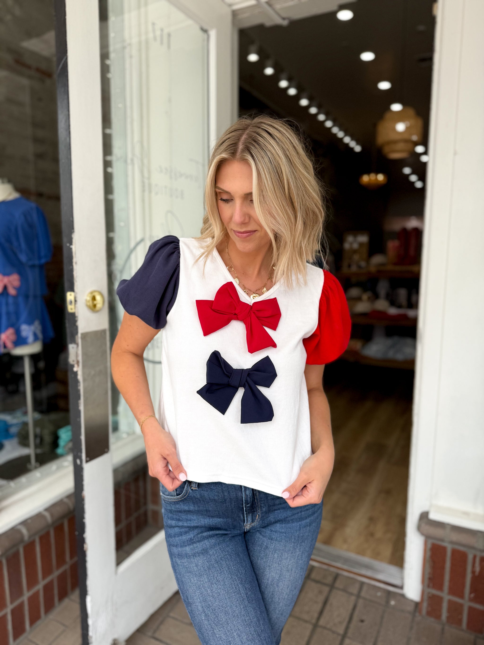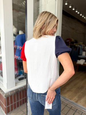 Little Miss USA Puff Sleeve Bow Detail Top