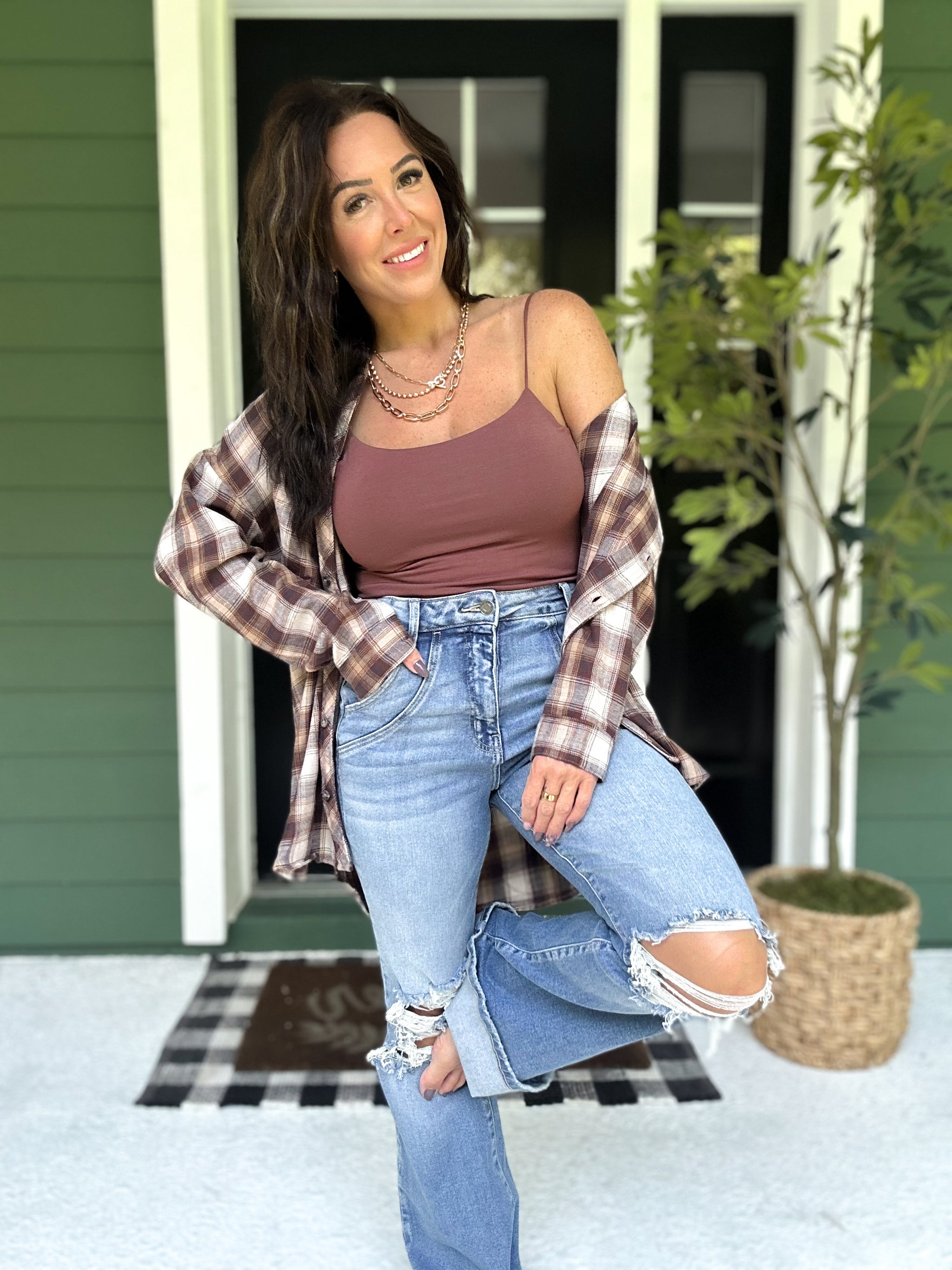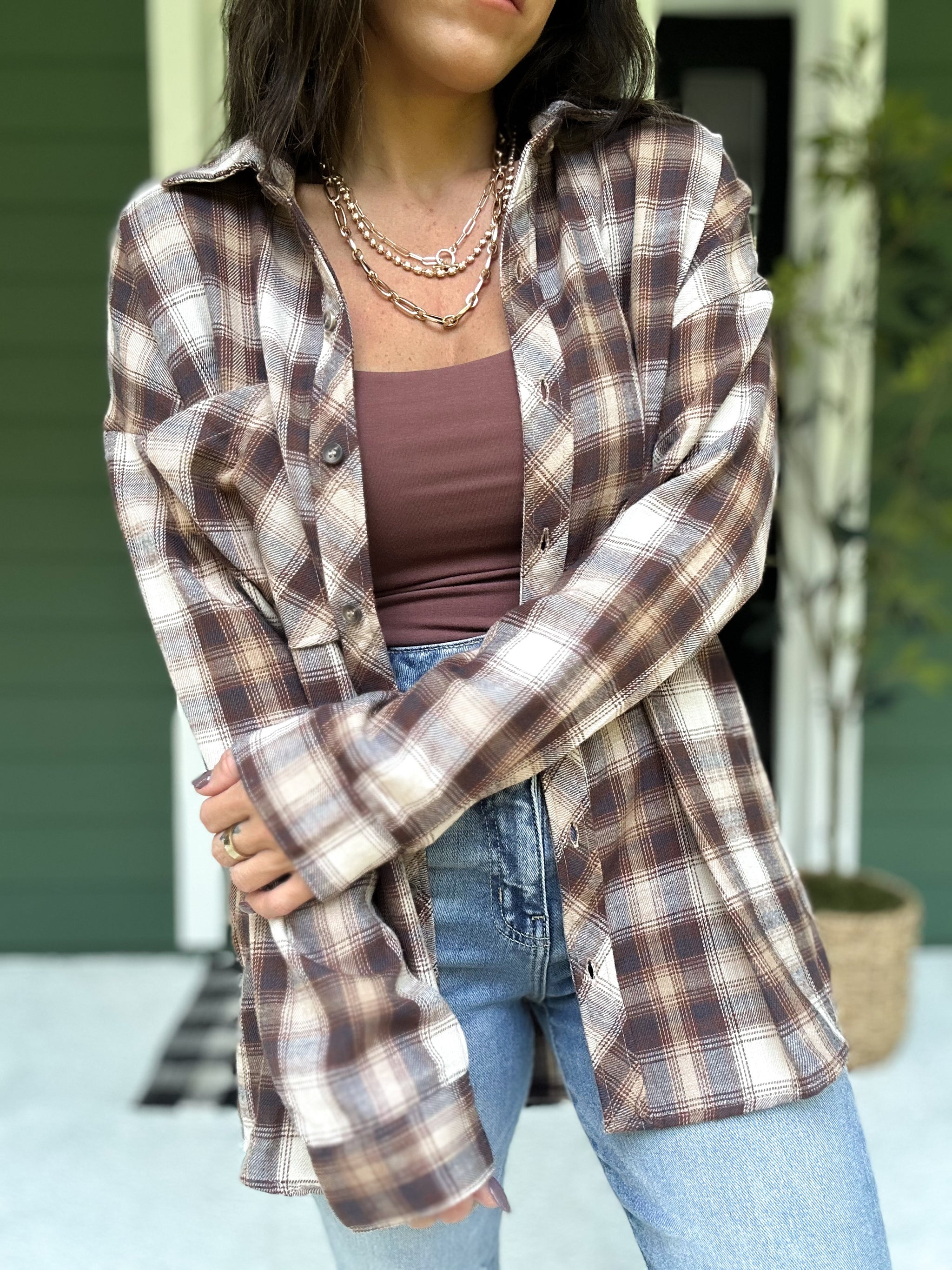 – Sold OutCozy meets cool with this ultra-soft oversized plaid button-up! Perfect for layering or lounging, its roomy fit lets you move freely while keeping you snug. Toss it on for a casual day out or a chill night in—comfort and style, all wrapped into one playful staple.