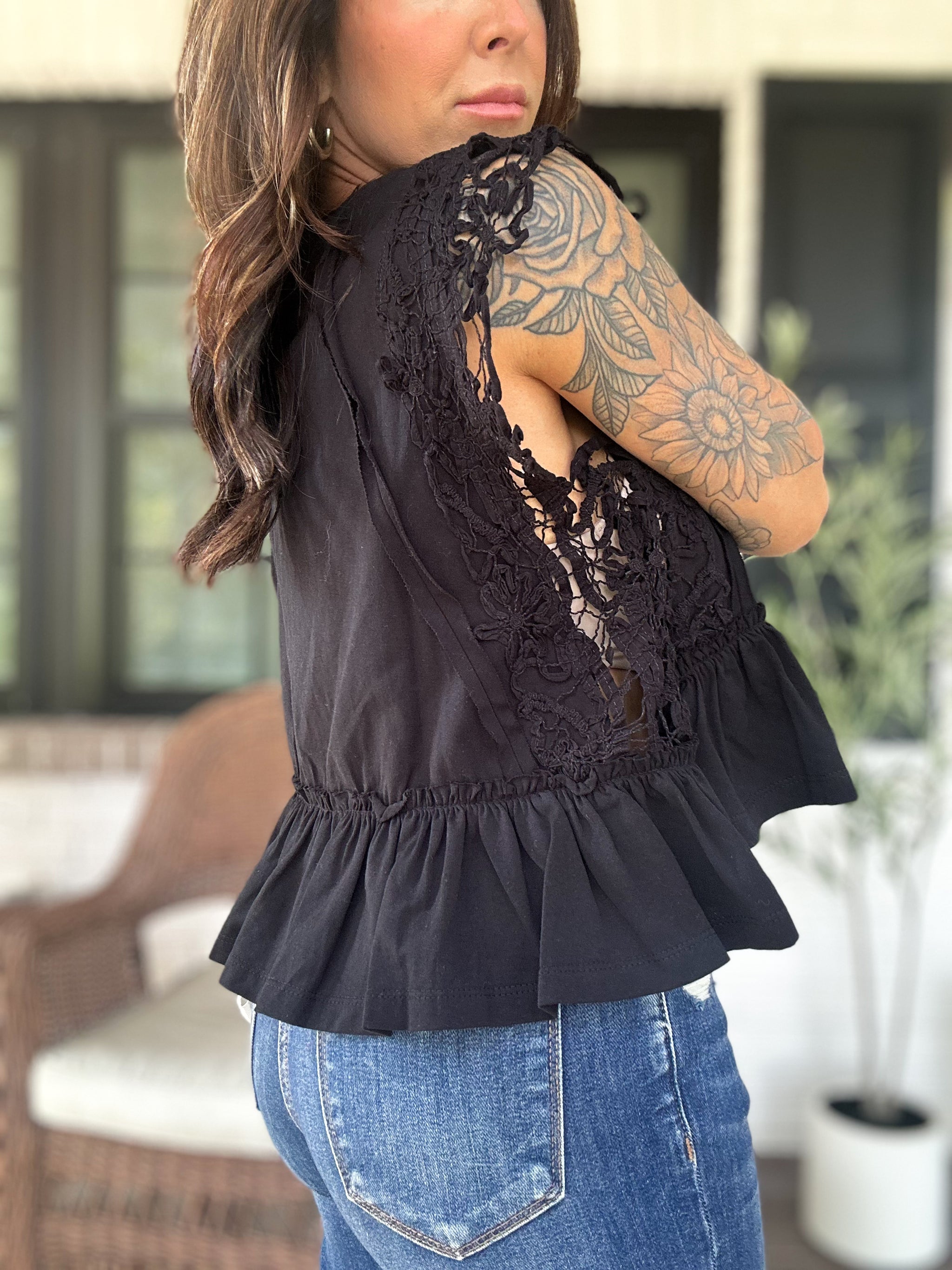 Brighten your wardrobe with the Mable Lace Trim Top. This playful top features delicate side lace trim and a charming ruffle hem, adding a flirty touch to your look. Slightly cropped for a trendy fit, it pairs perfectly with high-waisted jeans or skirts for effortless style.