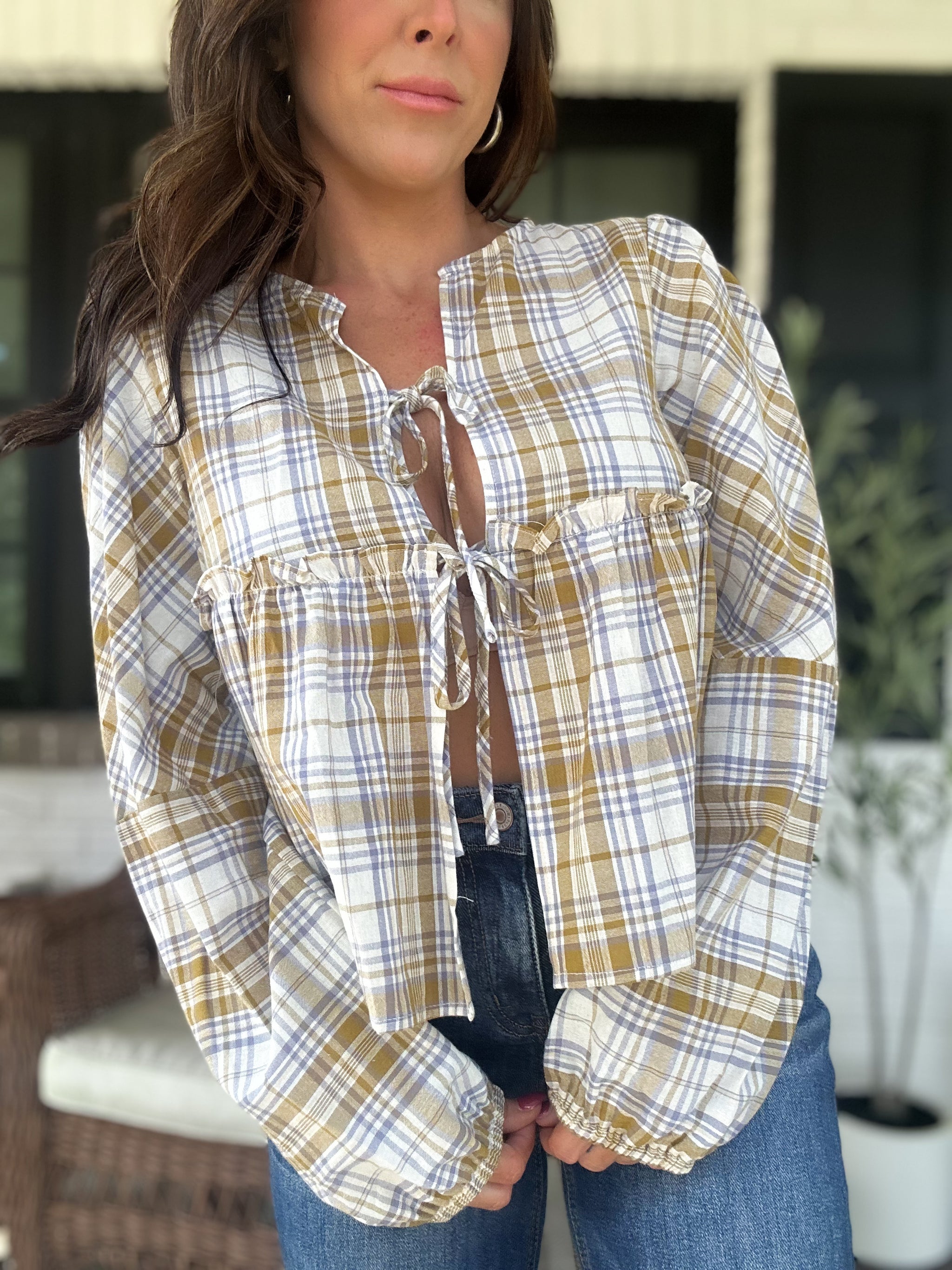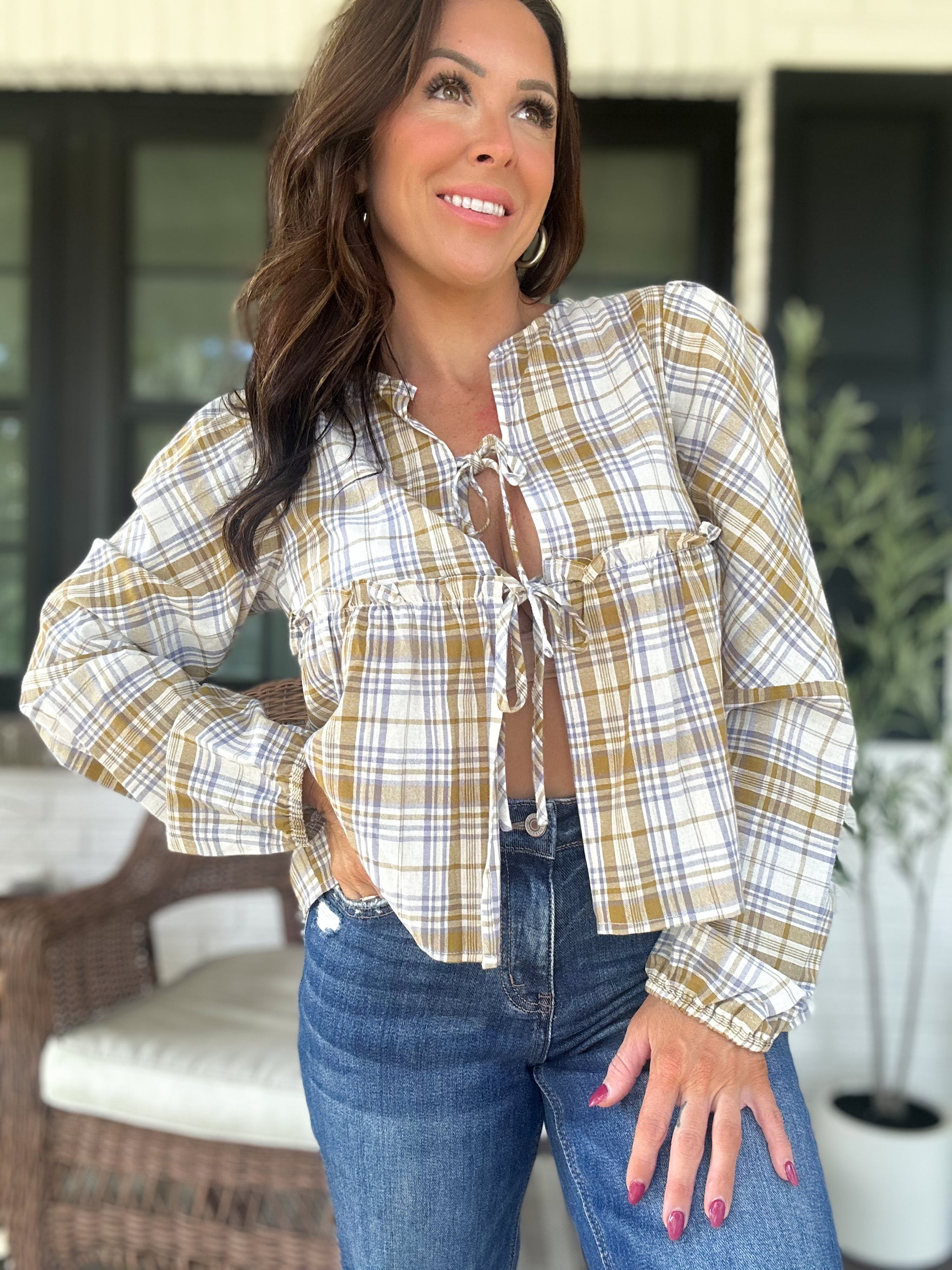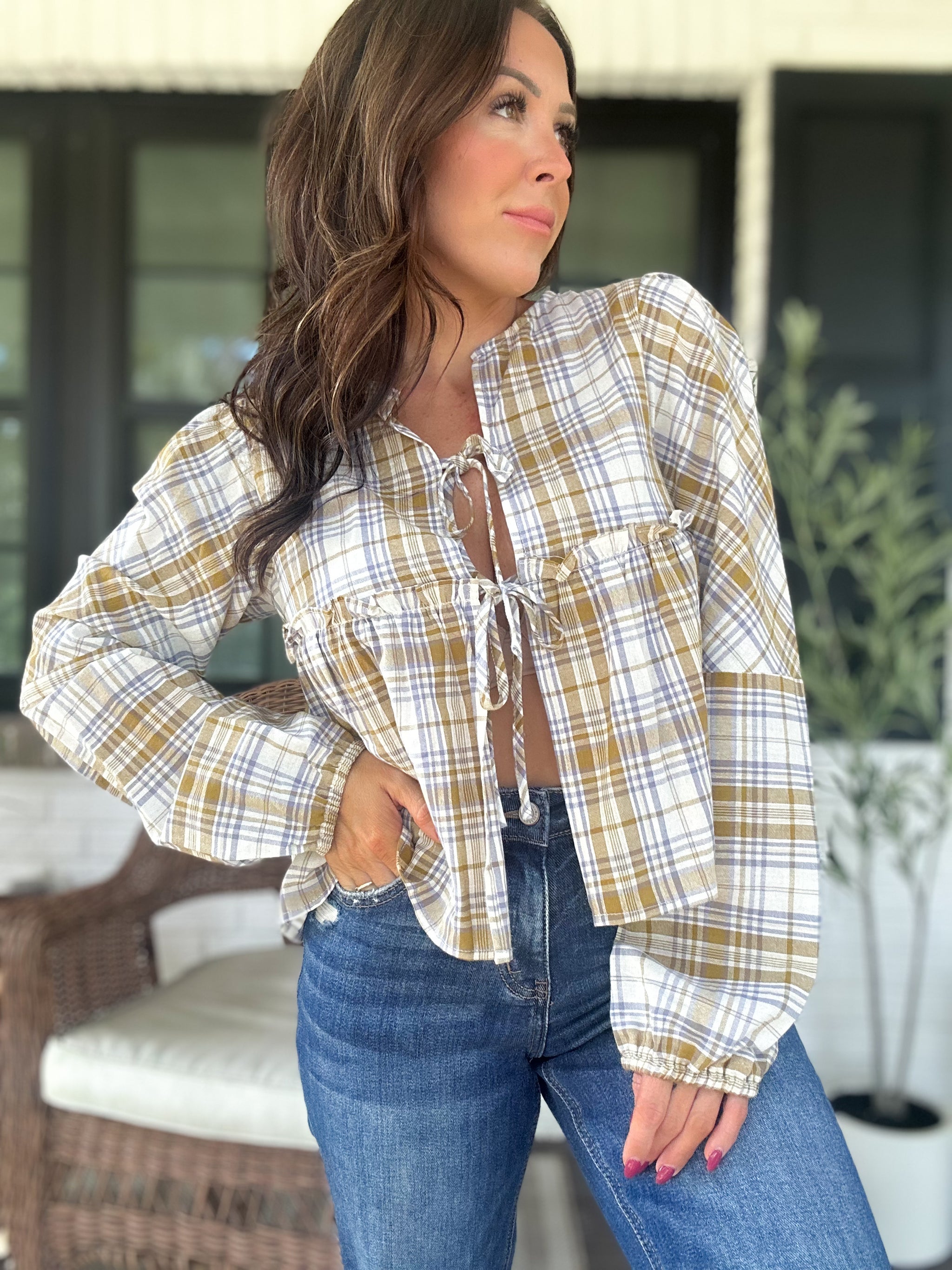 Bring a touch of playful elegance to your outfit with the Phoebe Checkered Blouse in Olive. With charming front ties and puff sleeves, this blouse adds a flirty twist to the timeless checkered pattern. Perfect for mixing and matching, it effortlessly brightens your everyday style.