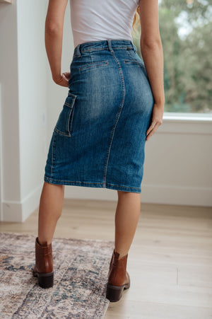 This stylish Always Be There Cargo Denim Skirt is the perfect piece for everyday wear. It's crafted with stretchy medium wash denim for a comfortable fit and extra movement, and features a front slit and cargo pockets for a more dynamic look. Look great and put your most fashionable foot forward!