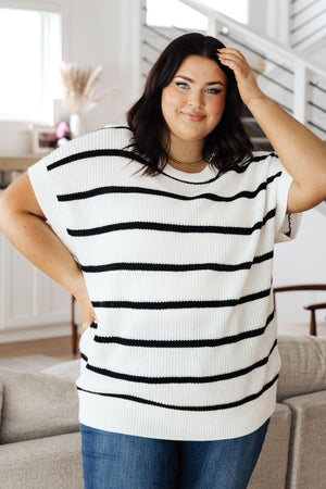 – Sold OutStay cozy in this stylish At the Movies Sleeveless Sweater. Crafted from lightweight sweater knit, it features white with black stripes, and a ribbed crew neckline for a classic look. Enjoy a comfortable fit and effortless style.
