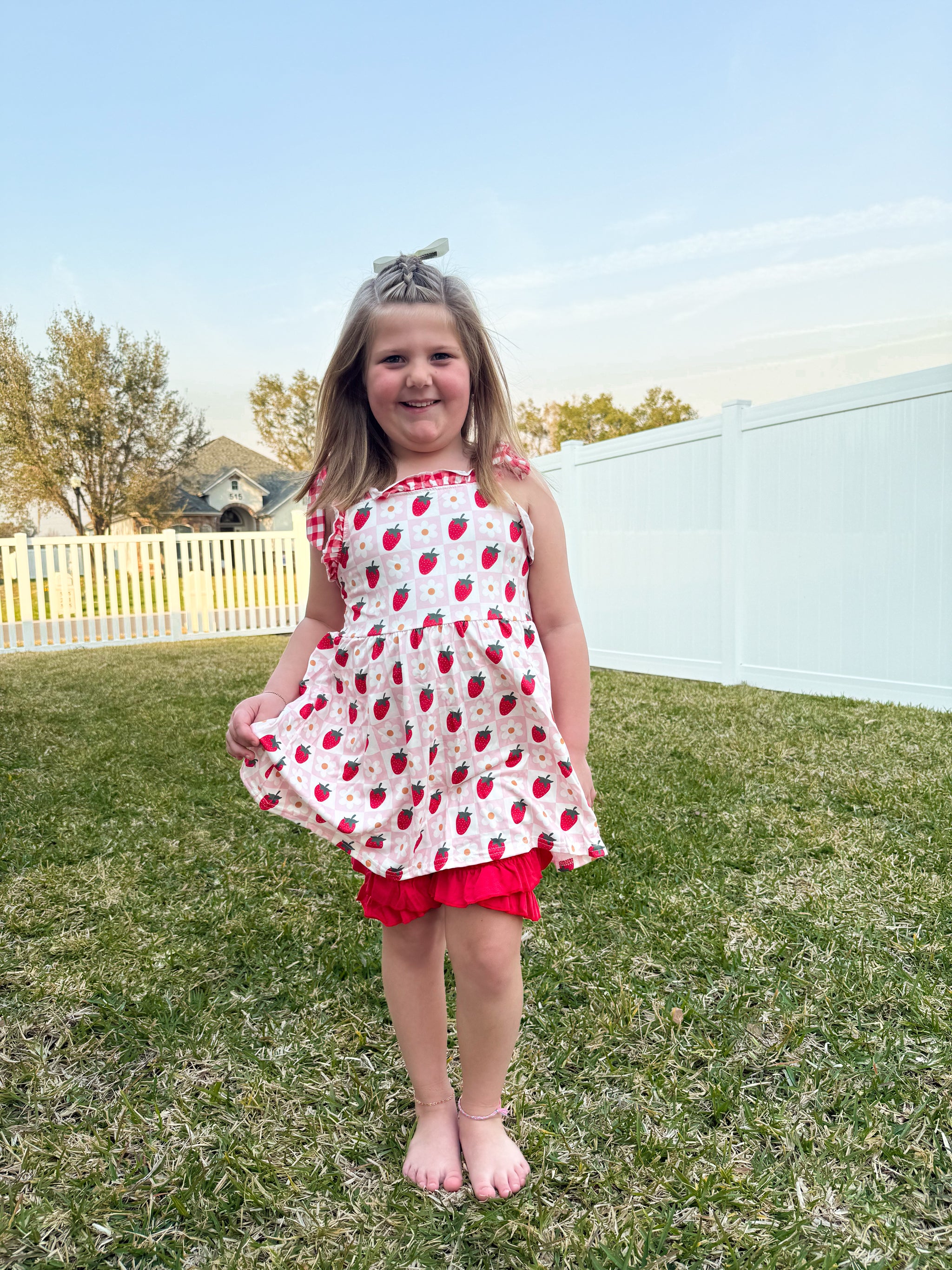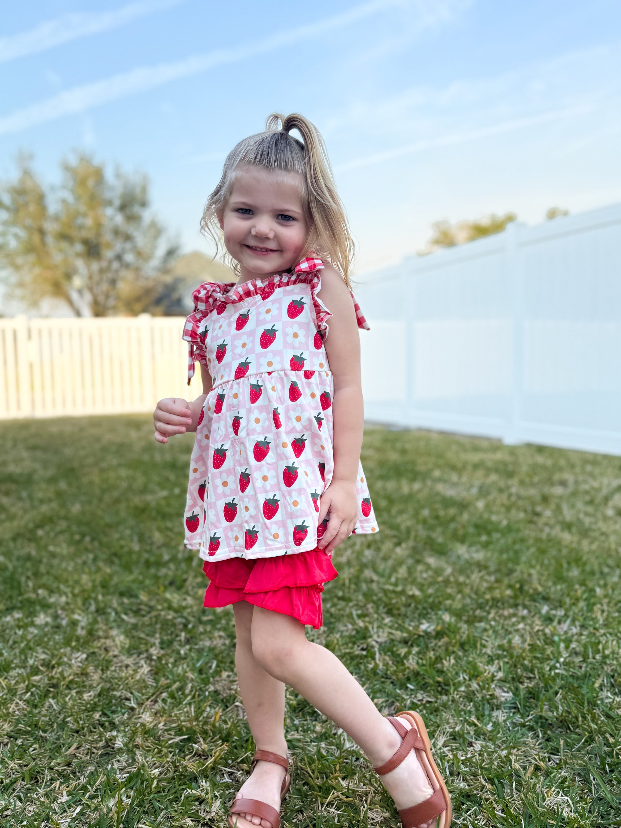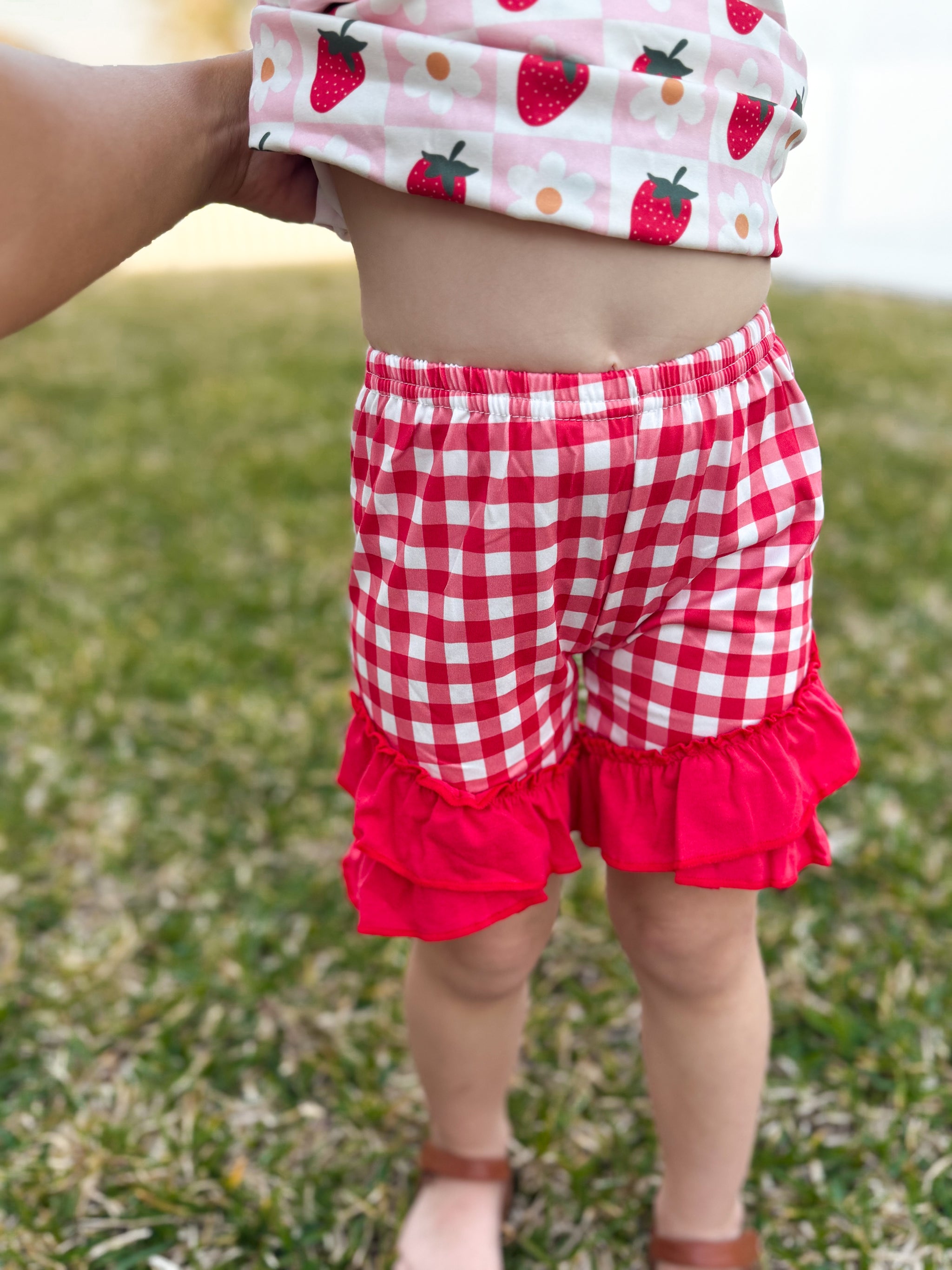 This adorable toddler ensemble features top straps that can be easily adjusted with a tie, paired with ruffle shorts that have a stretchy waistband for maximum comfort.