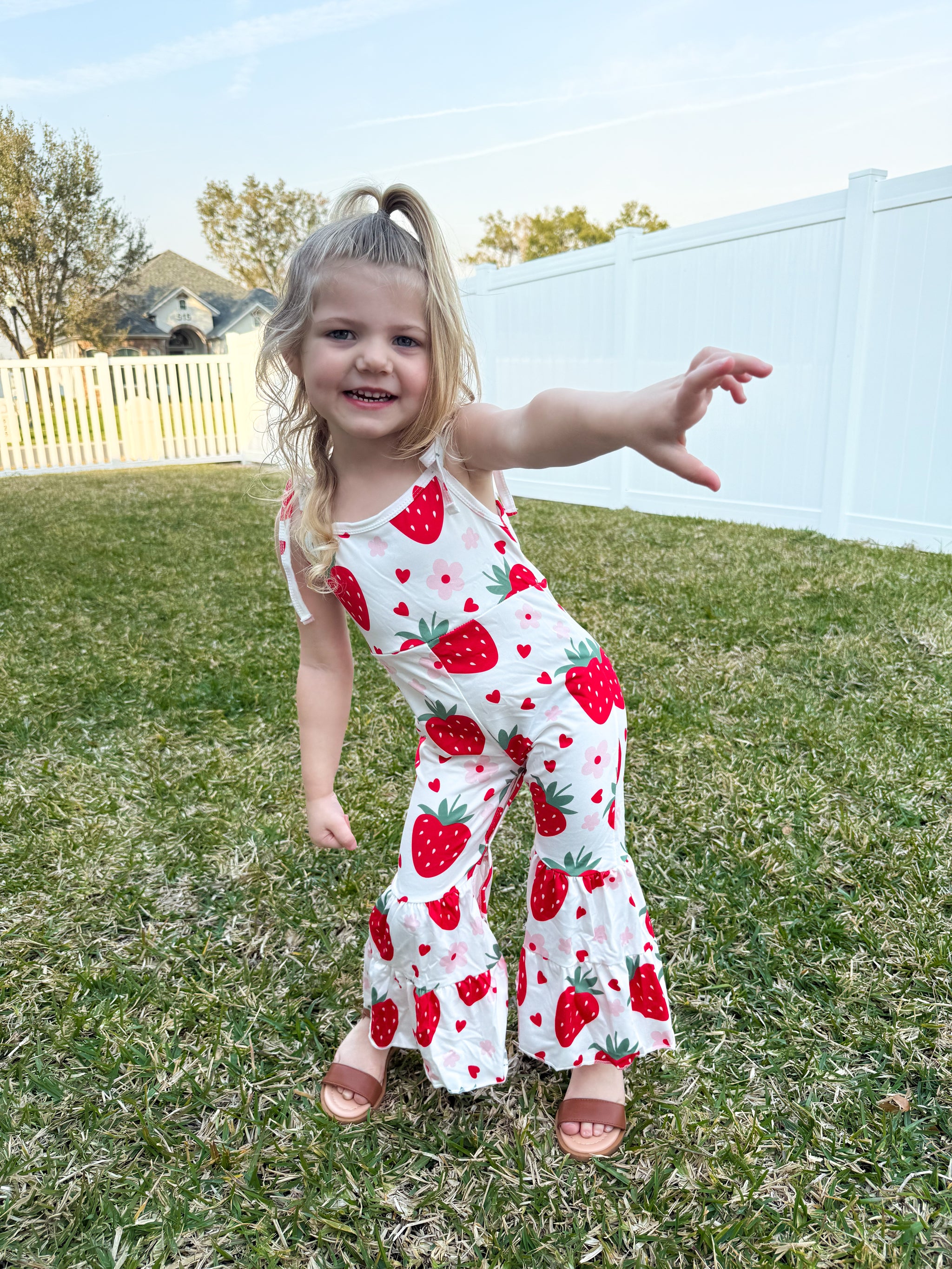 This adorable toddler jumpsuit ensemble features top straps that can be easily adjusted with a tie, made with a soft, stretchy fabric for maximum comfort.
