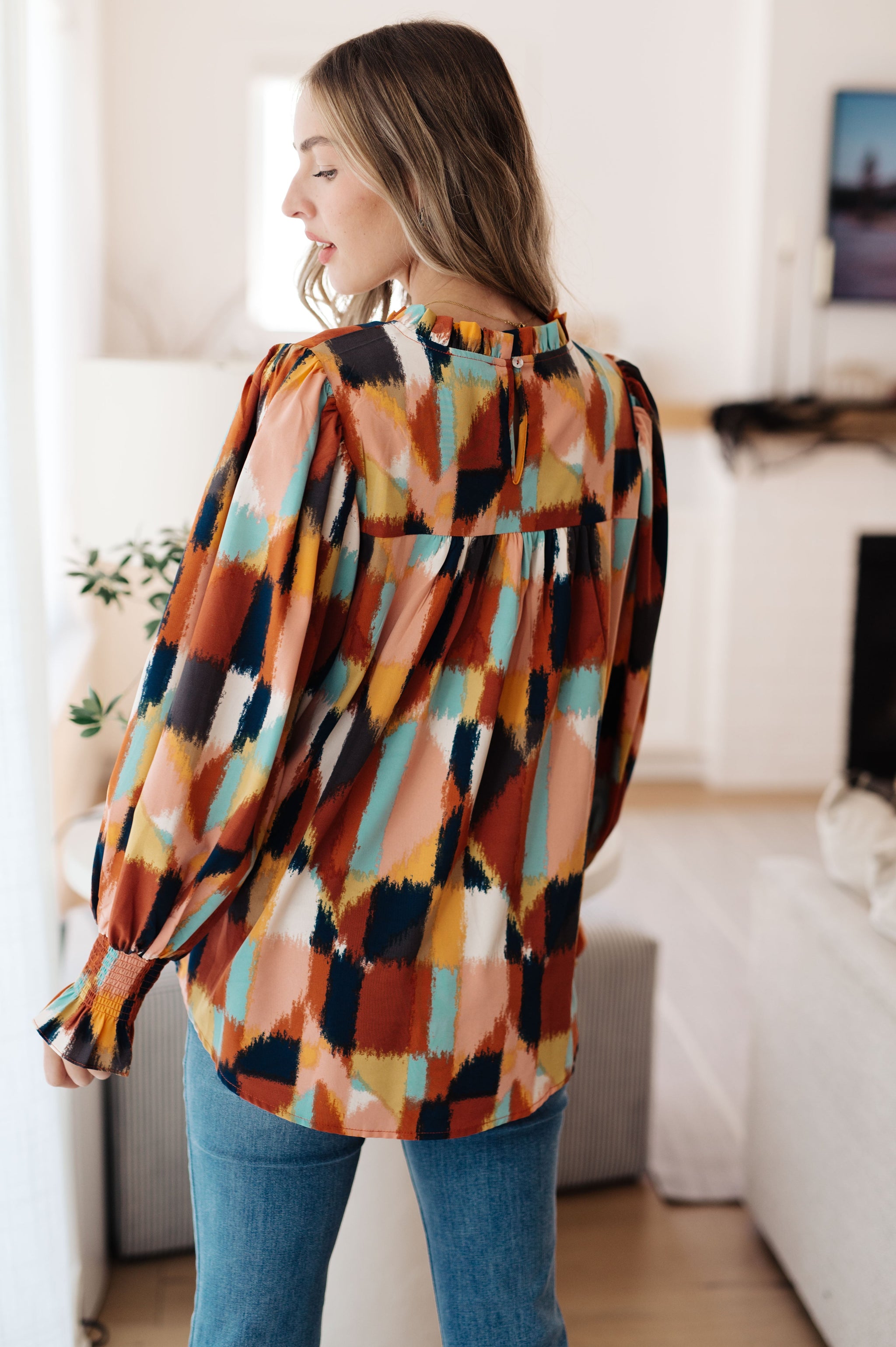 – Sold OutThis Call It What It Is Blouse has an effortless look with a unique mod print, ruffled neckline and smocked elastic sleeve cuffs. A stylish update for any wardrobe.