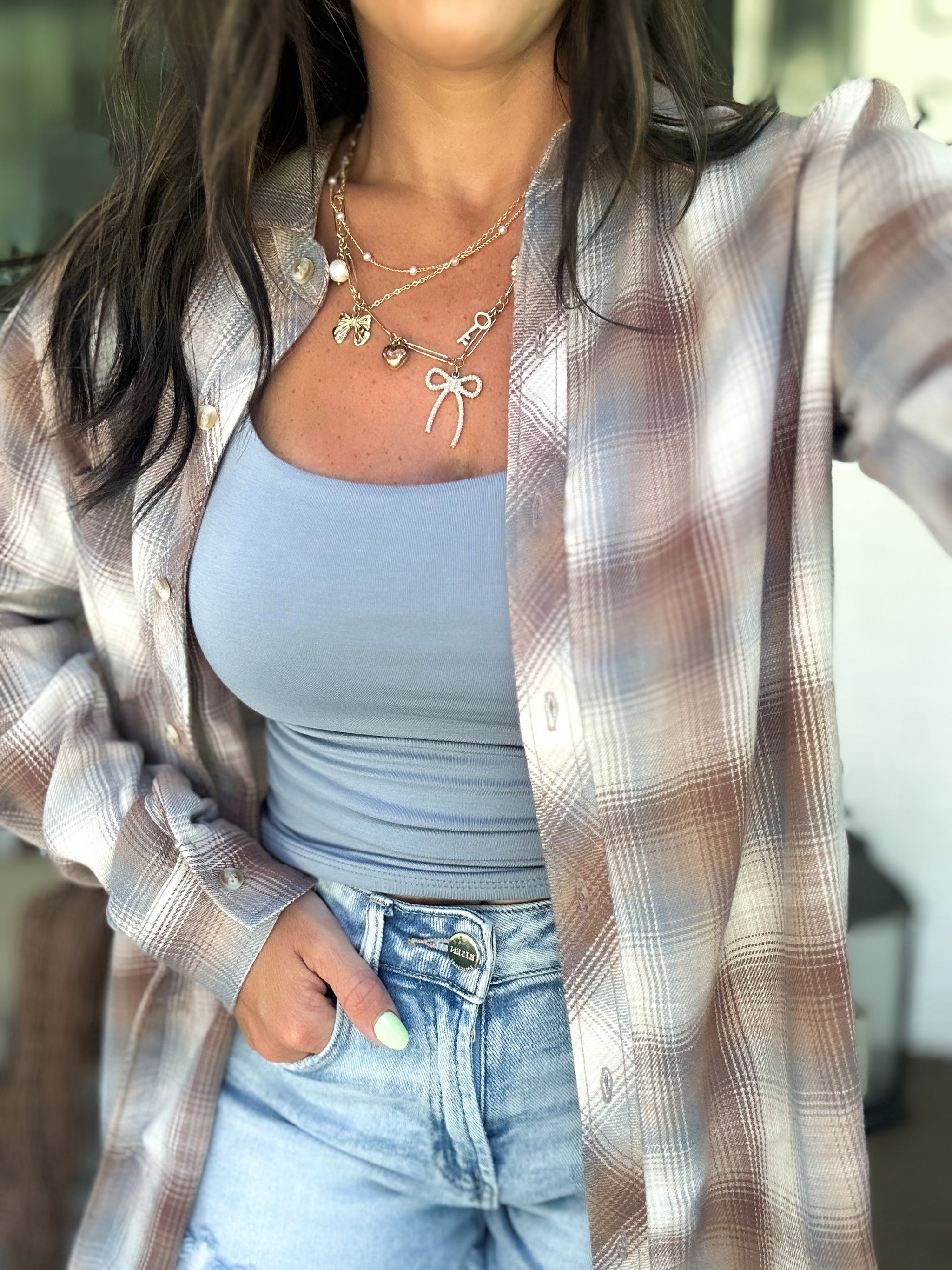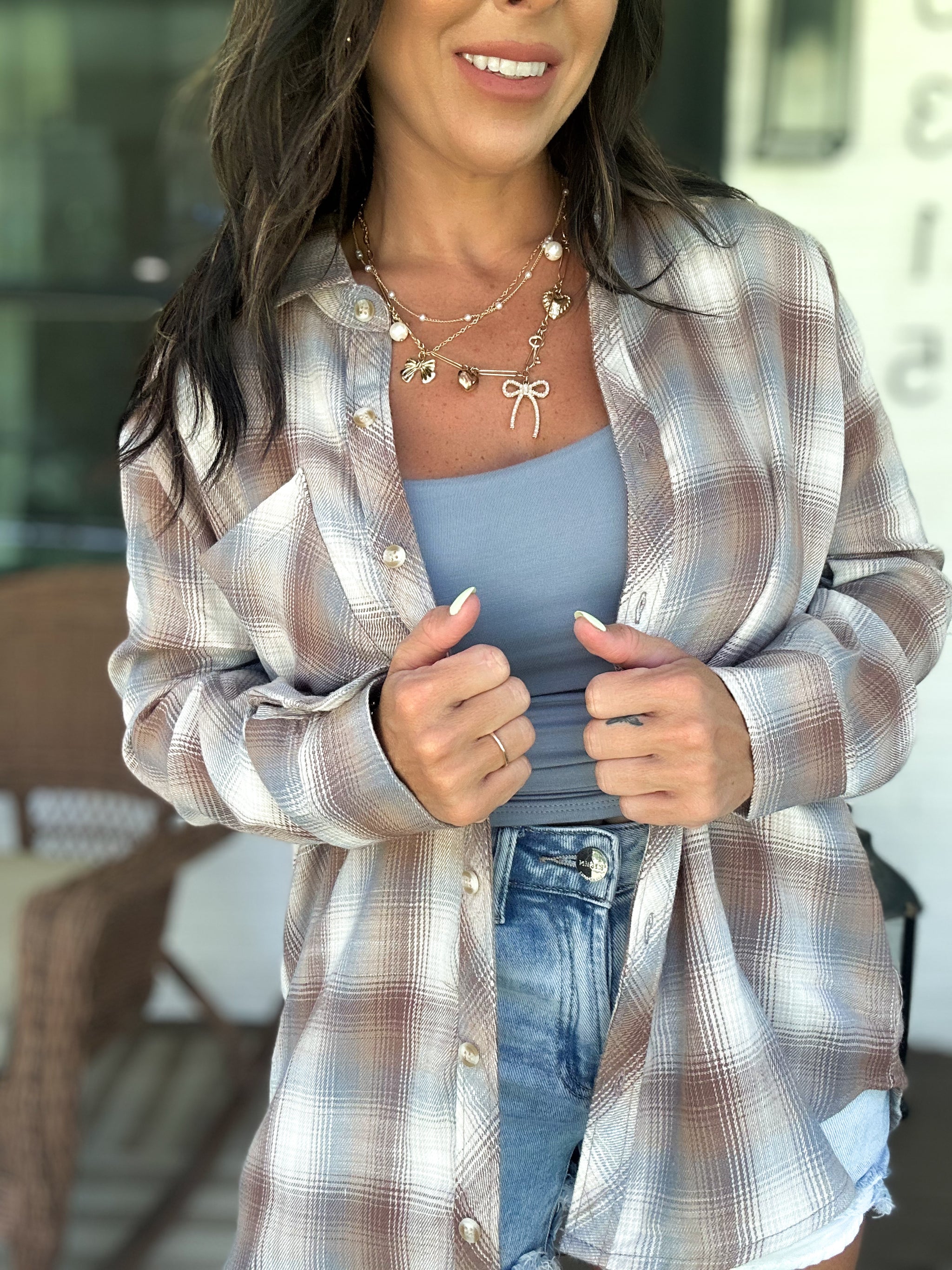 – Sold OutGet cozy in the Cambell Plaid Button Down Top! This ultra-soft, oversized shirt features a classic plaid pattern, a relaxed fit, and a playful drop shoulder design. With long sleeves, a collared neck, and a handy chest pocket, it’s perfect for layering through fall, winter, and autumn. The side slit and round hem add a fun twist, while the below-hip length keeps you comfy and stylish all day long.