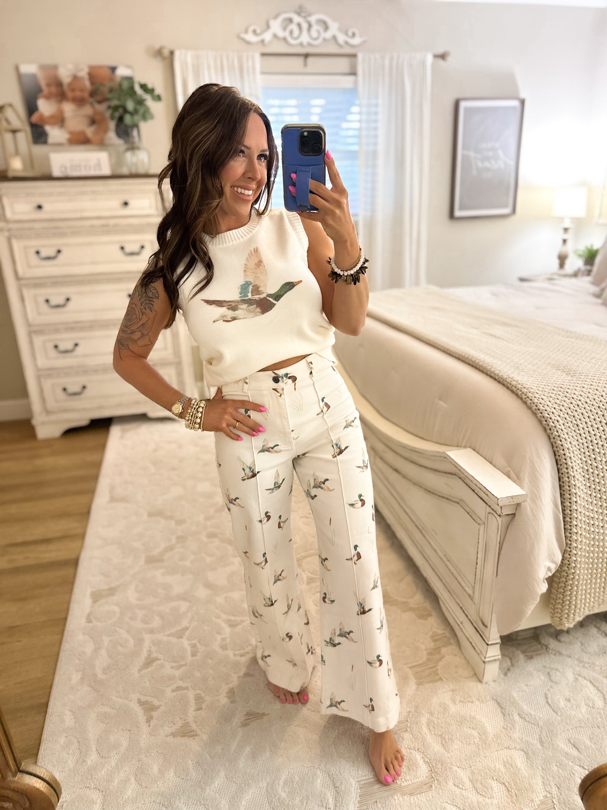 Layer with ease in this mallard duck printed sweater vest, crafted from soft-touch fabric that feels as refined as it looks. The sleeveless design pairs seamlessly over long-sleeve tees or collared shirts, while the relaxed fit ensures comfortable all-day wear. Featuring a charming mallard duck artwork print and classic round neckline, this piece brings understated sophistication to your everyday wardrobe.