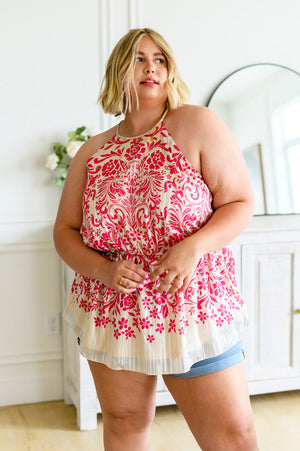 Look and feel amazing in this Fantastic Filigree Peplum Blouse! Adorned with a halter neckline and subtle sheen, this blouse is sure to make a stunning fashion statement. Comprised of a layered sheer striped fabric with a bright print, the peplum silhouette adds a delightful, feminine touch.