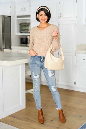 Your daily trip to the coffee shop just got better in the Irish Coffee Knitted Crop V Neck Sweater! Ultra soft, chenille knit shapes this timeless sweater, featuring a v-neckline with drop shoulder long sleeves and a cropped, loose fit bodice. Ribbed detailing lines the cuffs, hem, and neckline.