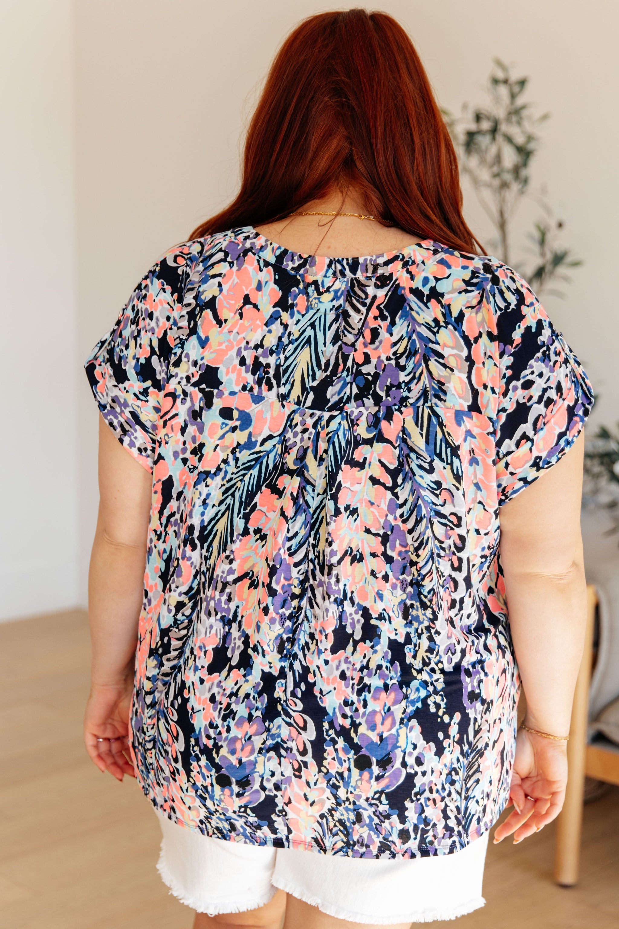– Sold OutRevamp your wardrobe with the Lizzy Cap Sleeve Top in Navy Abstract Floral. Crafted from Bulgari fabric, this top boasts a playful Lizzy neckline and button rolled sleeve tabs for a unique touch. The cap short sleeve and scoop hem bring a hint of flow to this trendy piece. Enjoy both comfort and style with the Lizzy Top.