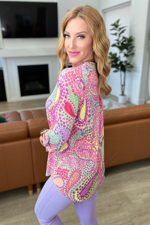 – Sold OutTransform your closet with the Lizzy Top in Green and Pink Paisley. Made from Bulgari, this top features a gabby neckline and button rolled sleeve tabs for a comfortable, yet eye-turning piece. The 3/4 sleeve and scoop hem add flow to the already stylish piece. Experience comfort and style in one with the Lizzy Top.