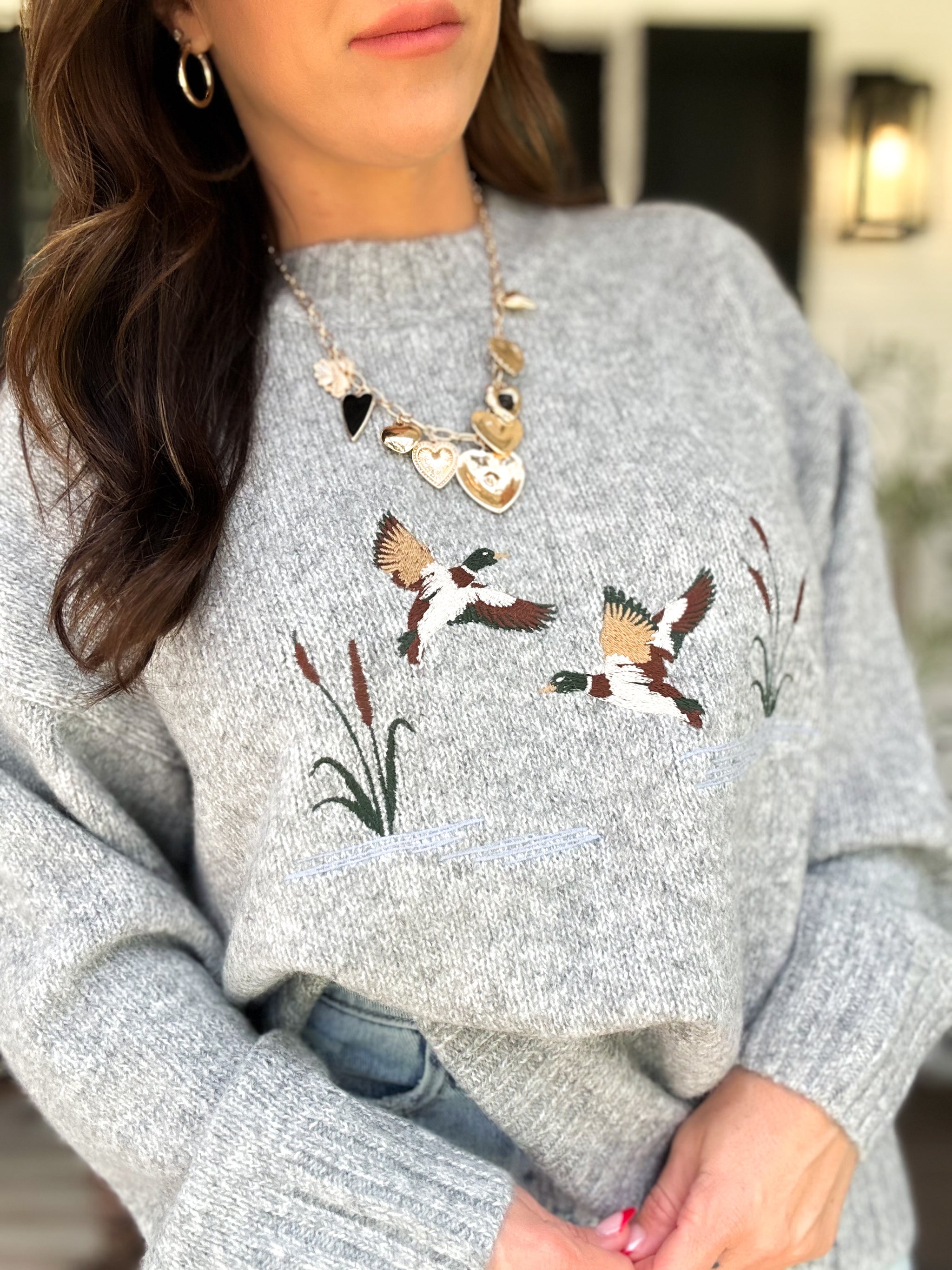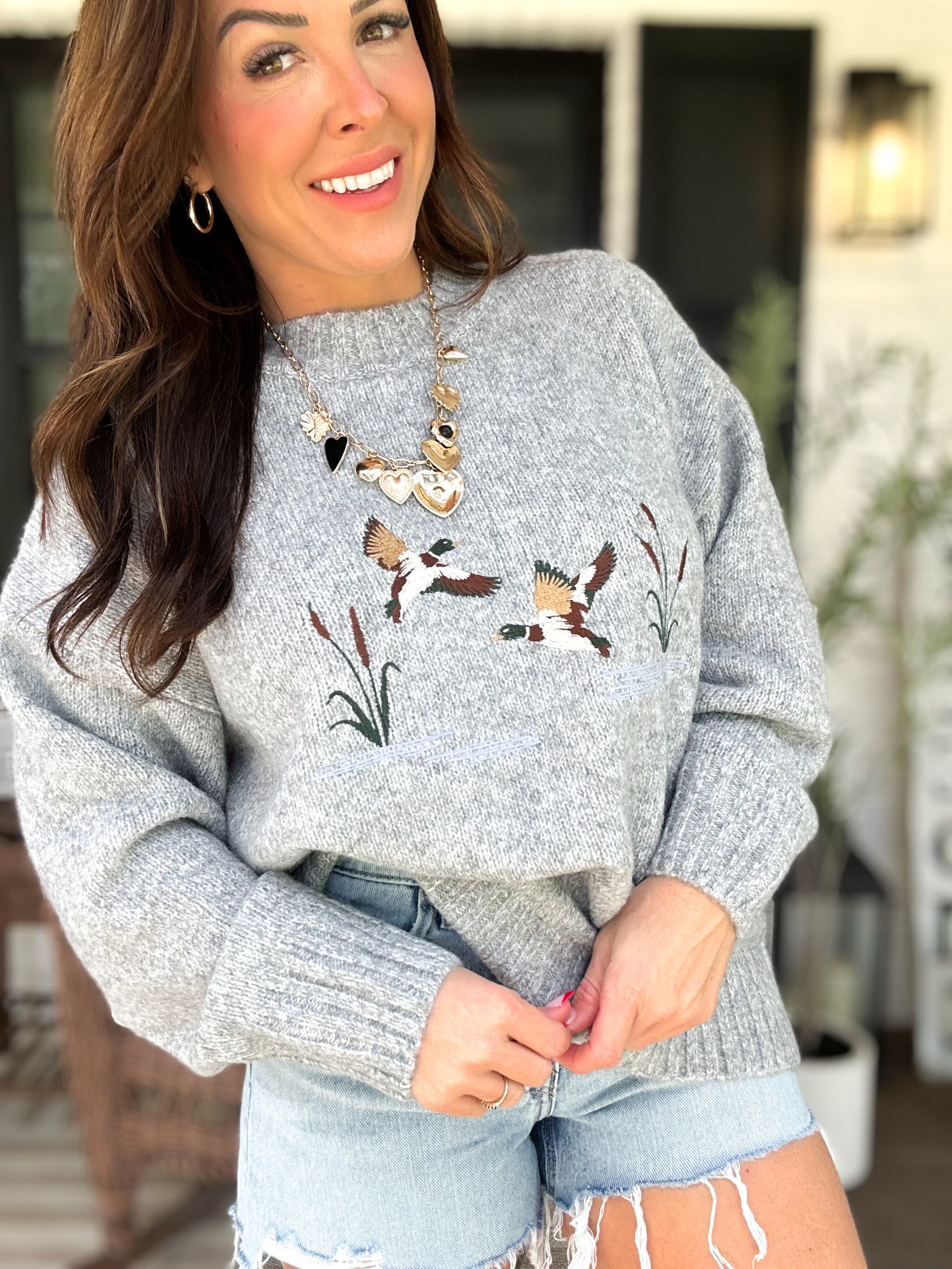 Embrace your quirky side with this charming heather gray knit sweater, featuring an adorable embroidered duck that's sure to spark conversations. Crafted from soft, comfortable knit fabric, it's perfect for casual days when you want to add a touch of whimsy to your wardrobe. The playful duck design brings personality to any outfit, making it an instant favorite for those who appreciate a little fun in their fashion. Cozy, cute, and unapologetically you.