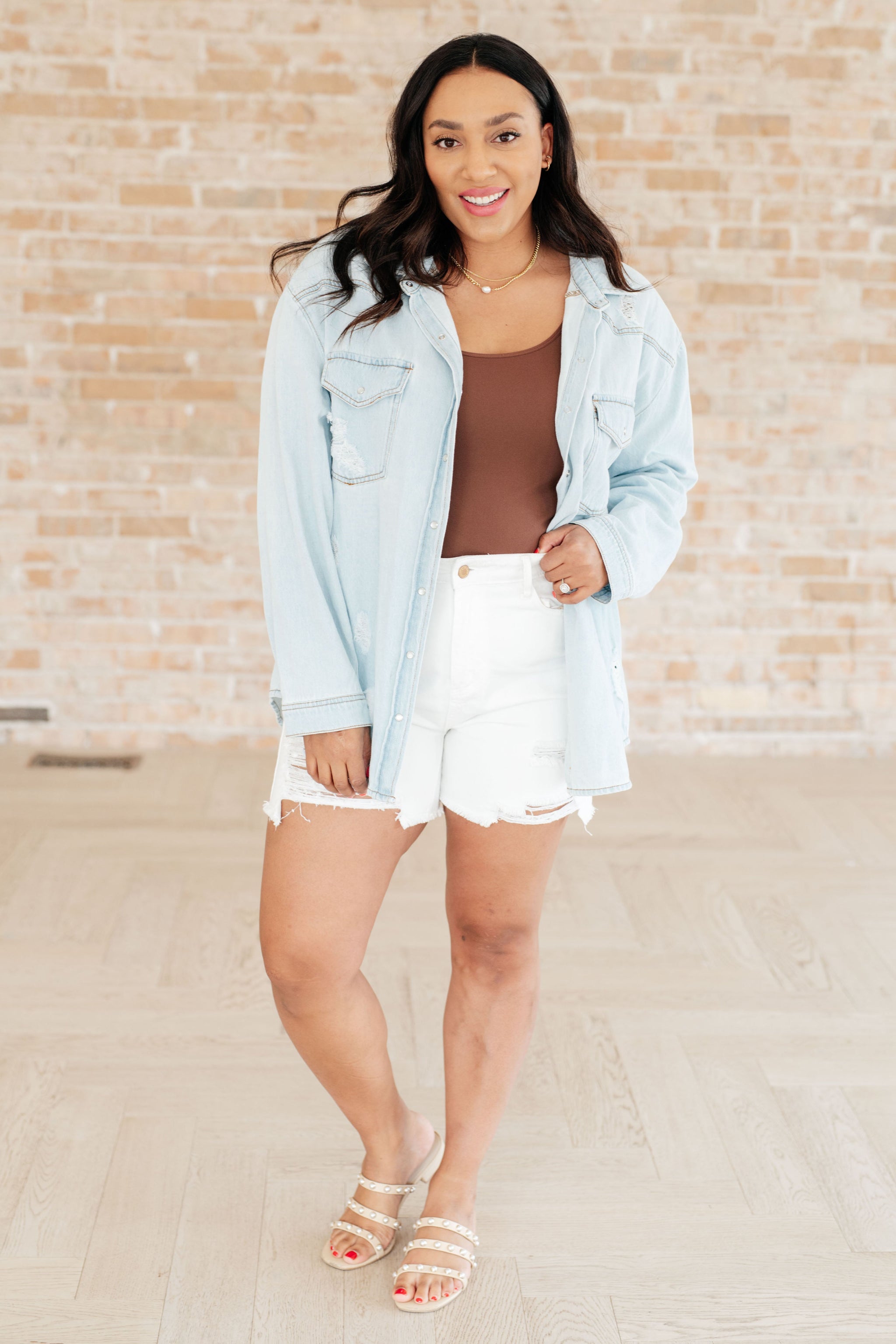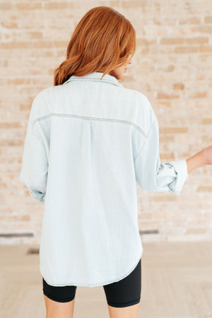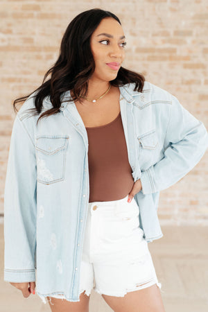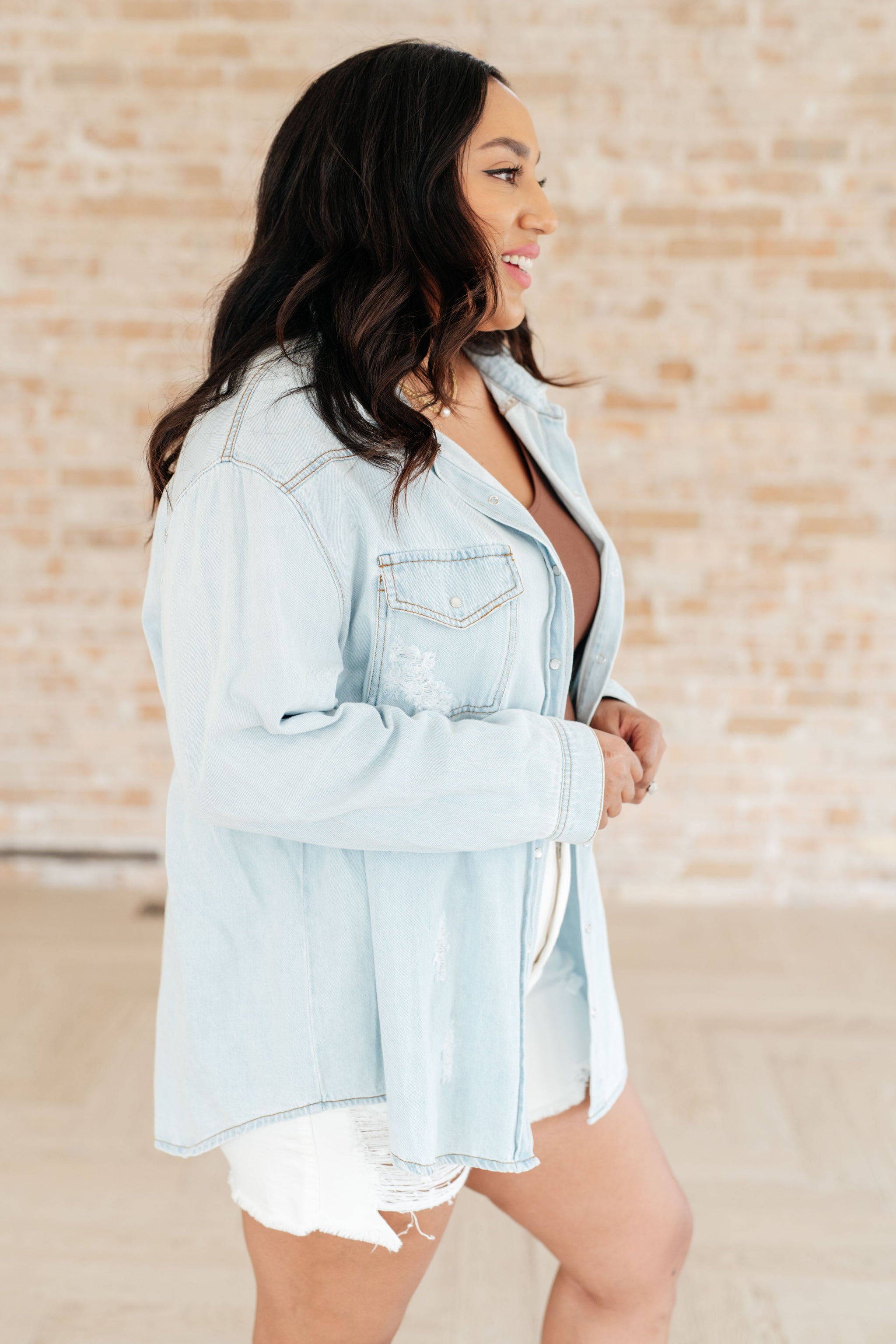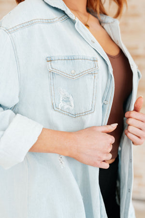 – Sold OutYou hear that? That's the "oohs" and "ahhs" from My Walkman Denim Shacket. Crafted with lightweight denim and featuring a collared neckline, this shacket adds a touch of edge to any outfit. The faux pearl snap closures, front patch pockets, and distressed detailing add unique touches, while the banded sleeve cuffs and scooped hem provide a comfortable and flattering fit. Upgrade your wardrobe with this versatile and stylish piece.