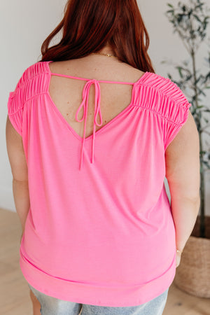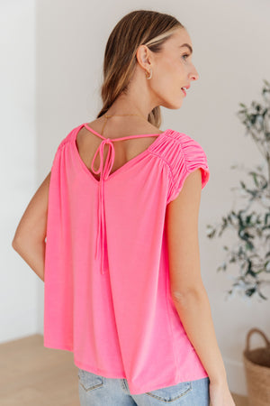 – Sold OutEffortlessly cool and playful, our Ruched Cap Sleeve Top is a must-have addition to your wardrobe. The gathered elastic shoulders and tie back create a relaxed fit, while the bulgari fabric keeps you cool and wrinkle-free. Perfect for a casual day out or a fun night in.