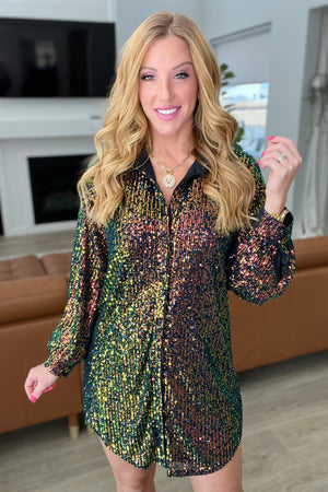 – Sold OutThis Shimmering Splendor Sequin Shirt Dress is the perfect statement piece for any occasion. Featuring a collared neck, long sleeves and buttoned cuffs, you can feel confident that you'll look fabulous. The sequins give you an eye-catching shimmer that will make you shine brighter than anyone else in the room.
