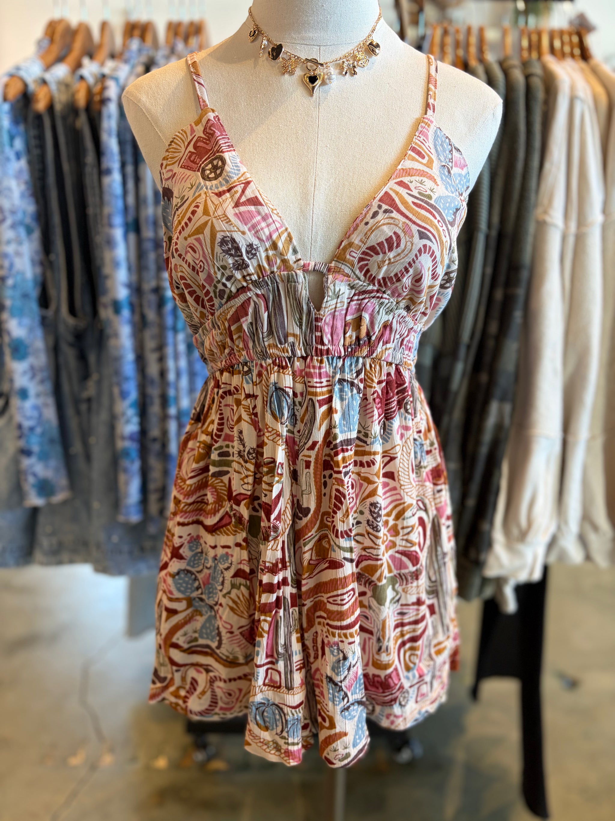 Western Nights Open Back Romper Embrace effortless style with this striking open-back romper, designed for those who appreciate bold fashion statements. The delicate spaghetti straps frame the shoulders while the dramatic cutout back creates an eye-catching silhouette perfect for evening events or upscale casual outings. Western-inspired prints add character and visual interest, making this piece a versatile addition to any wardrobe. The romper's streamlined fit offers comfort without sacrificing sophistication, ideal for transitioning from day to night with confidence and flair.