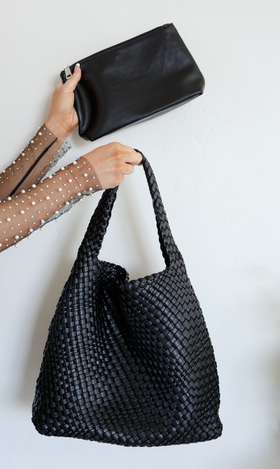 – Sold OutElevate your everyday style with this stylish Woven and Worn Tote! Crafted from vegan leather with a basket weave, this fashionable hobo style bag radiates chic, confident style. Plus, the matching zippered clutch is the perfect complement for days when you're on the go. Elevate your fashion with this amazing two-piece set!