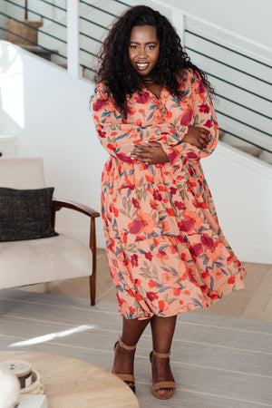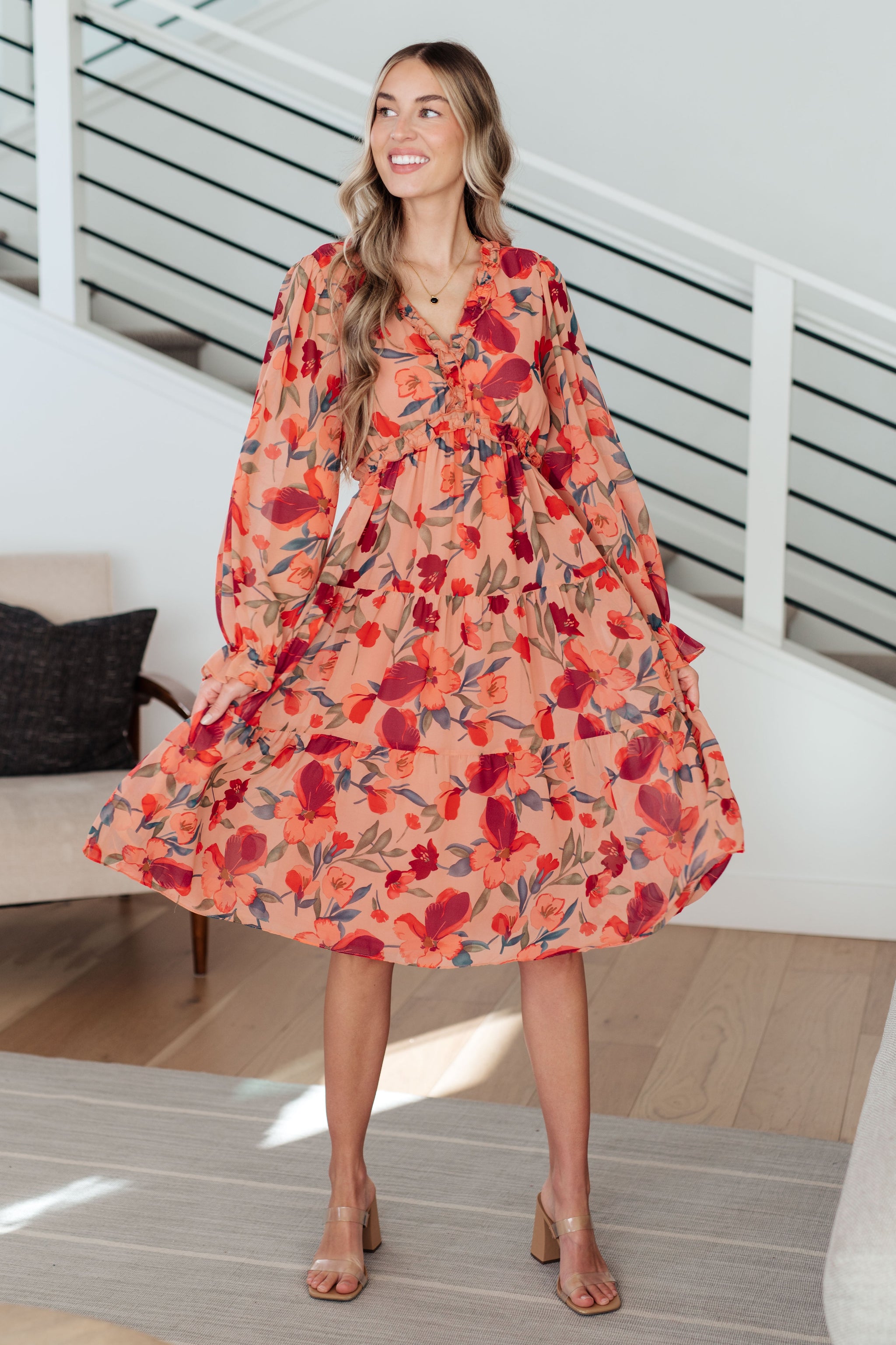 – Sold OutLook oh-so-chic in the You And Me Floral Dress! Featuring a flattering ruffled v-neckline, long sleeves, and a gorgeous floral print chiffon, this dress will make you feel beautiful in every way. The tiered skirt and midi-length silhouette create an ultra-flattering look to complement any occasion.
